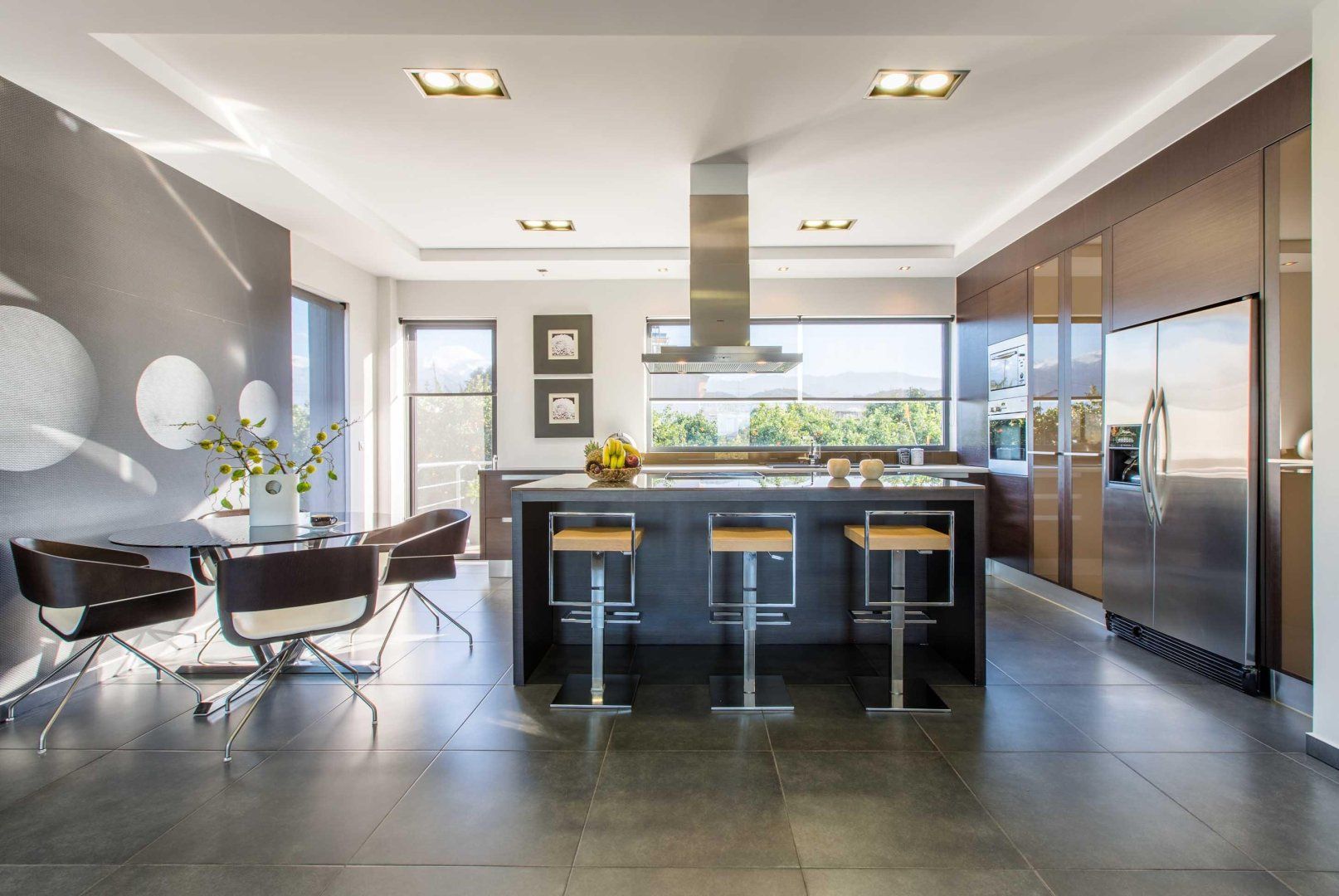 What's perhaps most surprising is the home's interior, which wouldn't look out of place in an ultra-modern city apartment block. The design is dominated by clean lines, sleek surfaces and rich wooden furnishings. The huge kitchen is sure to appeal to guests with culinary talent — although the host offers the option to hire a private chef as well.