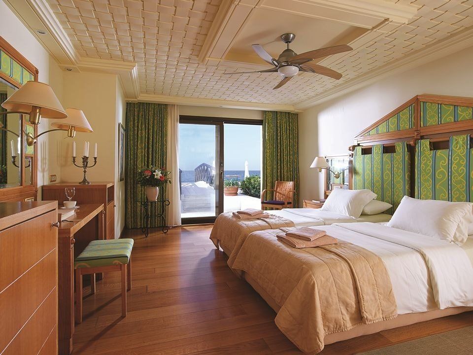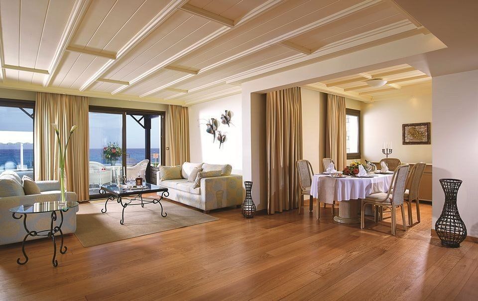 Situated in the Hersonissos region of Crete, this spacious suite with stunning seafront views and manicured lawns is ideal for a small family or two couples. You'll be sharing the swimming pool with guests from the neighboring villas but will have access to a private section on the beach, as well as your own furnished balcony where you can enjoy an evening tipple from the free mini-bar. Guests will also receive a welcome package on arrival that includes wine, fresh fruits, and a selection of tasty canapés. The one-time Roman port of Hersonissos is a short walk away from the villa and offers lots in the way of architecture, restaurants, and shops.