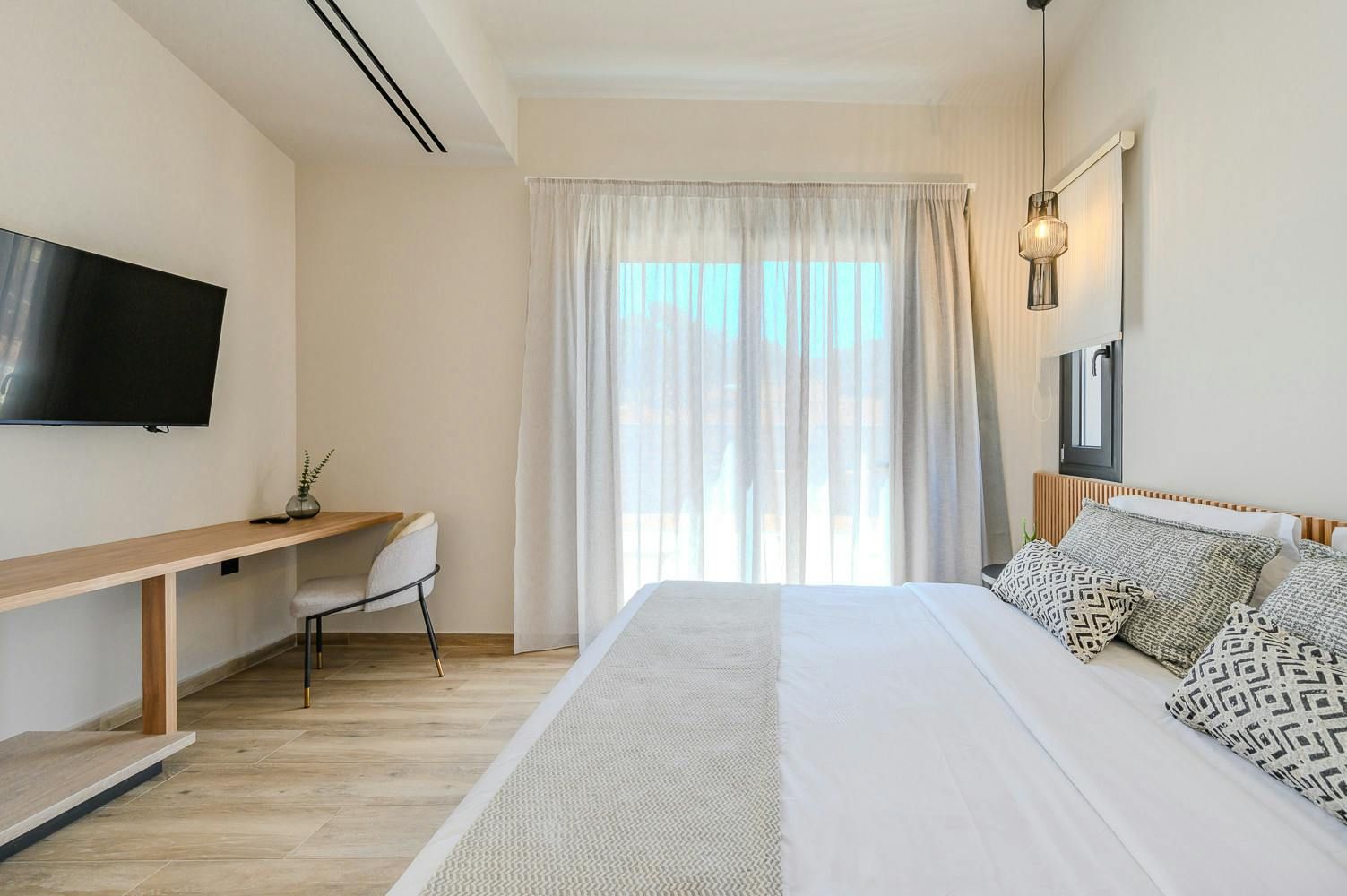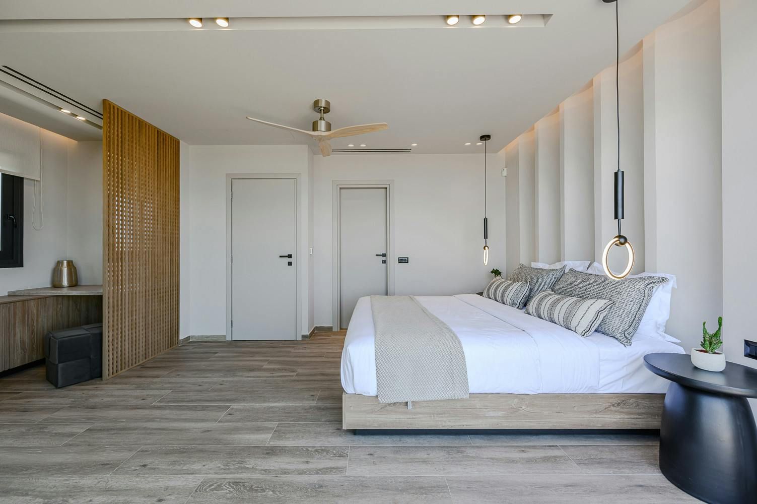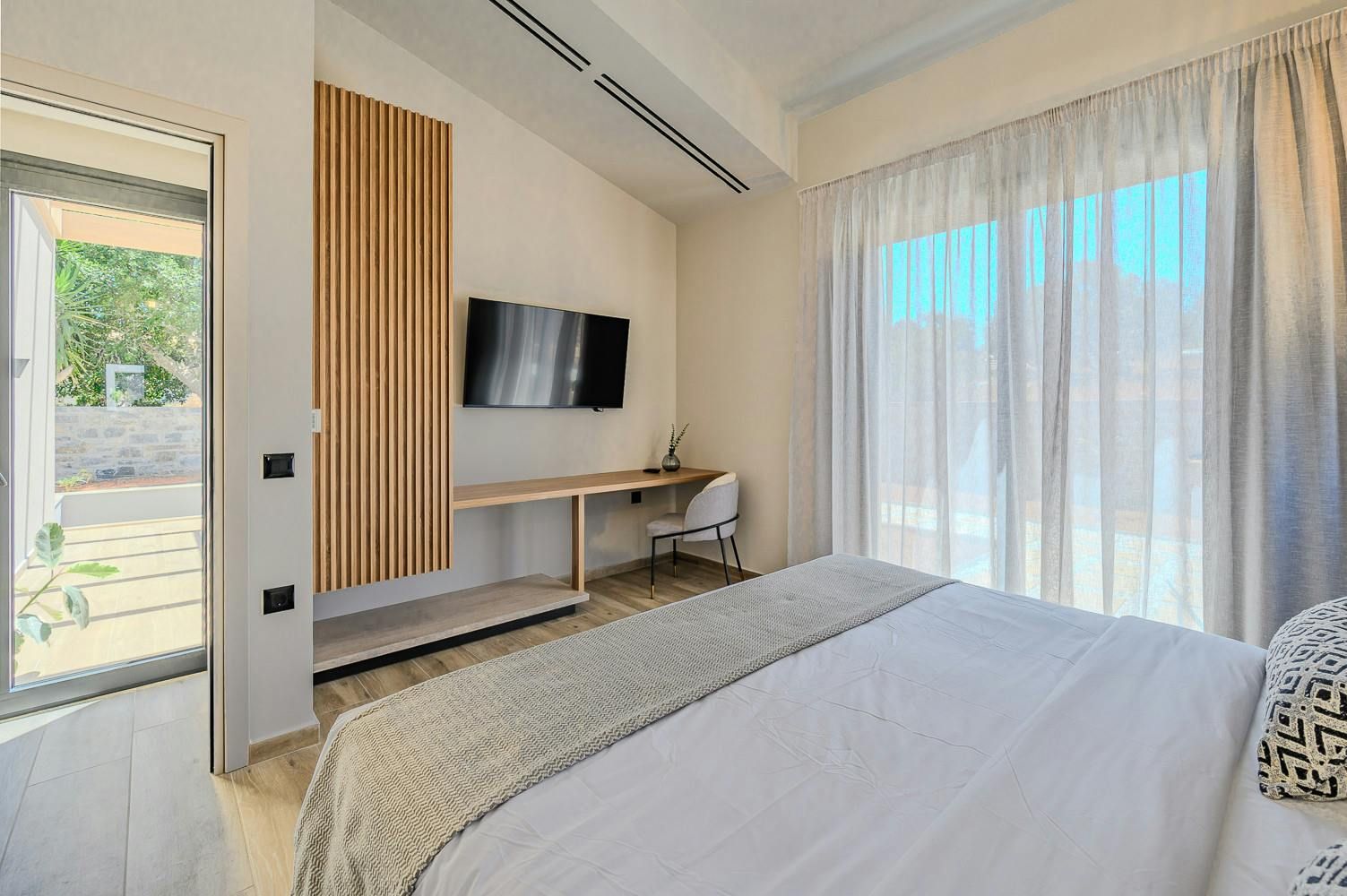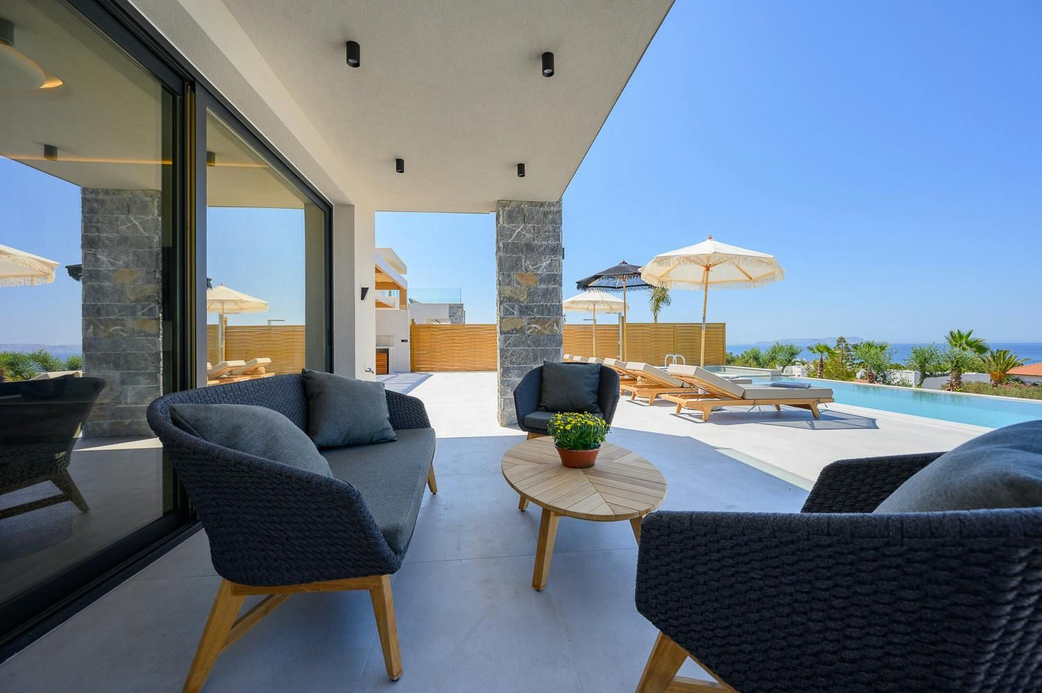 Thanks to its hillside position, this modern villa boasts knockout views of the Sea of Crete. Choose to savour the vistas from the dining terrace or perhaps from the comfort of a poolside lounger. When dusk falls, we recommend heading up to the main bedroom’s private balcony with a chilled glass of raki in hand. In terms of what’s on your doorstep, there’s a restaurant just a five-minute walk away, and Anissaras Main Beach is one kilometre down the road. While walkable, it's more comfortable to drive or take a taxi, especially in the height of summer.