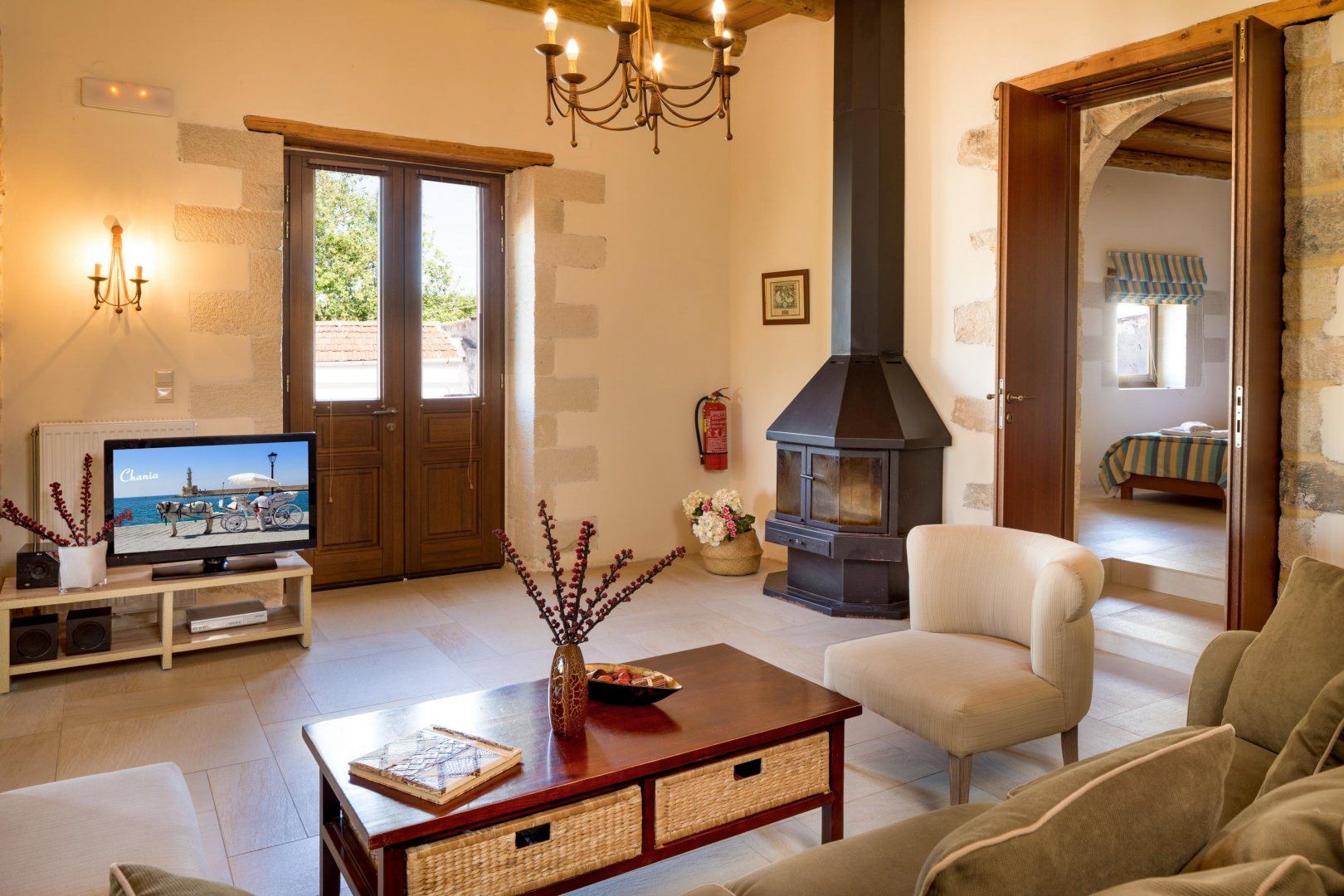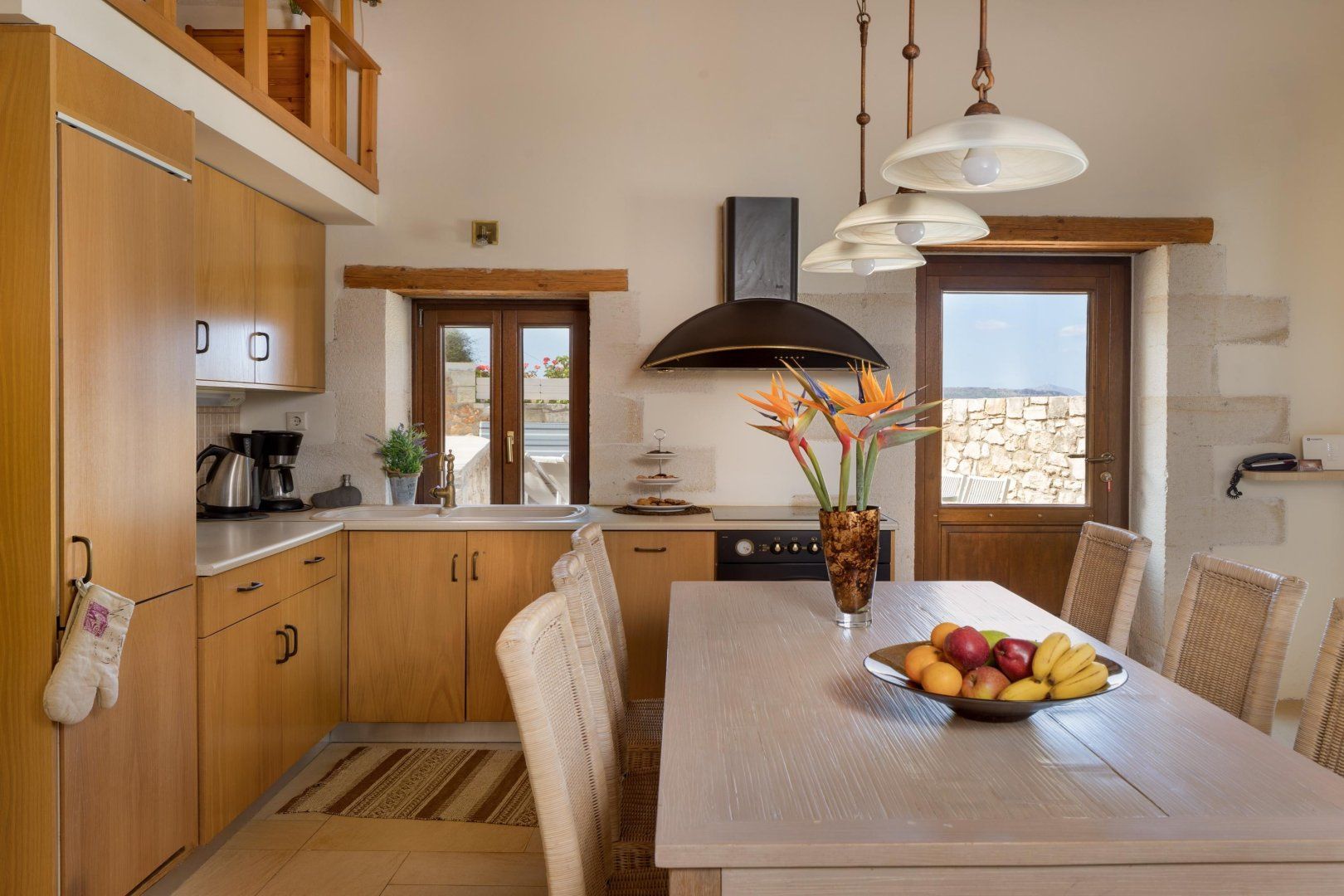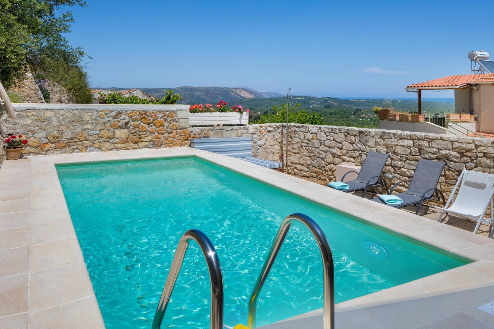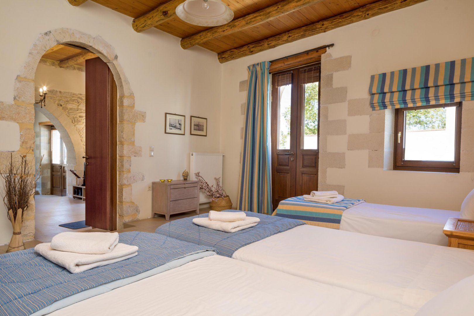 The villa mixes exposed stone walls, spectacular archways and stunning timber ceilings so typical of Cretan construction, with a well-equipped kitchen, beautiful bathrooms and a gorgeous outdoor pool. It's a clever combination of traditional construction (to fit in with neighbouring buildings) and modern convenience that creates a desirable package. A rooftop terrace with far-reaching views over the surrounding landscapes towards the Bay of Souda is just the cherry on top.