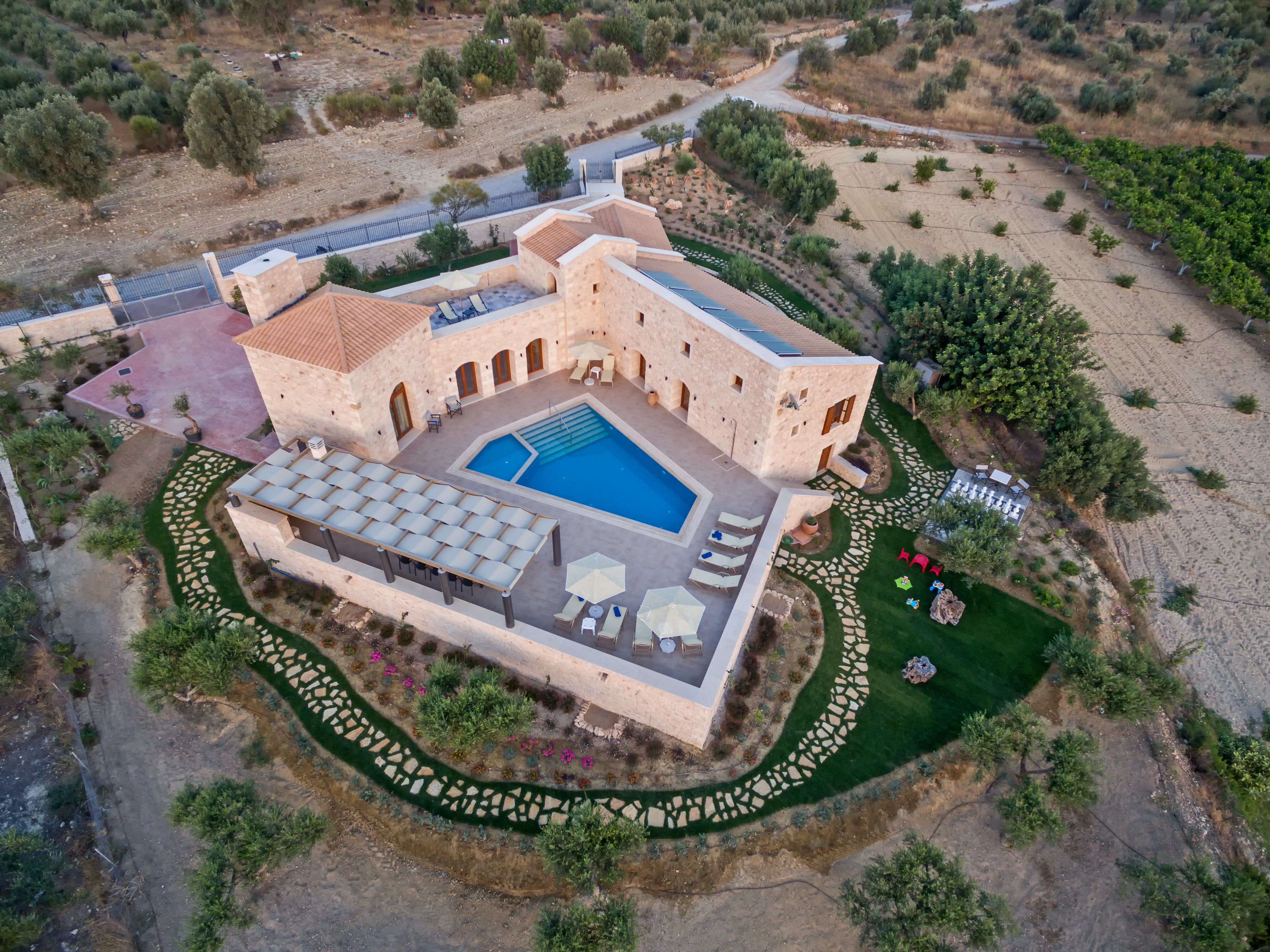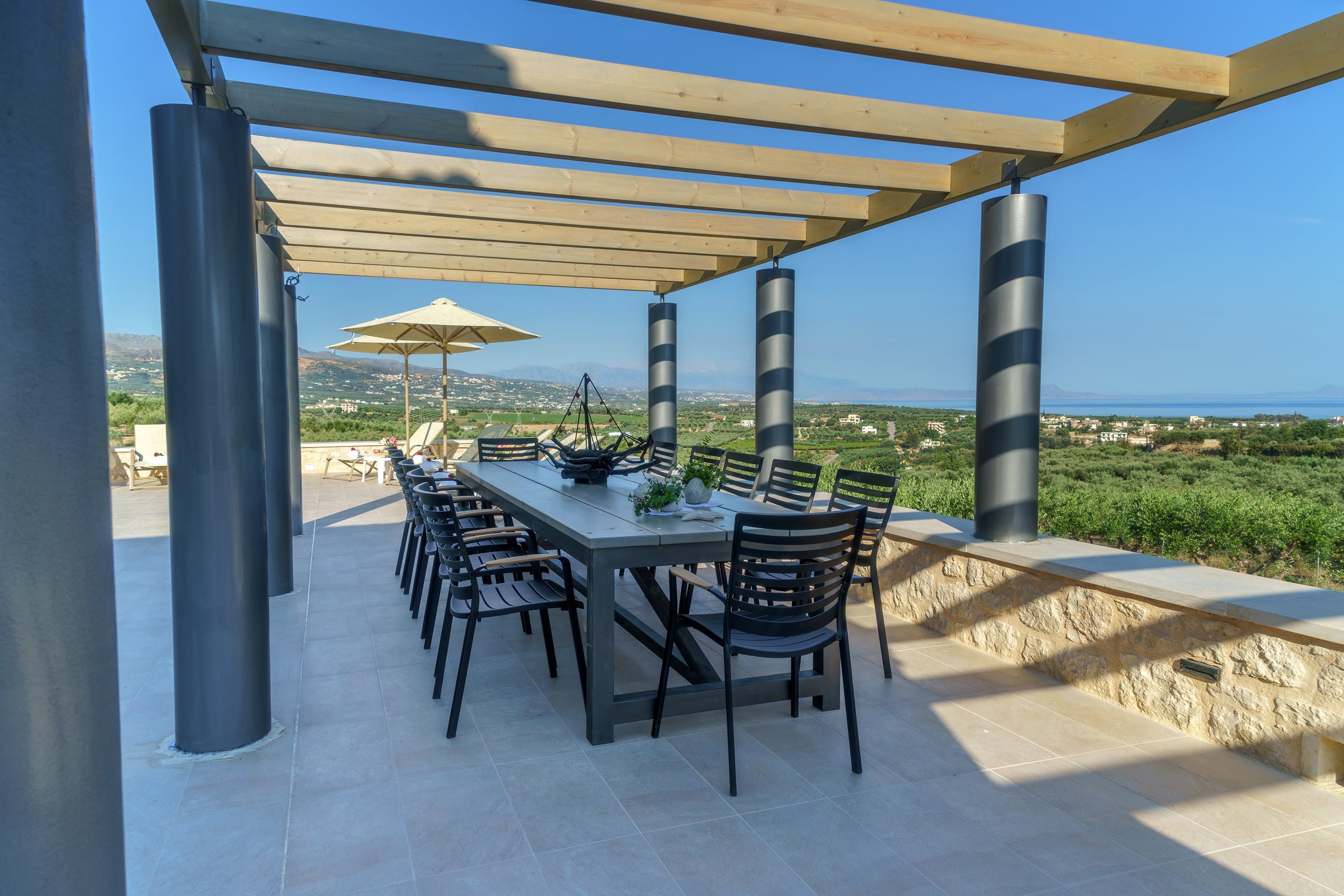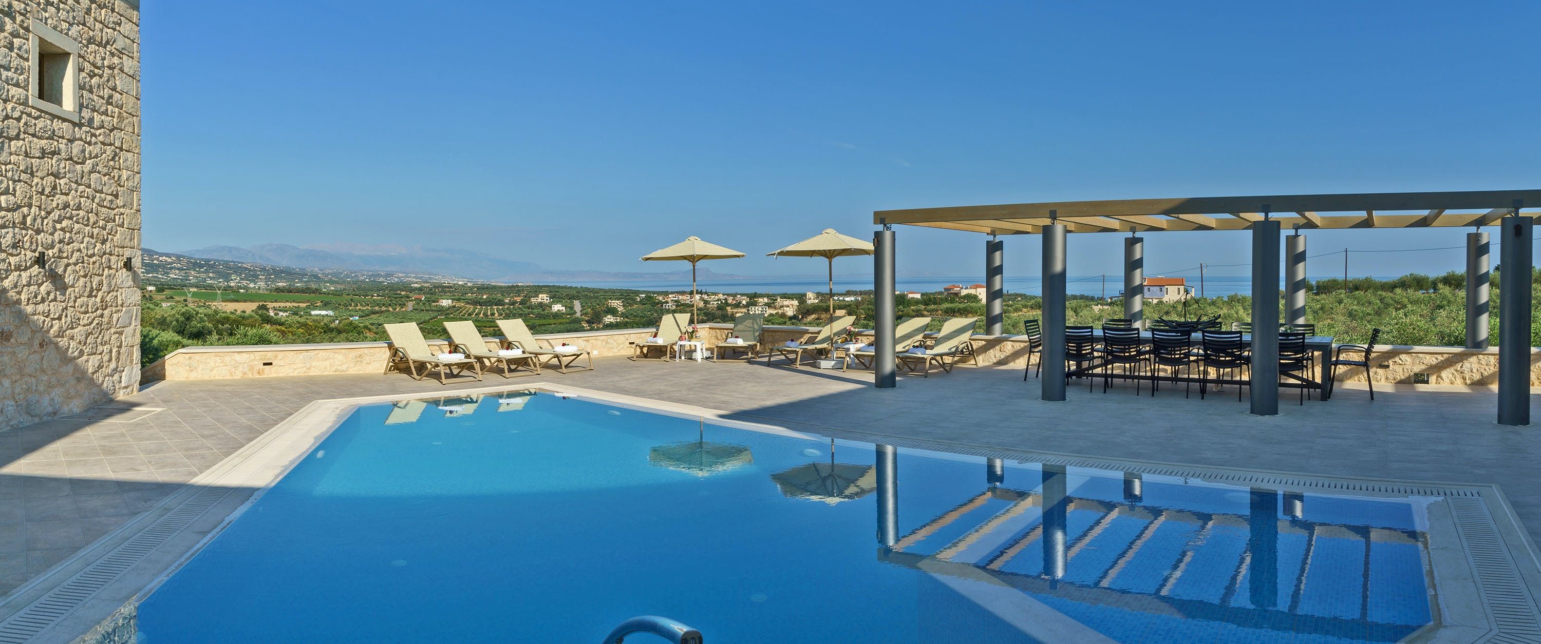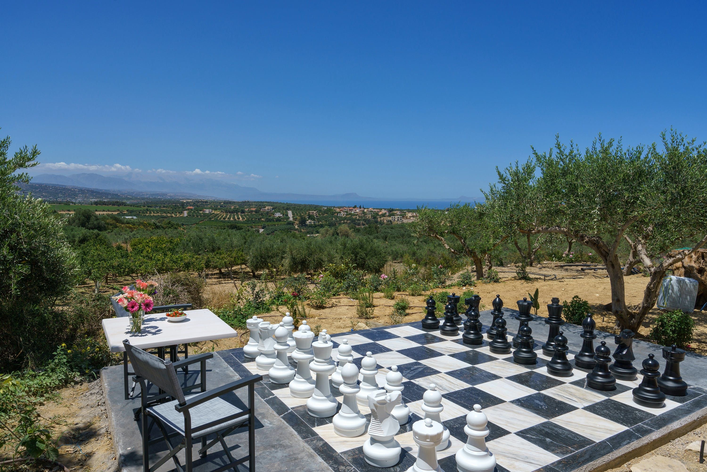 Boasting a dreamy outdoor pool and stunning views of the Mediterranean Sea, this is the perfect place to unwind with friends or family, situated in a gorgeous two-acre plot with plenty of space for eating, drinking, and being merry with your fellow guests. Spend all day exploring the grounds, unleash your competitive side with a game of oversized garden chess, or beat the heat with a dip in the pool and a traditional Greek dinner at the regal dining table. Whatever your mood, this place has got you covered.