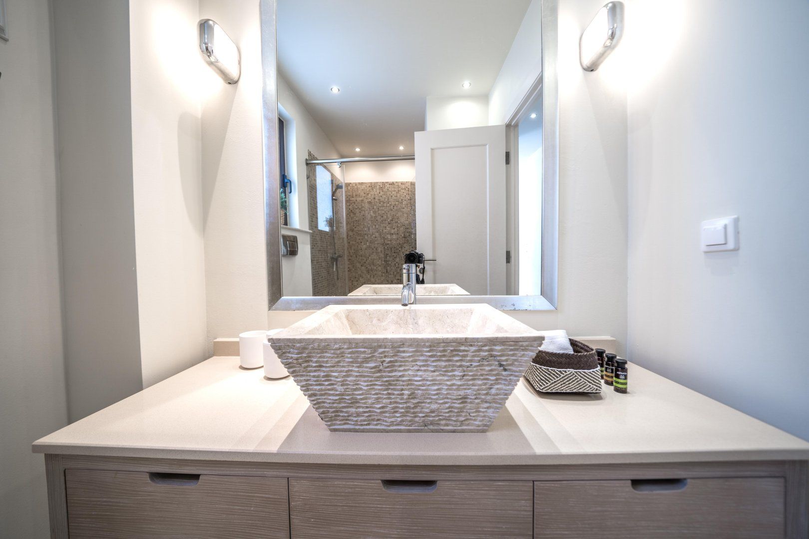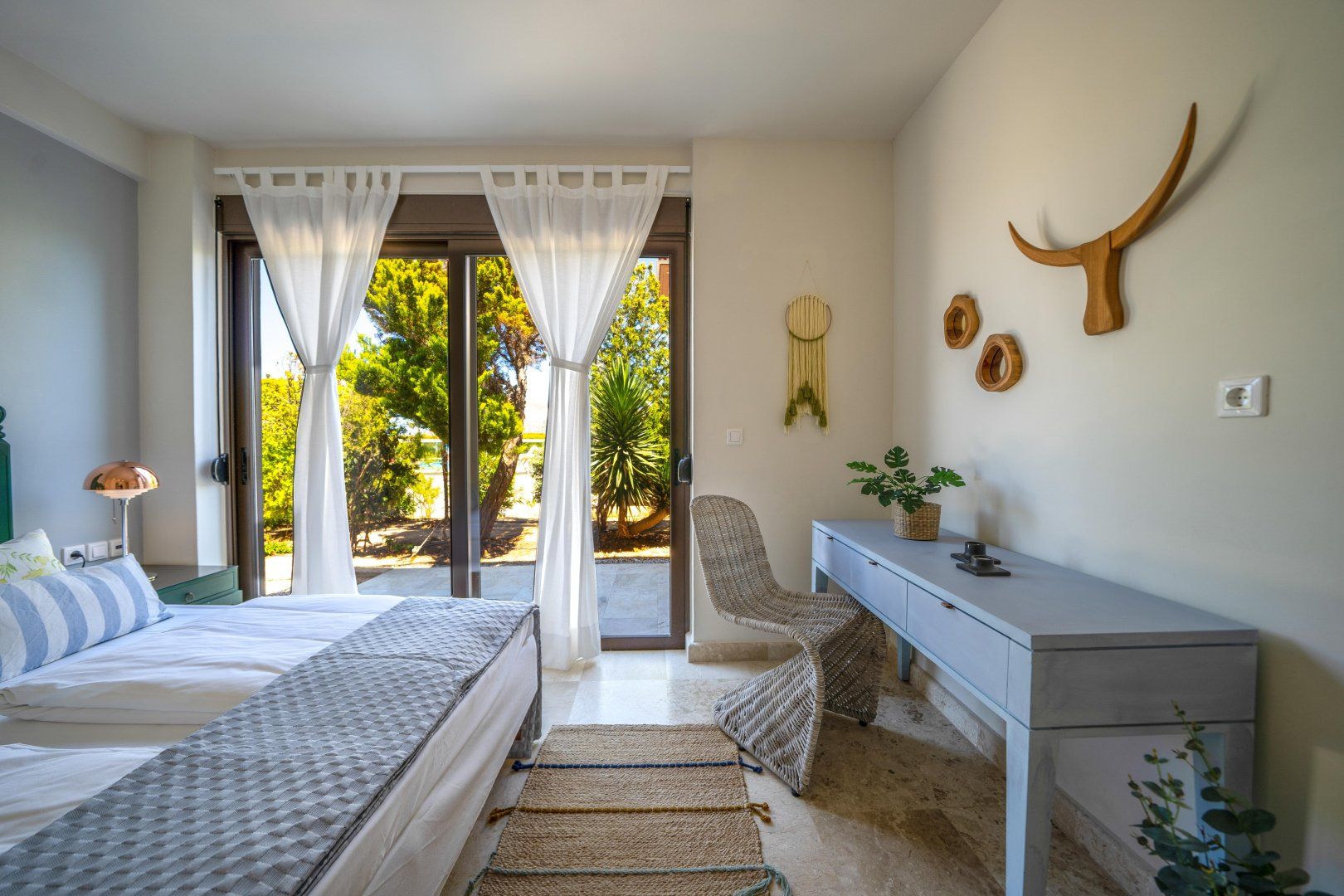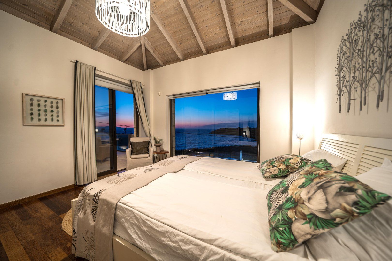 Inside, you’ll feel how much detail has gone into the design. Luxury touches are everywhere – ambient lighting fixtures, stone floors and natural, minimalist furniture pieces. Wake up in your plush bed, sip your morning coffee and watch the waves roll out through your floor-to-ceiling glass doors. The light-filled interior is completely modern in style – it’s the ideal spot for shaded quality time. We love the elegant dining area for leisurely breakfasts, whilst the large sofa is the perfect spot to take a siesta when you want a repose from the midday sun.