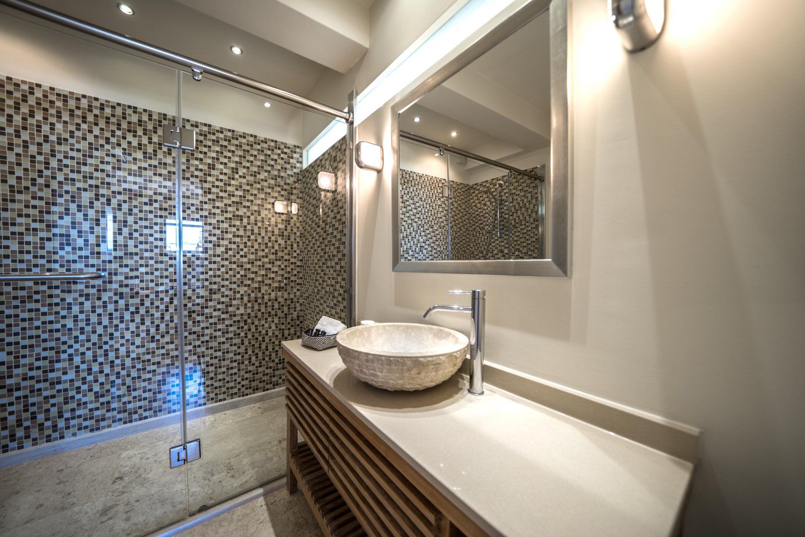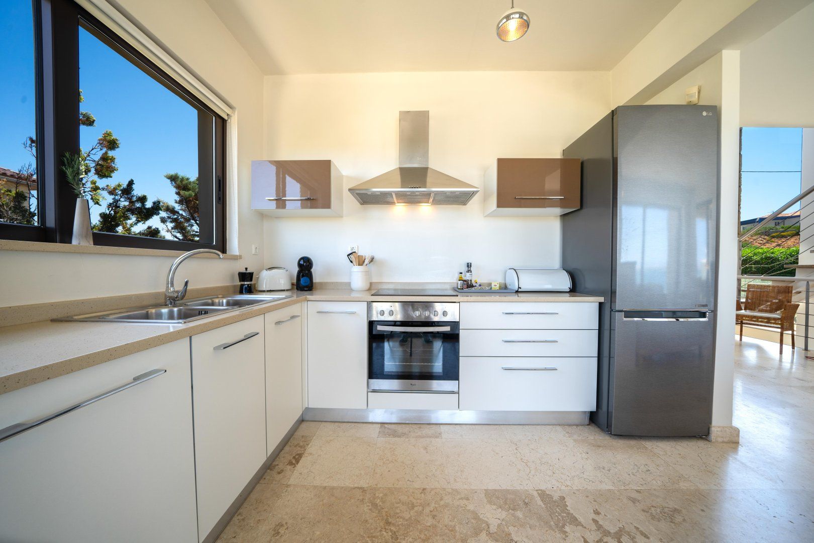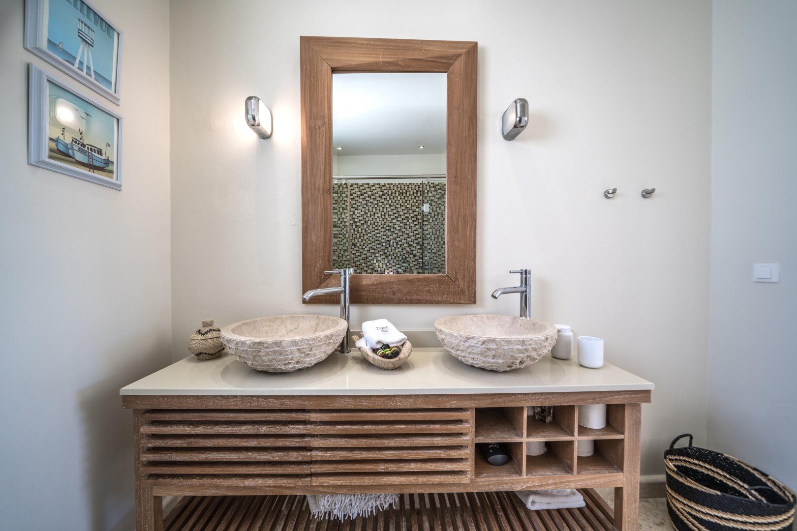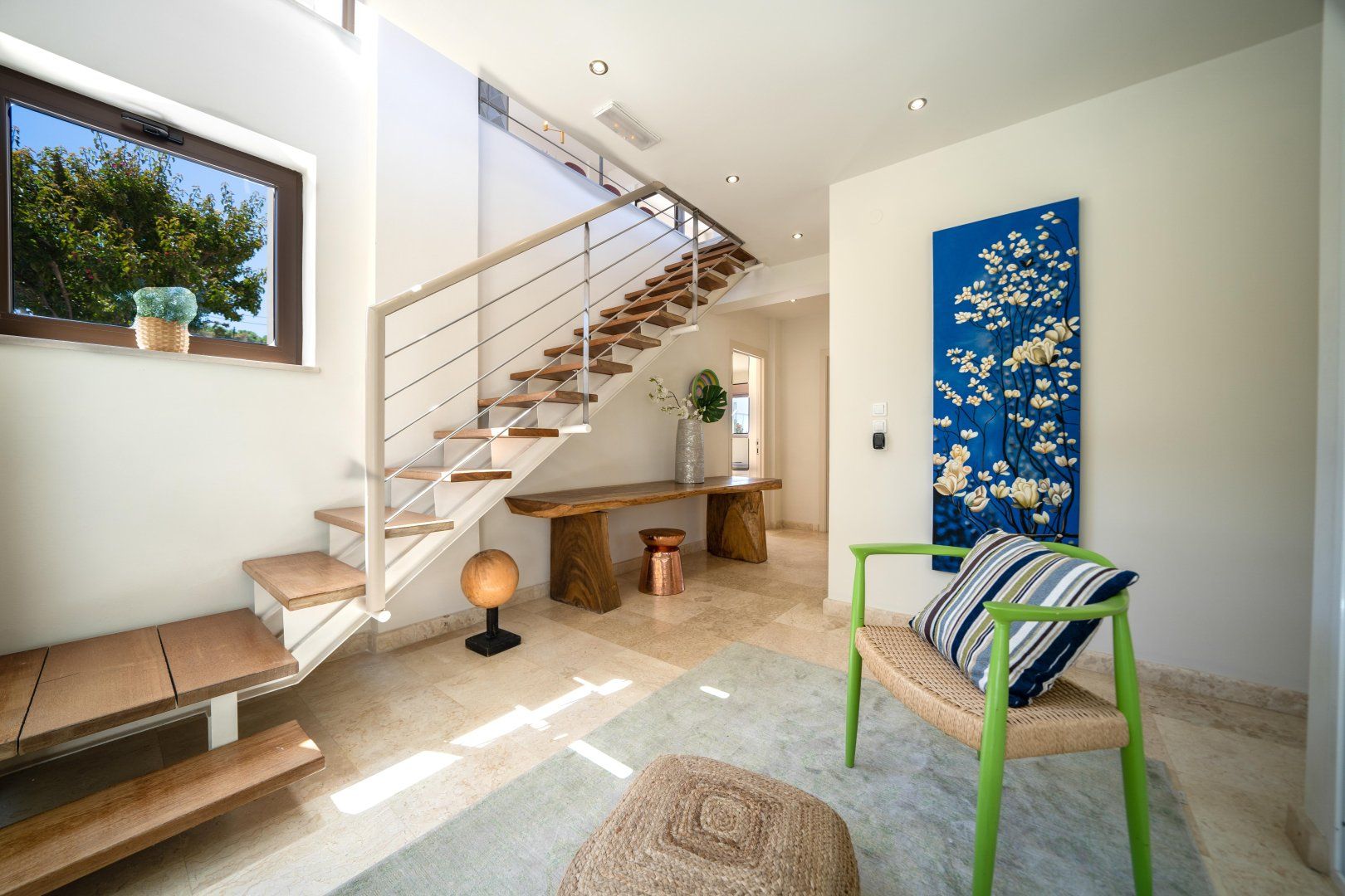 Inside, you’ll feel how much detail has gone into the design. Luxury touches are everywhere – ambient lighting fixtures, stone floors and natural, minimalist furniture pieces. Wake up in your plush bed, sip your morning coffee and watch the waves roll out through your floor-to-ceiling glass doors. The light-filled interior is completely modern in style – it’s the ideal spot for shaded quality time. We love the elegant dining area for leisurely breakfasts, whilst the large sofa is the perfect spot to take a siesta when you want a repose from the midday sun.