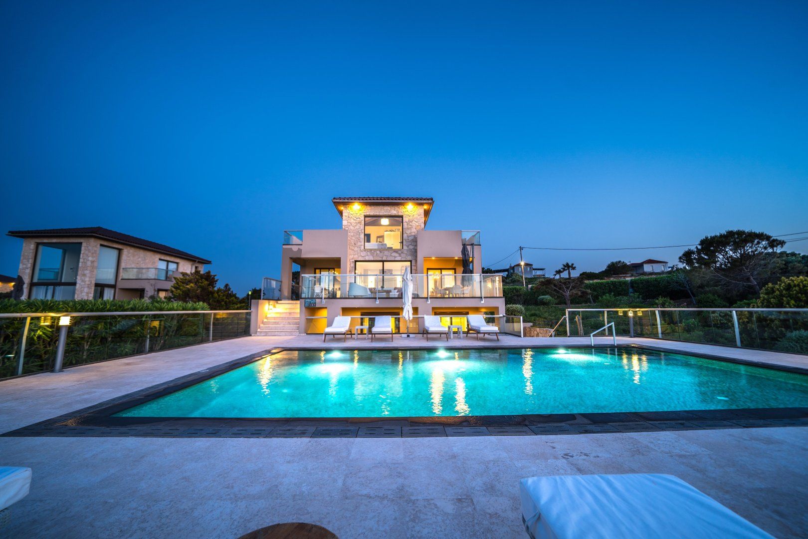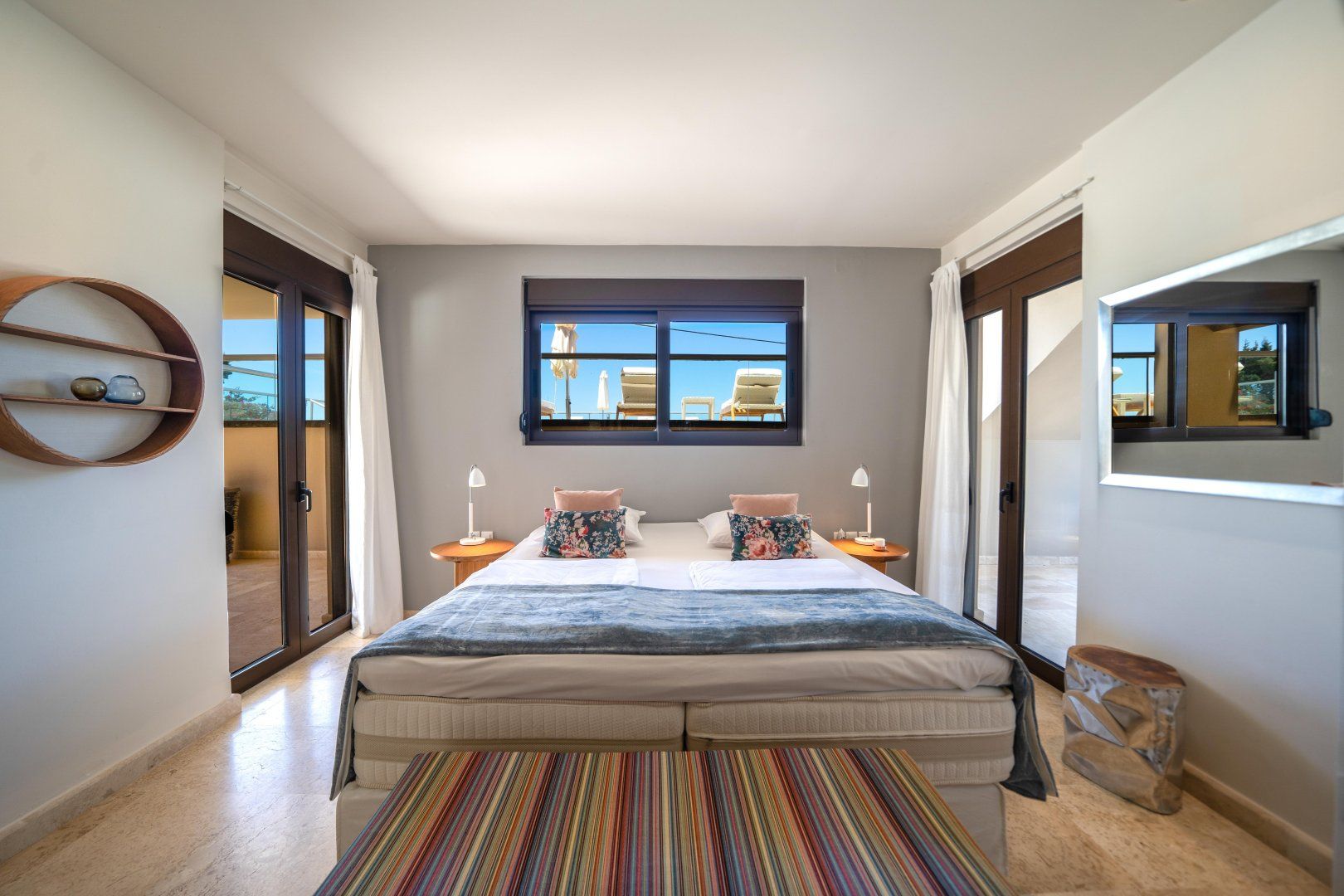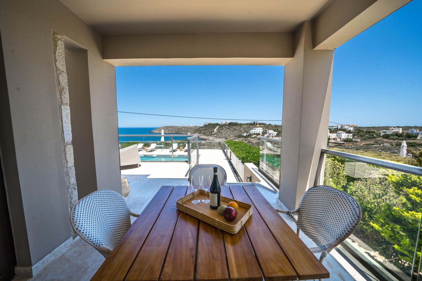Luxury carries through to the outside here – with warm natural stone terraces and soft daybeds to lounge on, absorb the island sun and get into your new summer read. Play a few games of tennis on the shared courts, then tuck into a fresh Grecian lunch at the outdoor dining table.