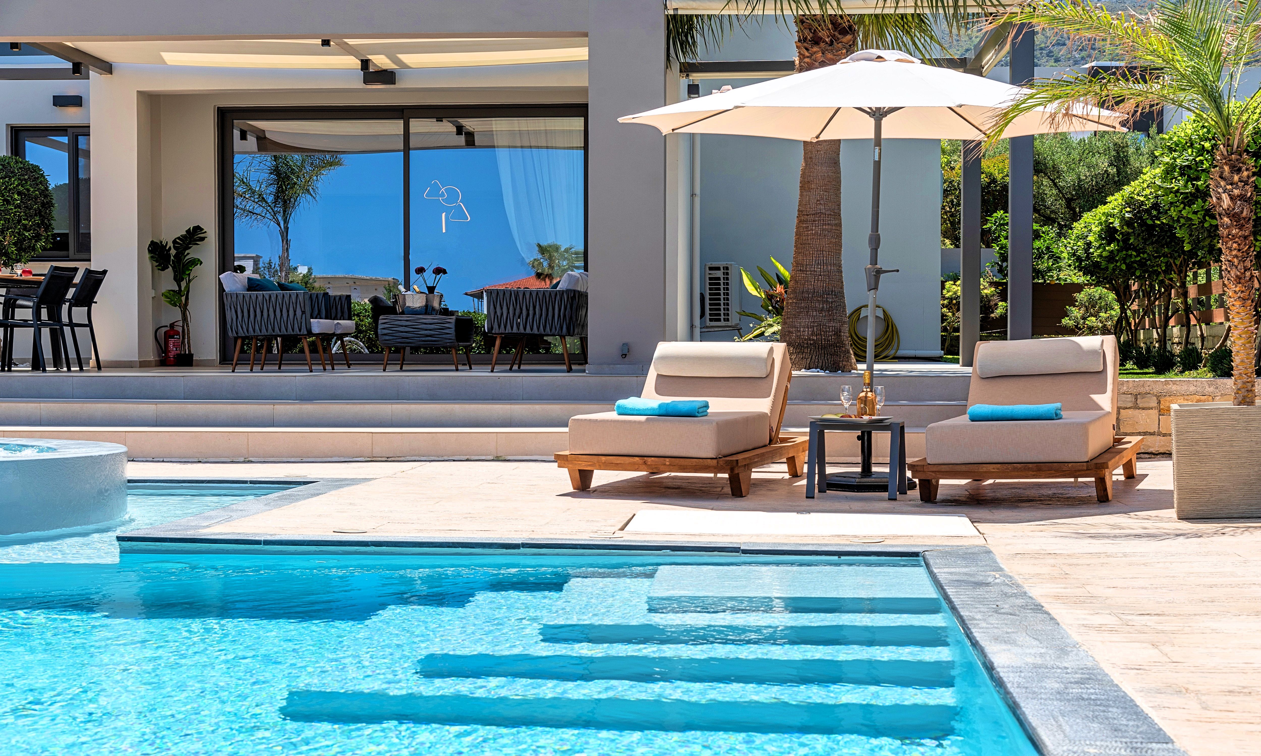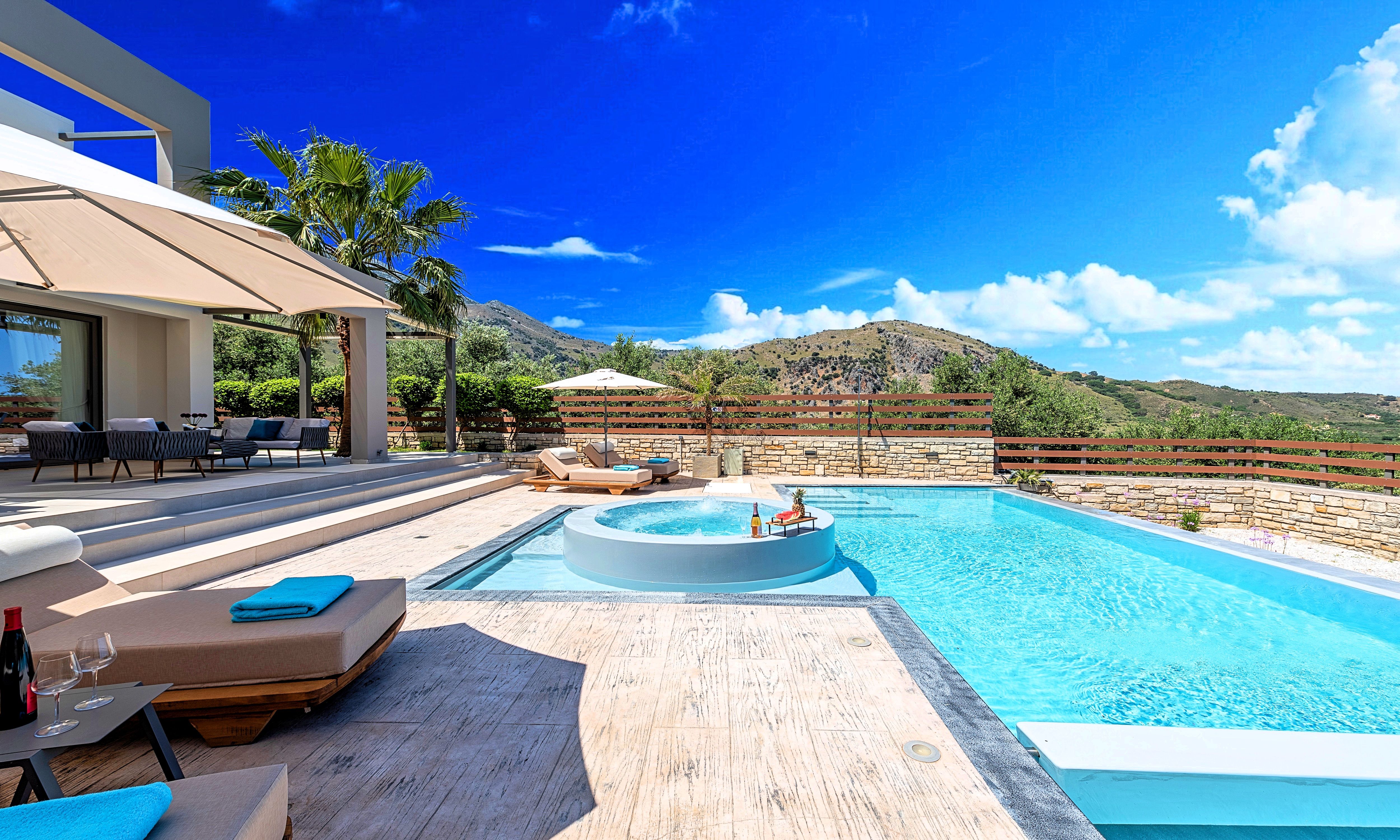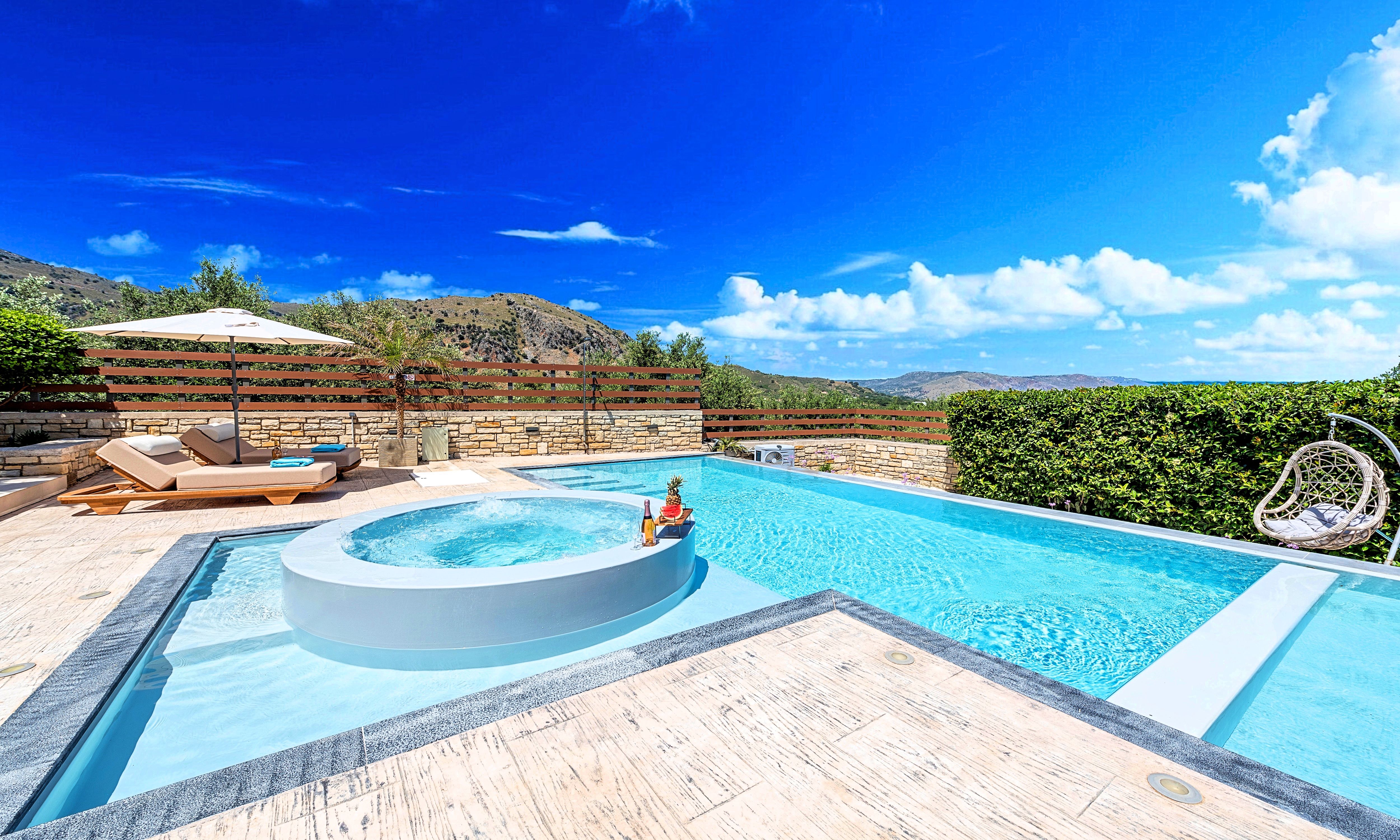 Nestled in the countryside, surrounded by mountains, this villa captures the laid-back Cretan lifestyle. A scenic stroll through ancient olive groves brings you to the shores of Lake Kournas, where you can rent pedalos or picnic on the sand, while the sea is just a few minutes’ drive away. Inside, it’s bright and contemporary, with an open-plan living area that flows onto a terrace with a lounge, alfresco dining, and a swimming pool with a built-in hot tub. Fire up the barbecue for feasts under the stars, or wander down to one of the local tavernas to sample freshly caught fish and traditional Greek mezze.