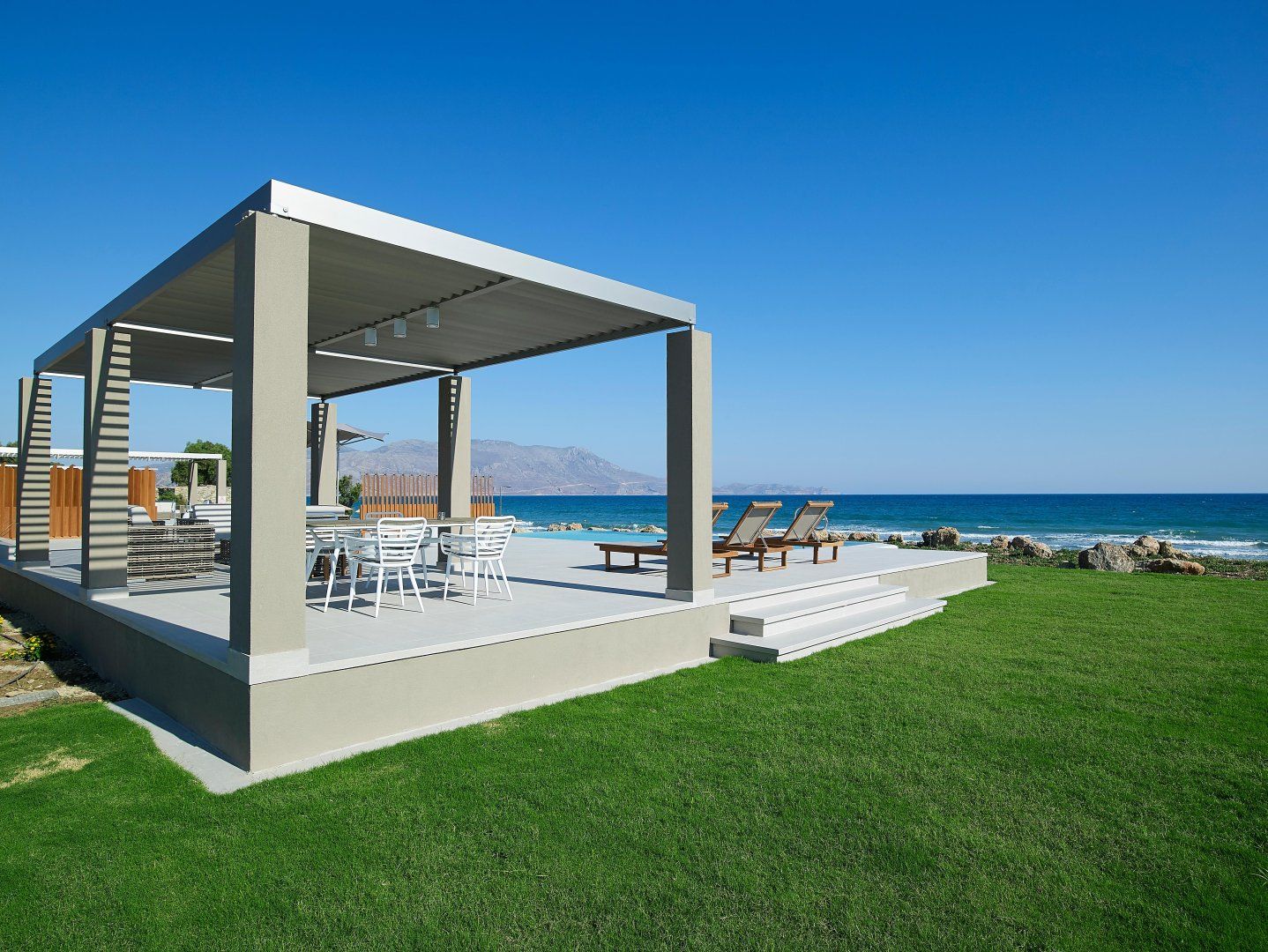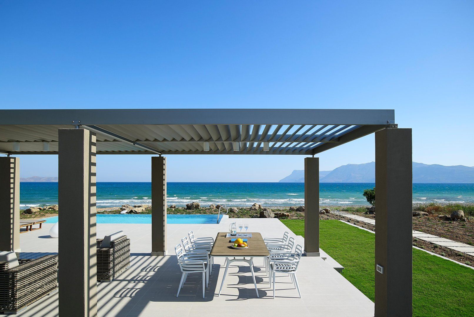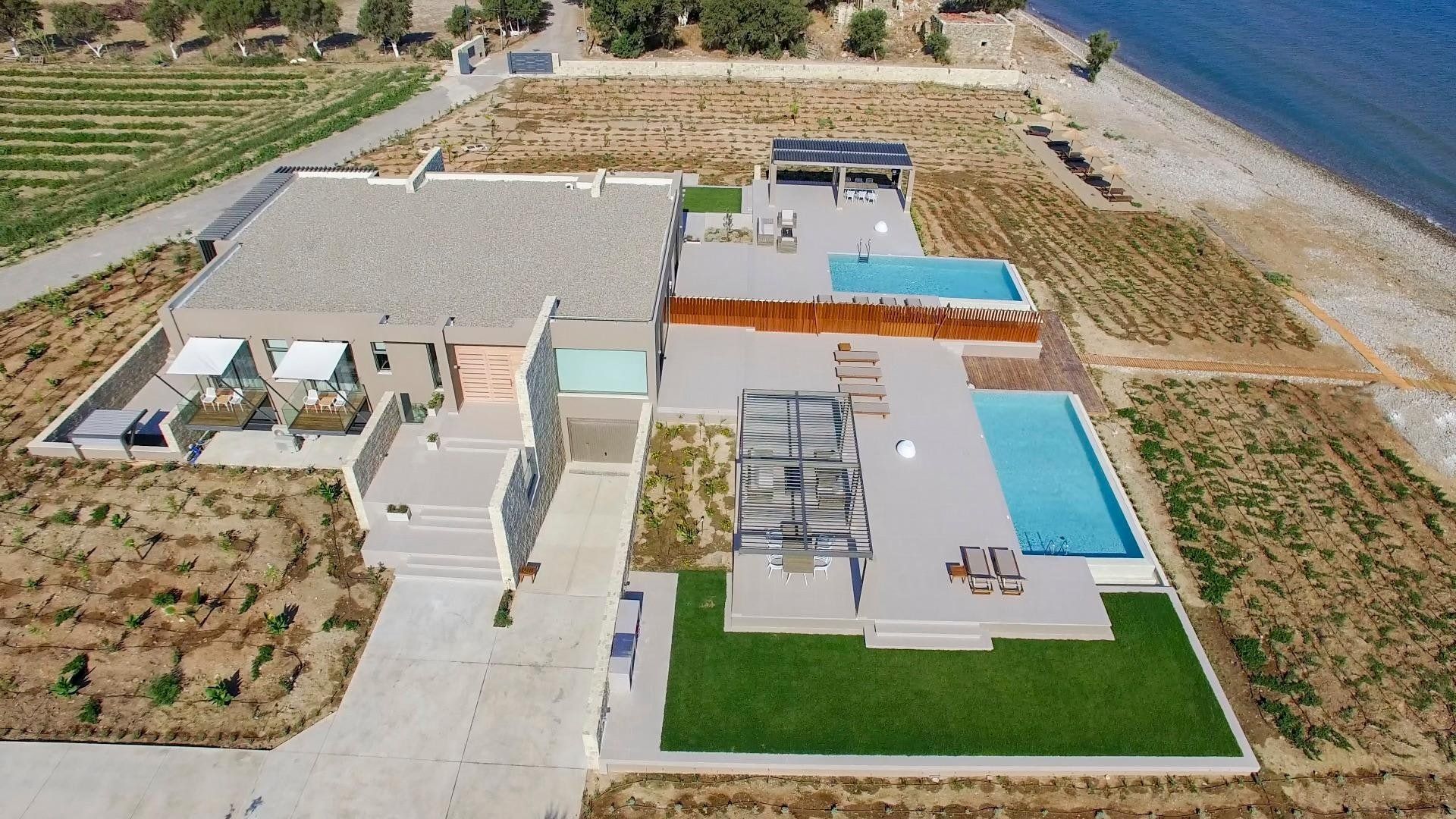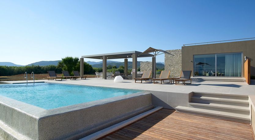 Luckily, this villa is perfectly set up to make the most of the stunning location. The open-plan living space has huge windows which bring the outside in, and the modern design is crisp and chic. Although this home can accommodate up to eighteen guests, it never feels too busy – there's plenty of space to find your own peace and quiet. Relax on the balcony, stretch out on a lounger, or make a splash in one of the two swimming pools. Then, as evening arrives, gather everyone at the alfresco dining table to share a Greek feast together.
