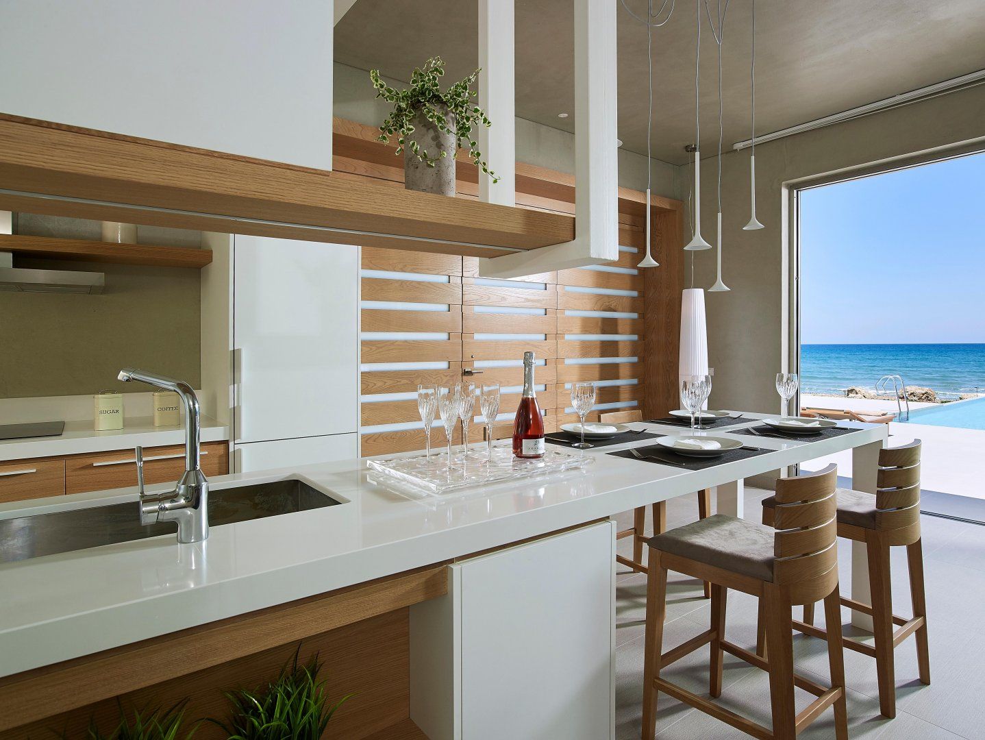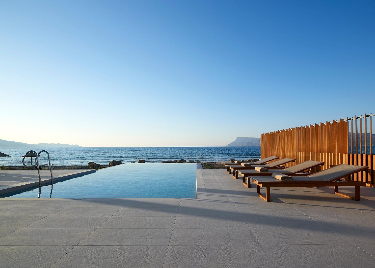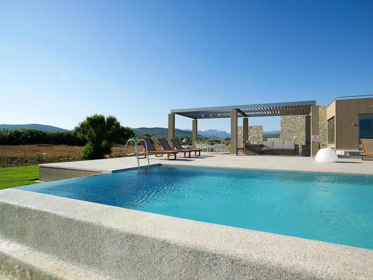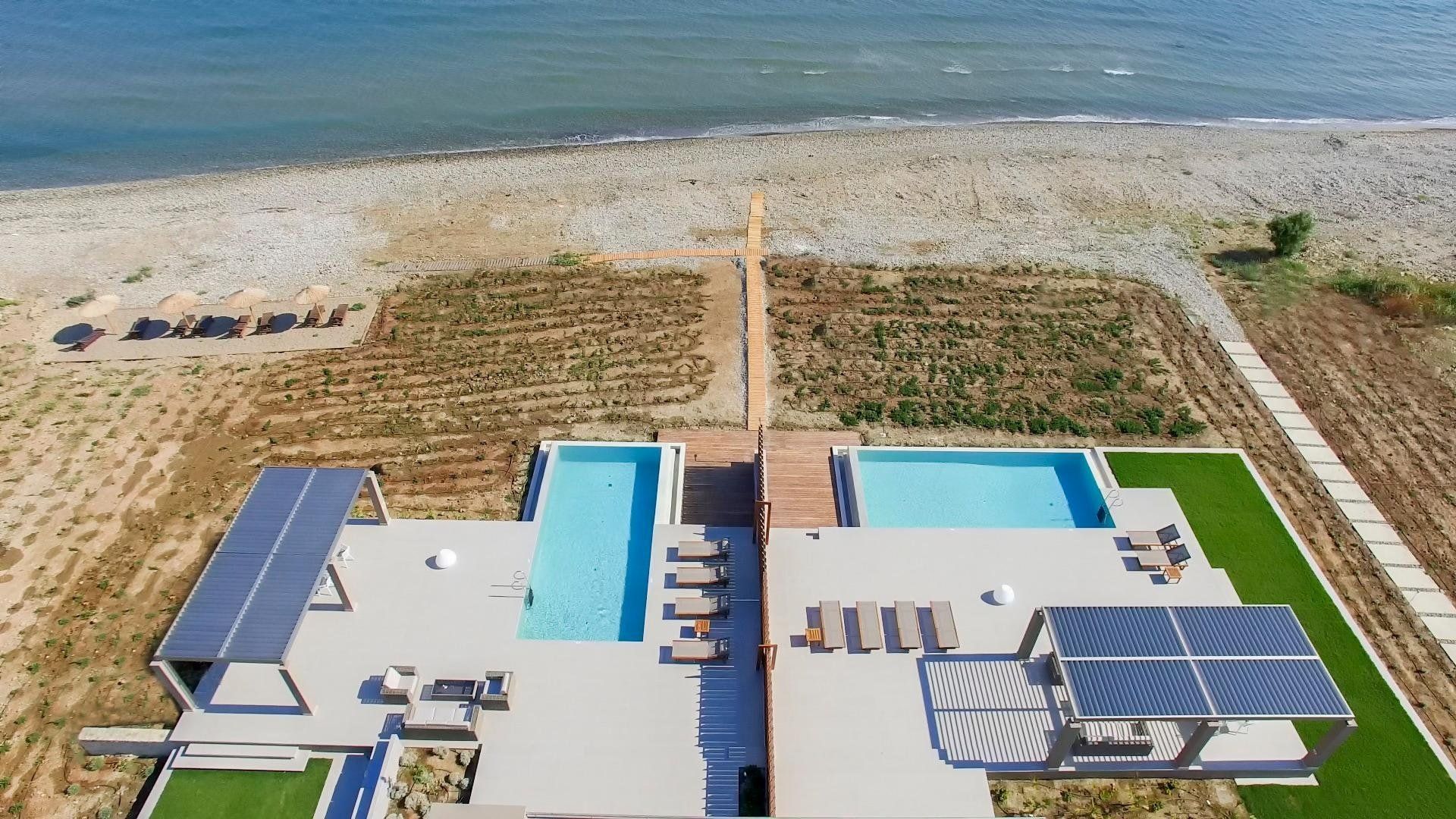 Luckily, this villa is perfectly set up to make the most of the stunning location. The open-plan living space has huge windows which bring the outside in, and the modern design is crisp and chic. Although this home can accommodate up to eighteen guests, it never feels too busy – there's plenty of space to find your own peace and quiet. Relax on the balcony, stretch out on a lounger, or make a splash in one of the two swimming pools. Then, as evening arrives, gather everyone at the alfresco dining table to share a Greek feast together.