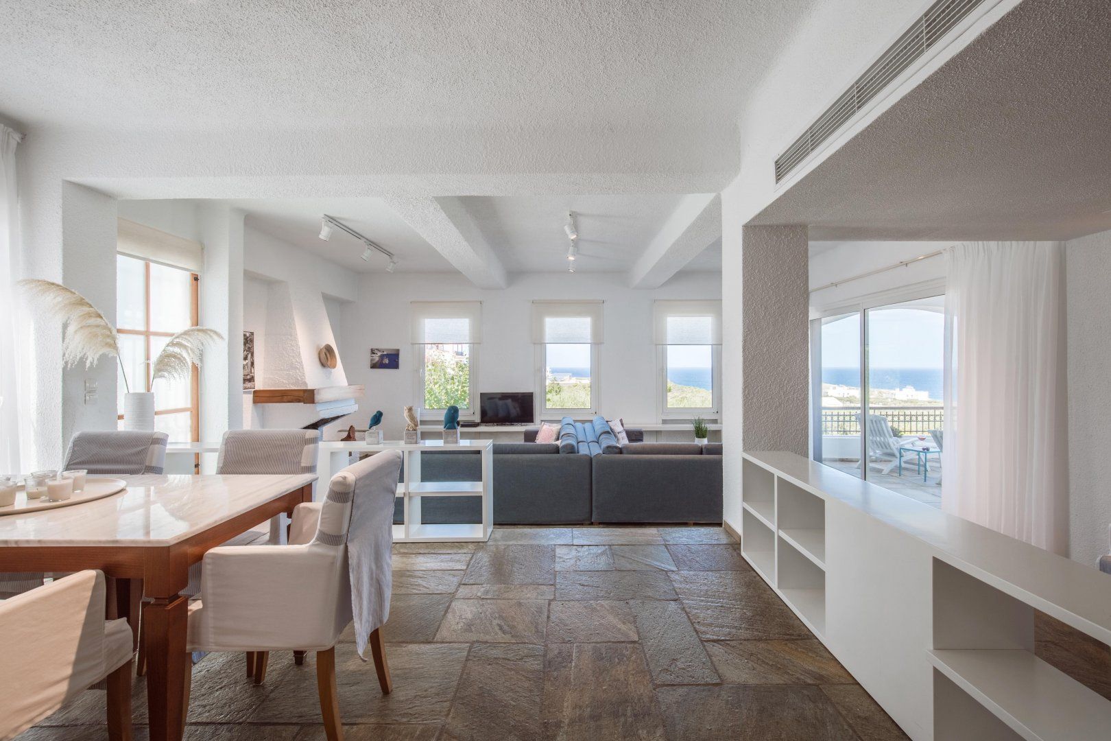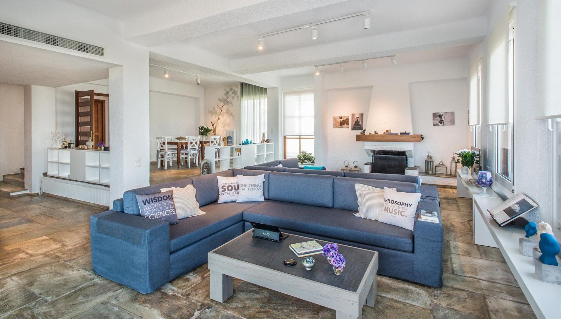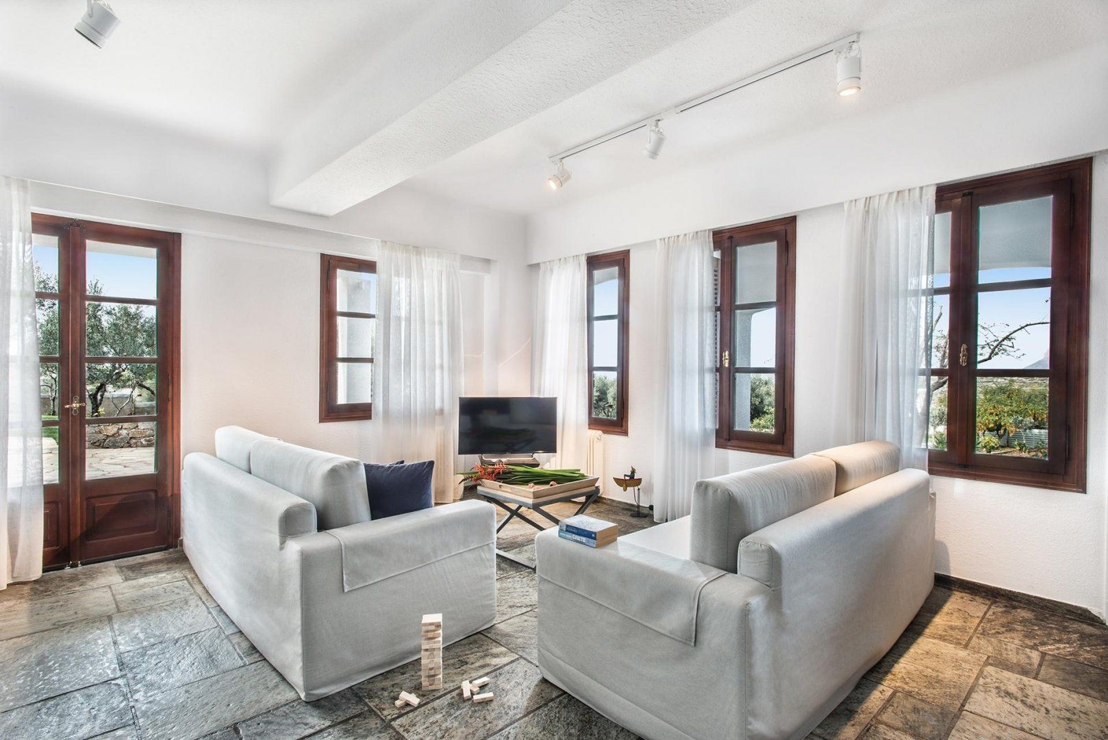 Located on the Akrotiri Peninsula, this wonderful villa offers a slightly different option for large groups travelling together that want the option of privacy. It looks like one property from the outside, but each floor is a separate apartment in itself, each with a lounge, fireplace, kitchen and dining area. The upper storey has a balcony, but the lower level has direct access to the garden.