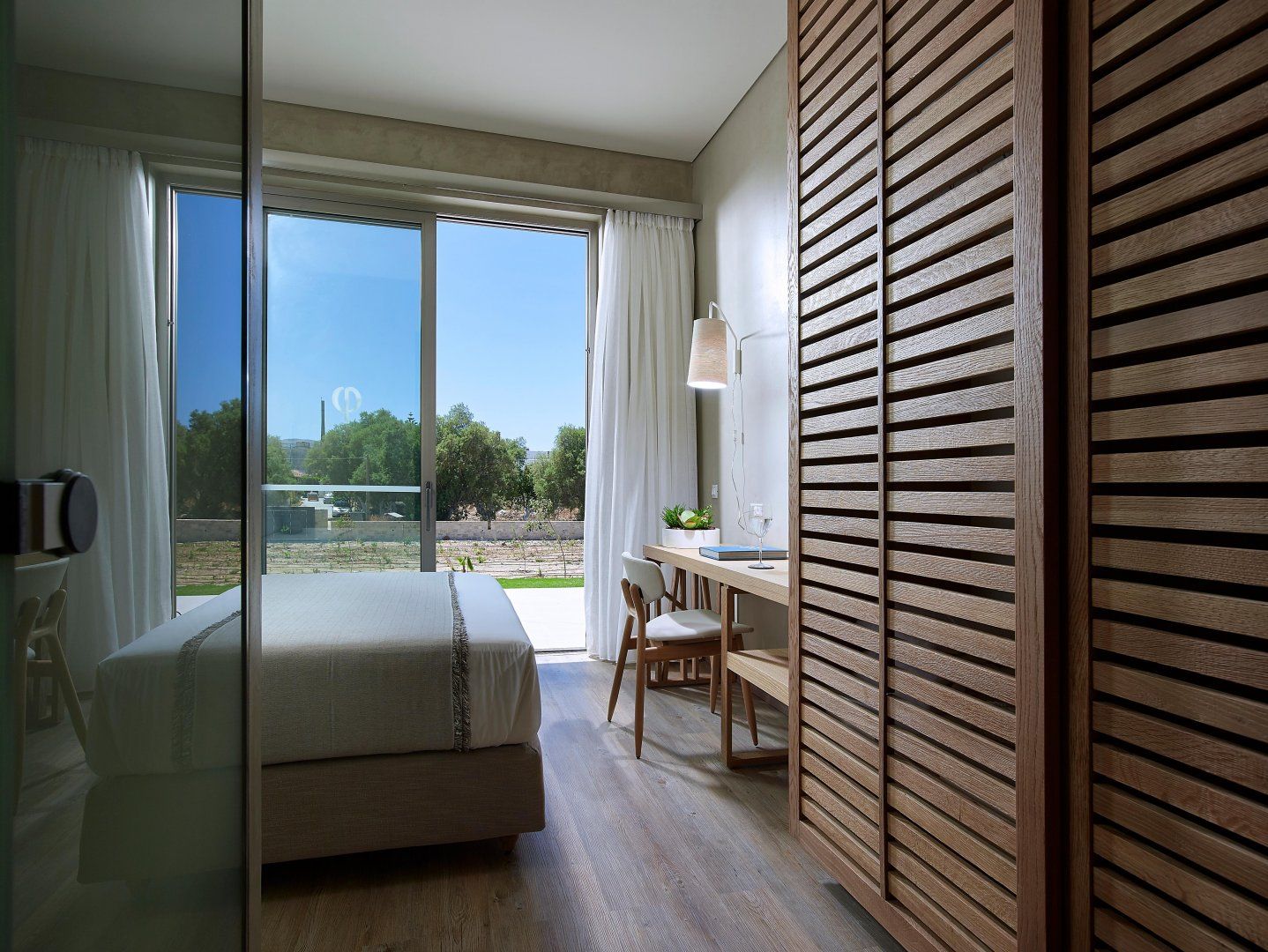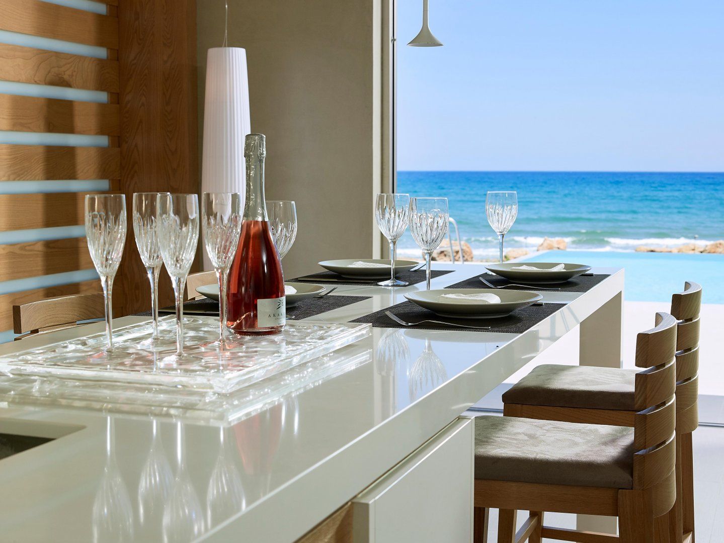 This villa is modern magnificence at its finest. Sitting right on the waters at the Kissamos coast, the angular lines of the home come in striking contrast to the rolling hills and waves that surround it. In its stylish concrete courtyard, your private pool awaits, along with sun loungers, alfresco dining spots, and an outdoor lounge. We love the use of glass sliding doors to bring the outside in, where you can take a break from the midday sun by stepping into the lounge. Fantastic use of wooden slats and modern furniture creates a unique living space with Scandinavian ideals. Perch here nibbling juicy olives until sundown, then step out again for a barbecue on the terrace when the beachside rocks light up at night.
