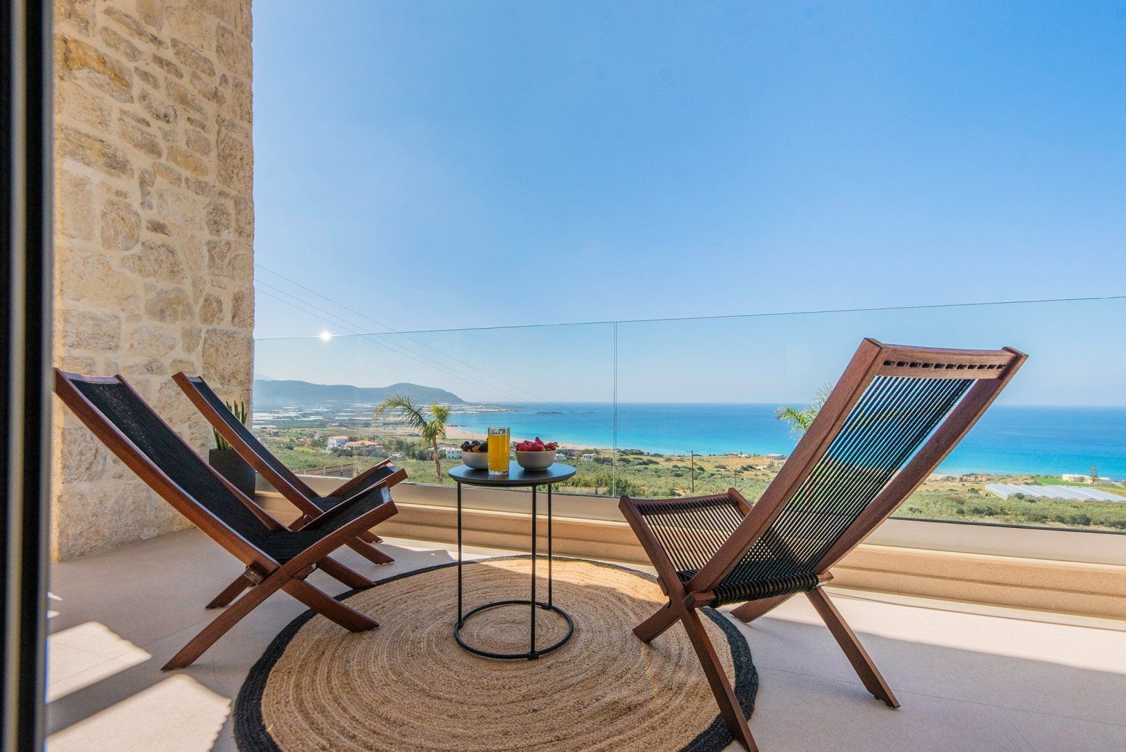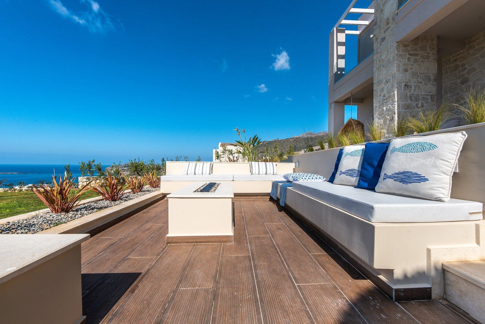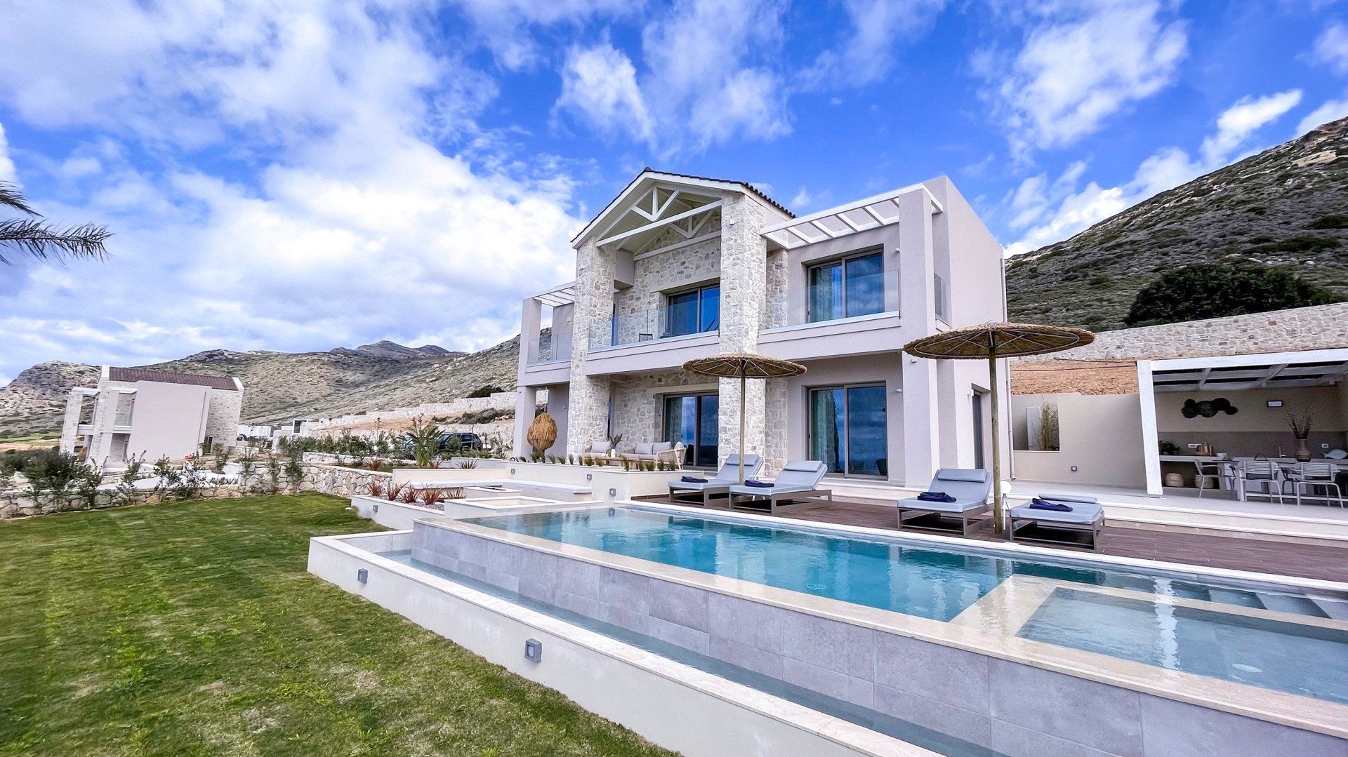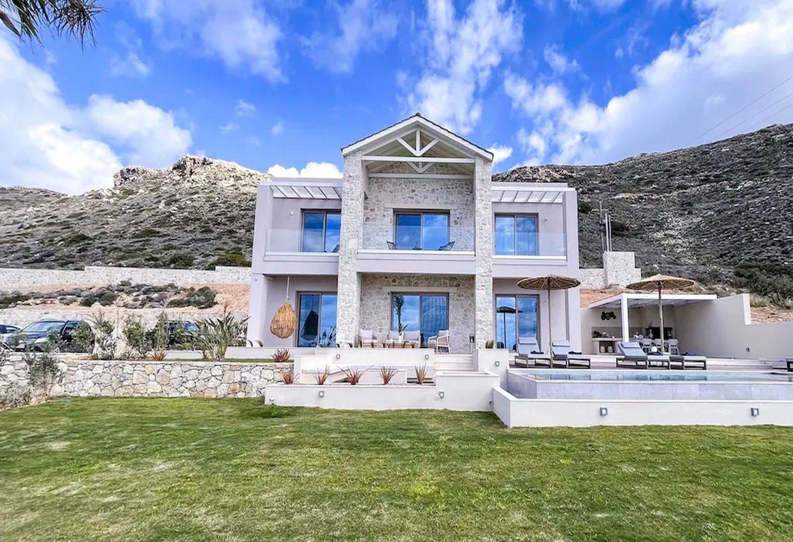 A recent addition to the map, this modern villa sits on a hillside close to the western shoreline of Crete, a prime position that blesses anybody lucky enough to call it home for a while with stunning views of the Ionian Sea and Cretan mountains standing tall in the distance.