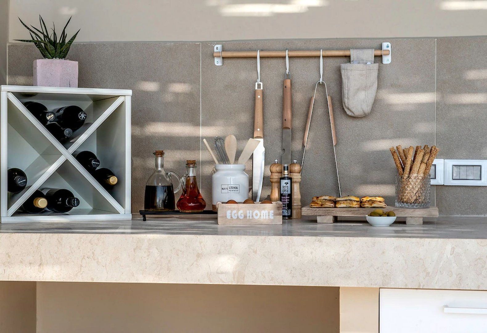 Stepping inside, you’ll find a sleek and contemporary interior that embodies coastal chic. Warm-toned hues, rattan, and stone brick walls are met with modern design to create a space that’s luxurious yet homely.