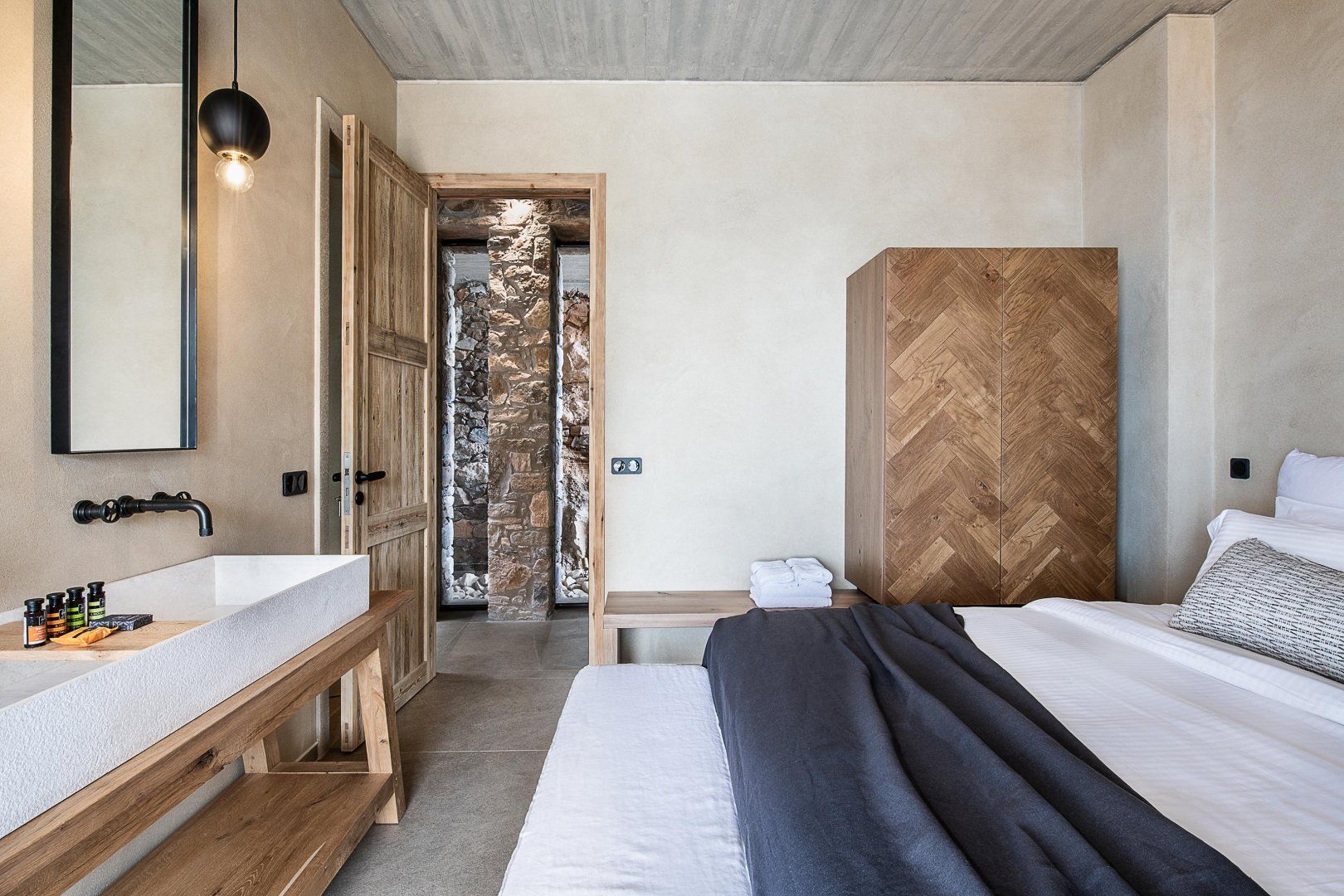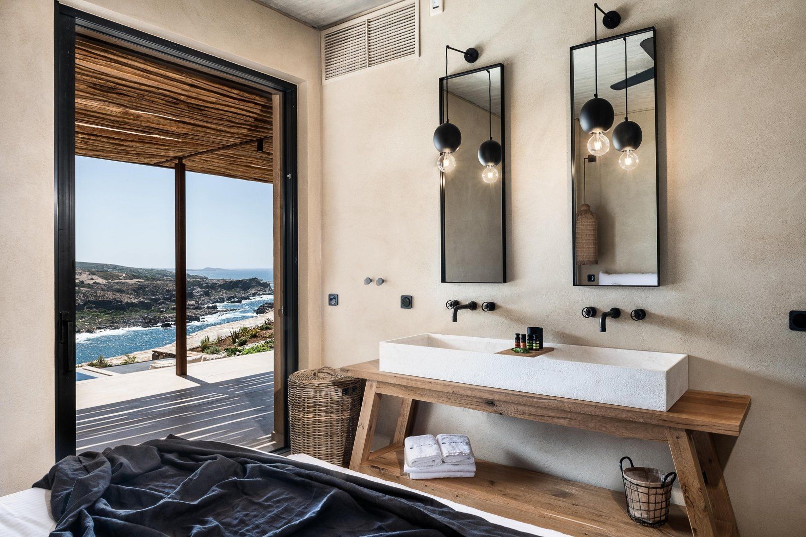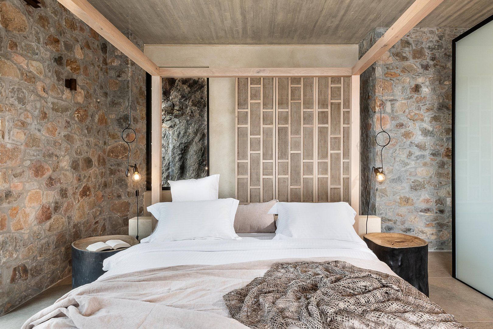 Glass sliding doors keep things flowing from terrace to interior, where the open living room is a vision of fawn, cream and ink-black. Exposed stone walls and sleek concrete underfoot keep things cool and breezy, just like a seaside abode should be. Bedrooms look as though they were designed with Bohemian royalty in mind with raw-wood four-poster beds, stone walls and tree stump bedside tables.