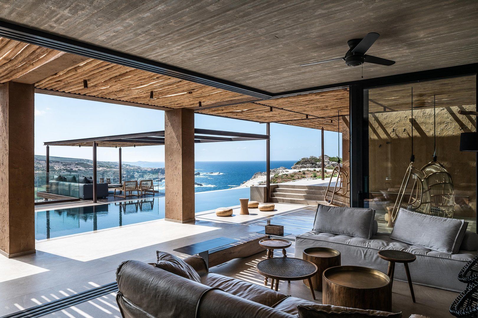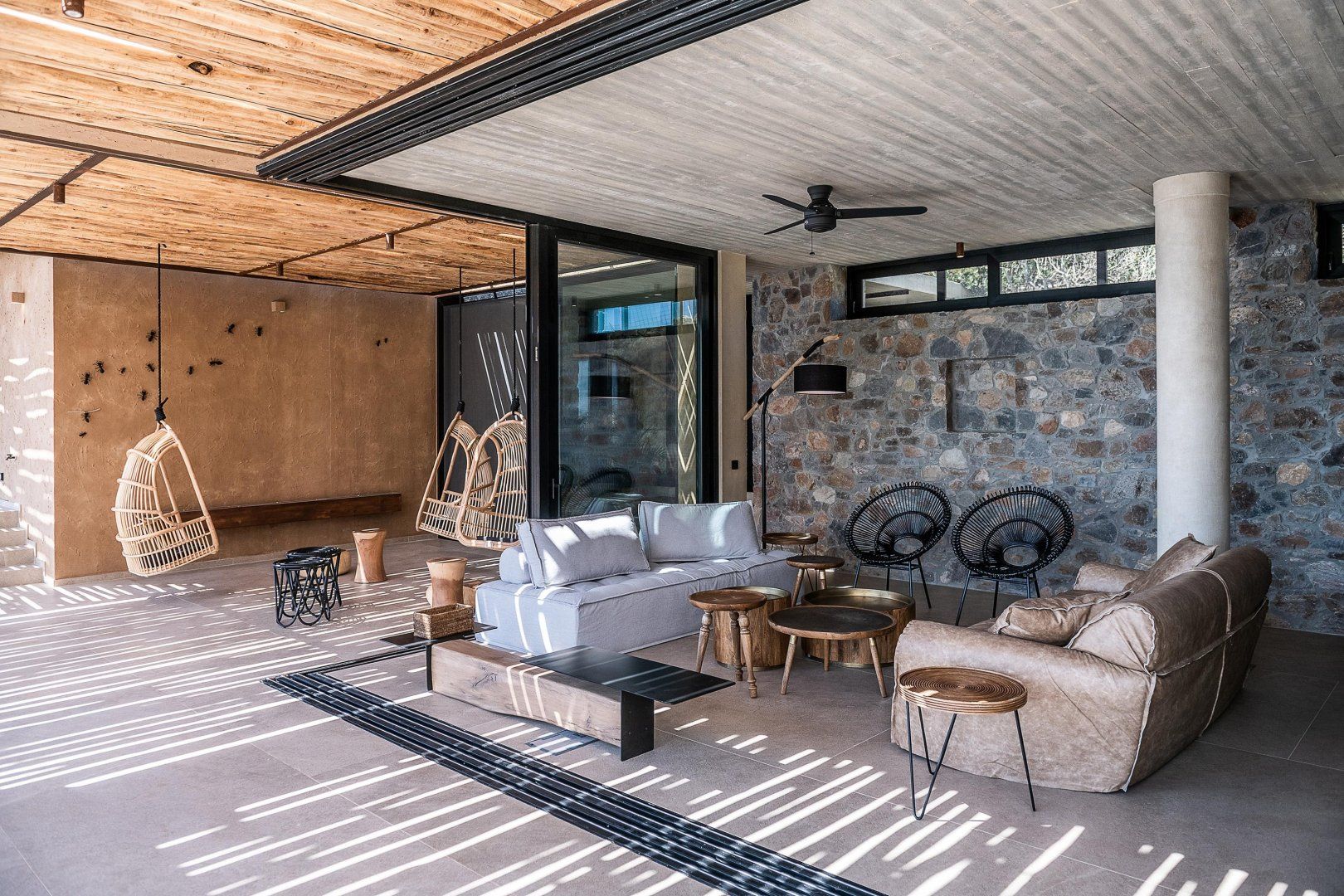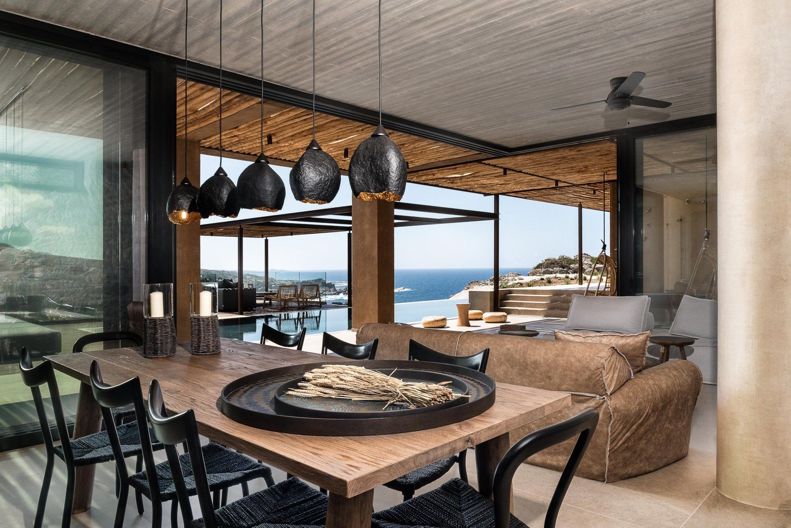 Glass sliding doors keep things flowing from terrace to interior, where the open living room is a vision of fawn, cream and ink-black. Exposed stone walls and sleek concrete underfoot keep things cool and breezy, just like a seaside abode should be. Bedrooms look as though they were designed with Bohemian royalty in mind with raw-wood four-poster beds, stone walls and tree stump bedside tables.