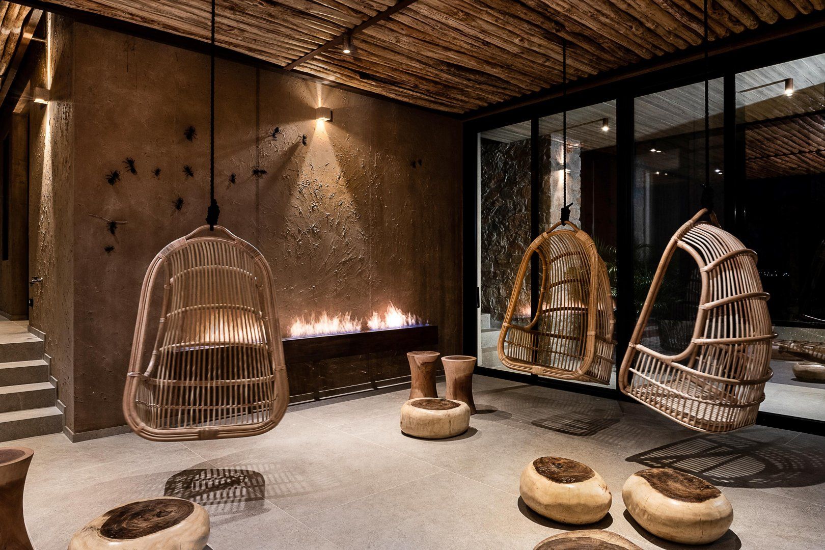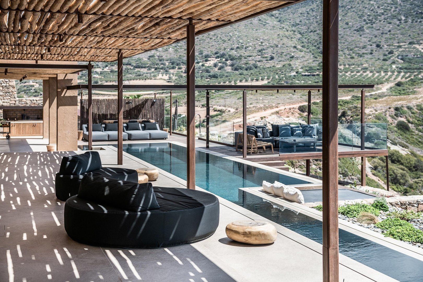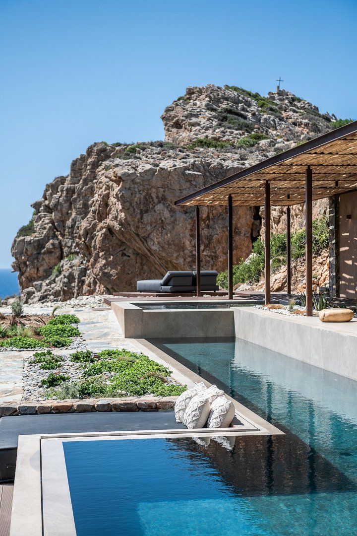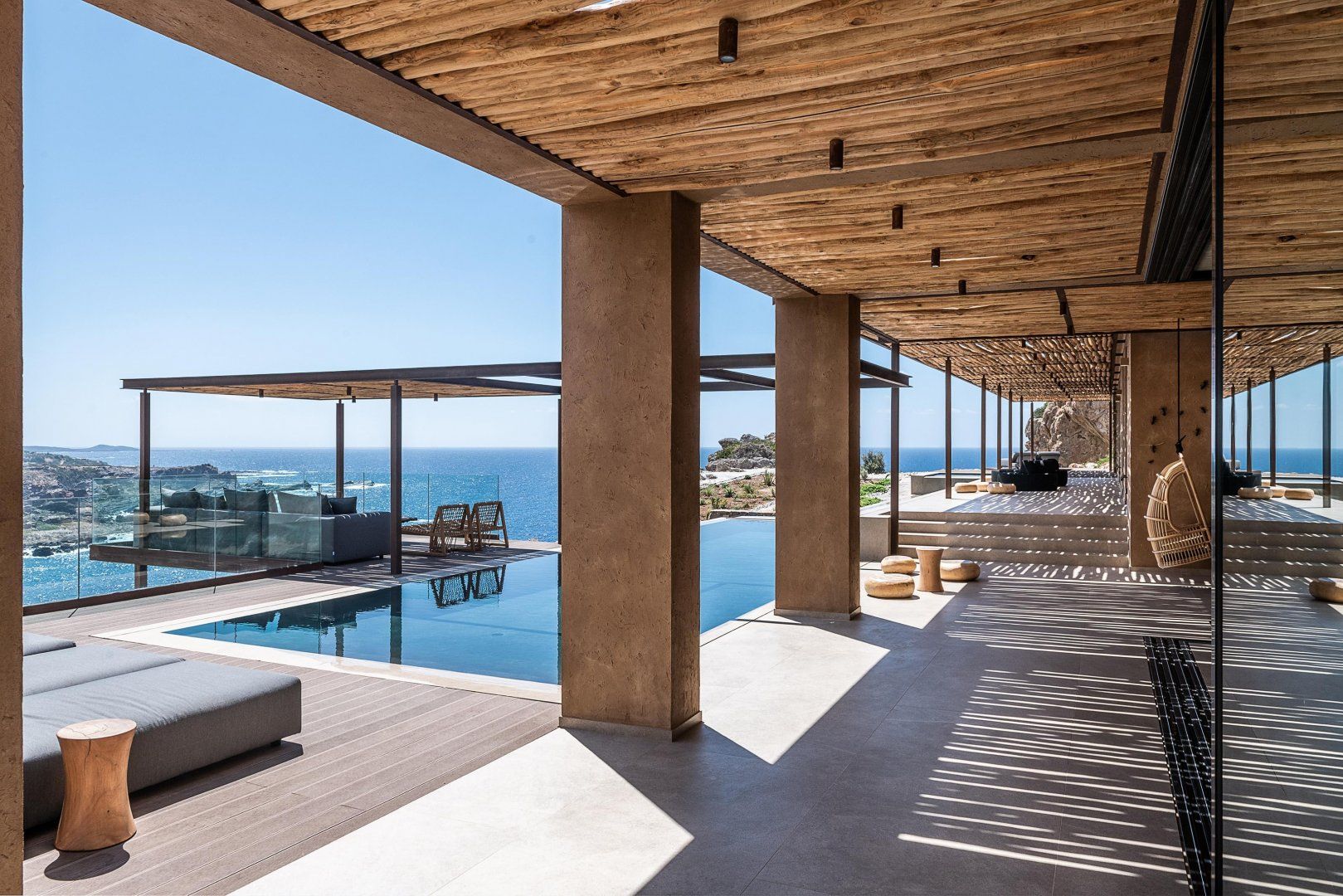 The villa is designed with outdoor living in mind, as the stone facade blends into the craggy mountain backdrop. A jutting lip of a terrace sits on the rocks just above the sea, and here you’ll find the pristine swimming pool surrounded by day beds and loungers. A shaded pergola deck hangs off the cliffside, where squashy sofas take in the view. Plus, there’s a full, boho-chic outdoor lounge with wicker egg chairs suspended from the ceiling and a fire pit to keep things warm in the evening.