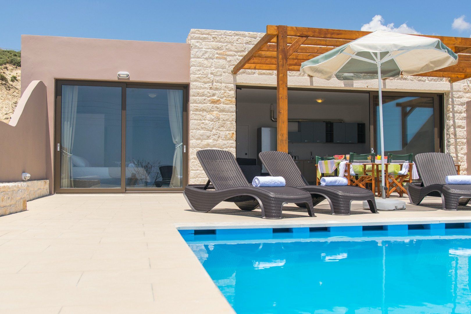 Home truths: *Due to the location of this home, we recommend hiring a car to get the most out of your stay – there's private parking for up to four cars here *For those with reduced mobility, there's a ground floor bedroom and bathroom here (this home is all on one level) *The main bedroom has an en-suite, with the bathroom in the bedroom itself *Though there isn't a dedicated desk here, the dining table doubles up as a laptop-friendly workspace *The swimming pool isn't fenced, so children will need to be supervised at all times *There's a mini market in the nearby village of Skaloti, around 2km from the villa, and supermarkets, restaurants etc. in Frangokástello, 5km away