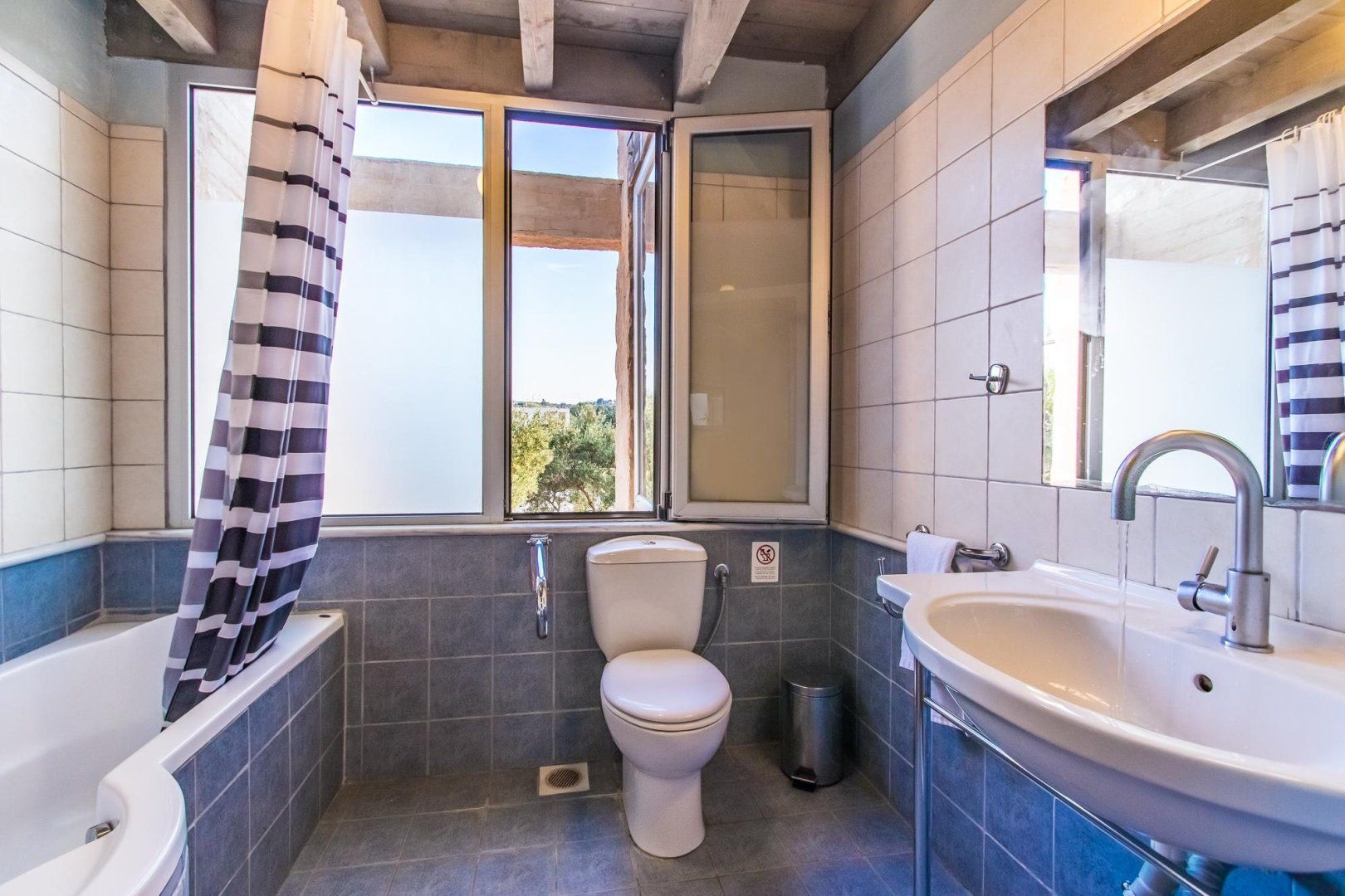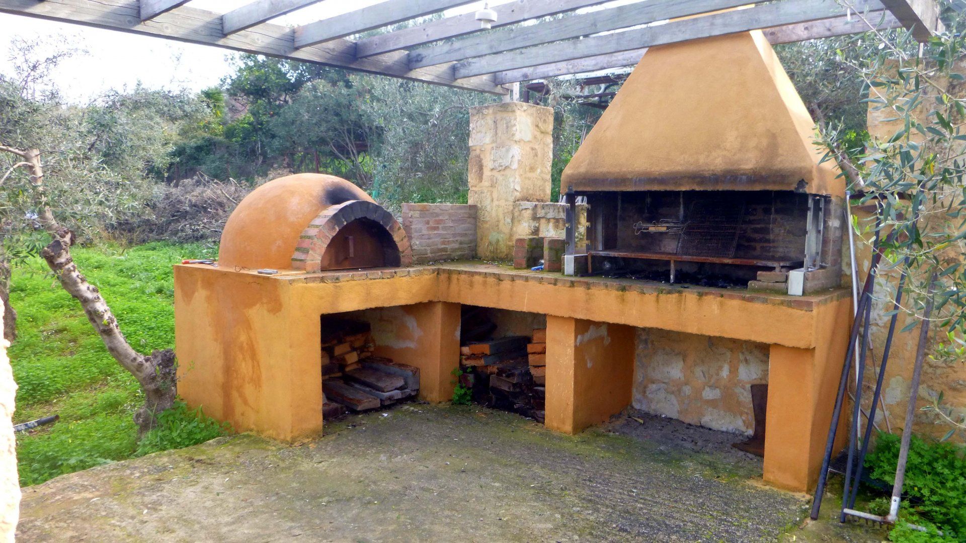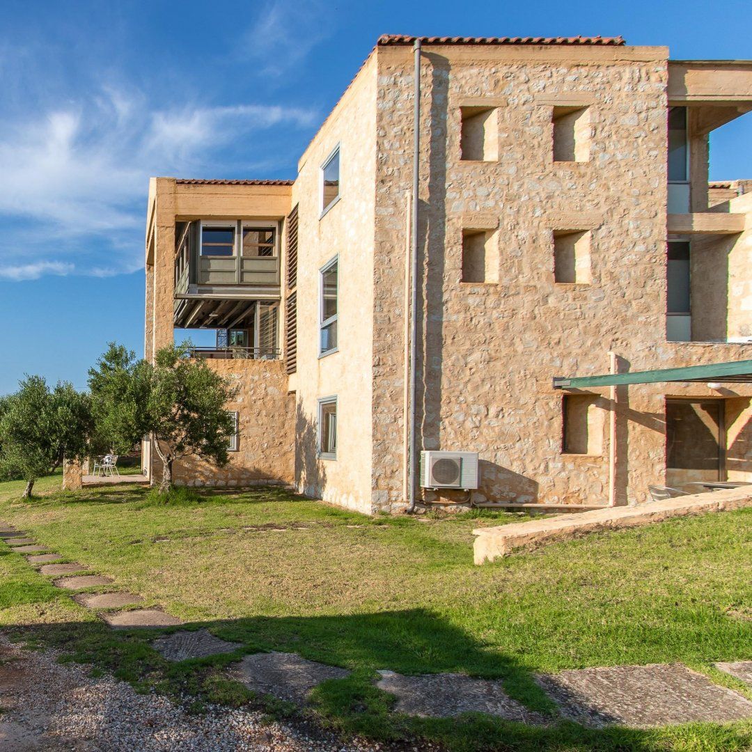 We're betting you didn't choose to come to a Greek island to marvel at interior design and the outside offering doesn't disappoint, either. In the middle of the garden bordered by olive groves, there's a swimming pool, as well as a covered terrace and an outdoor kitchen with a barbecue and stone oven.