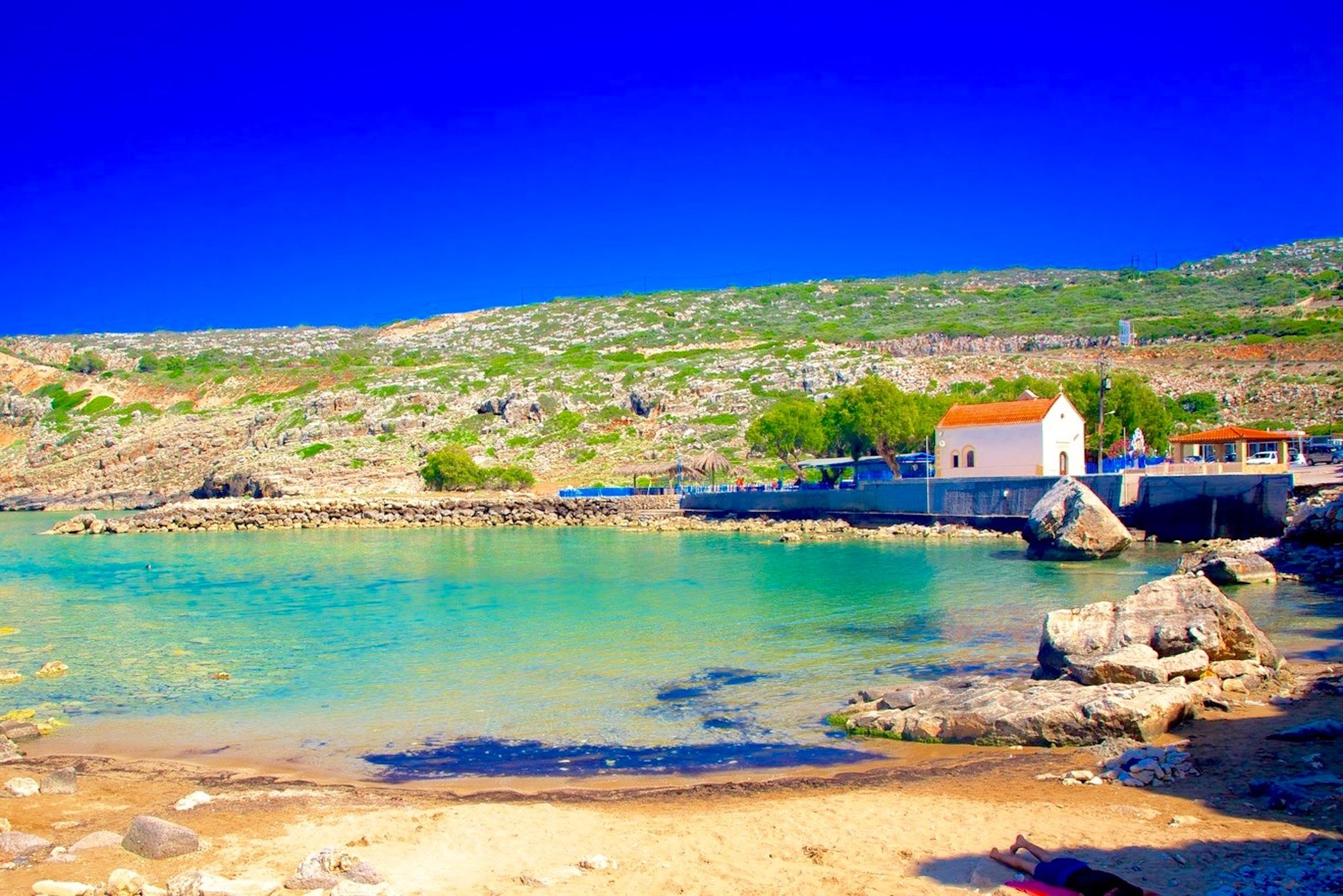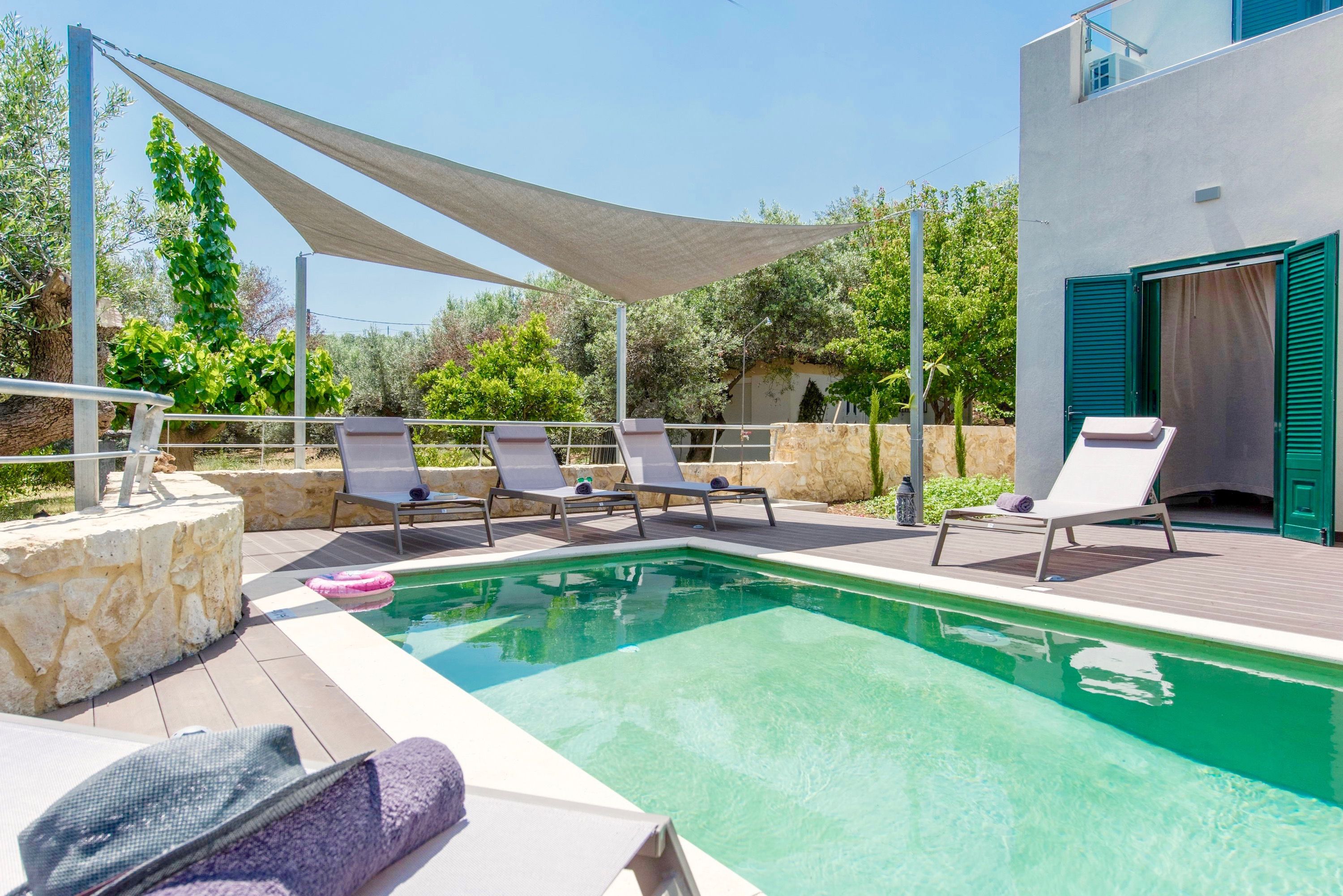 With this luxury villa's typically Greek whitewashed exterior, you'd be forgiven for expecting a traditional take on modern, but the open-plan living room in this home has a distinct mid-century meets warehouse style. Outside is where the real magic happens though – we love the Cretan countryside and sea views that greet you as you step onto the terrace, beyond the azure pool. If the sizzling sun gets too hot, recline on a sun lounger under the sail shades. For lunch, enjoy a feast in the garden with goodies from the local bakery in Gerani Village, a ten-minute walk away. It's the same distance to beautiful Gerani Beach if you fancy feeling its warm, golden sand between your toes – utter bliss.