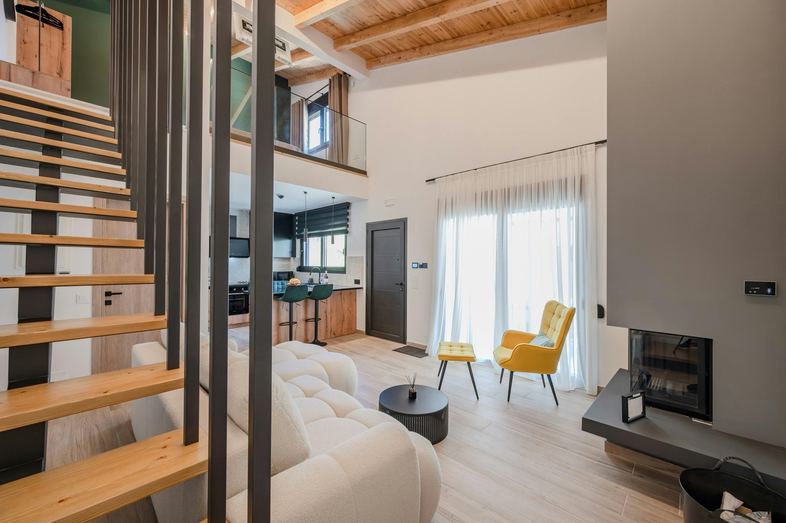 *At full occupancy, two guests will sleep on a sofa bed in the living space. The bedroom is on a mezzanine level that’s partially open to the living space below, so privacy is limited.
