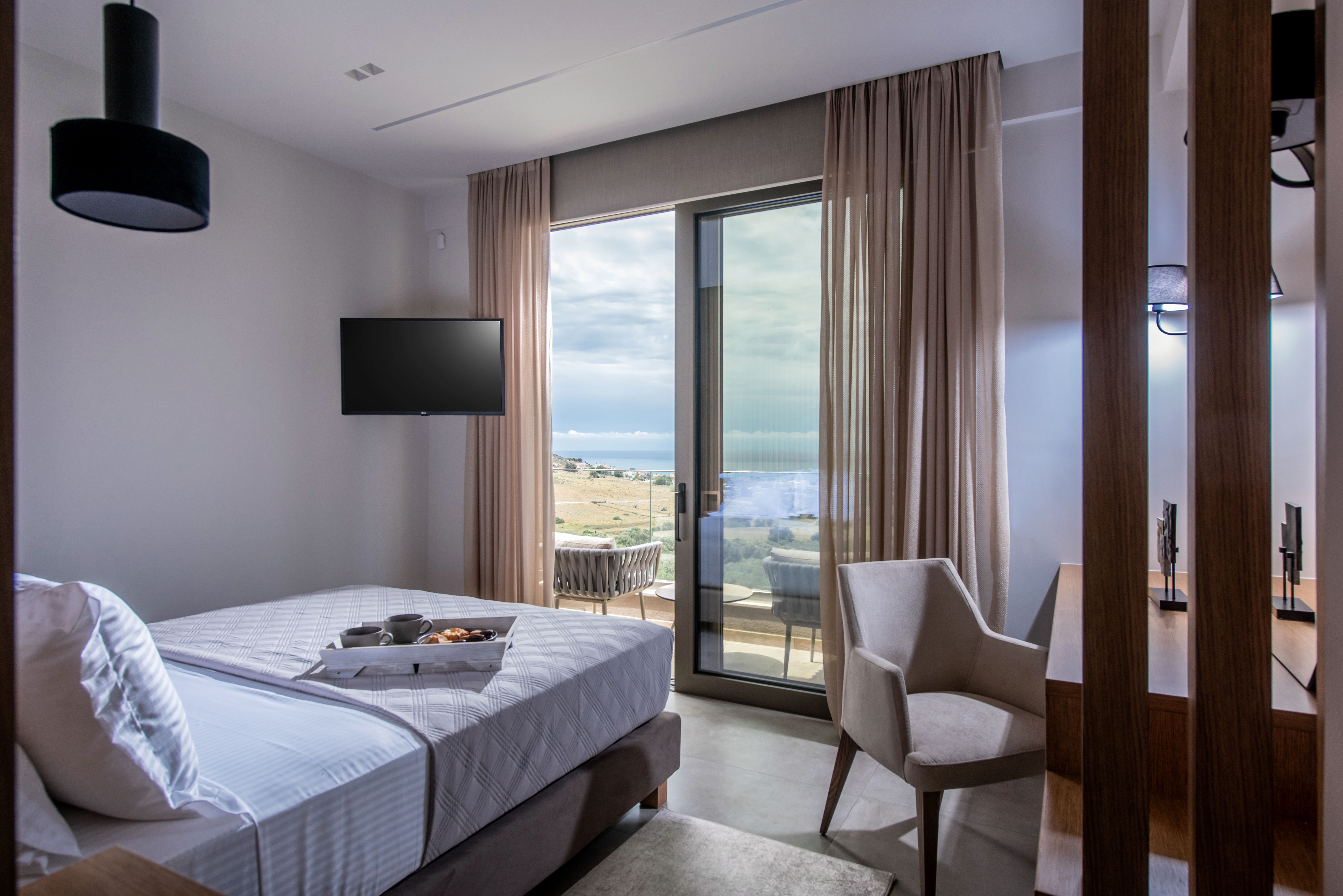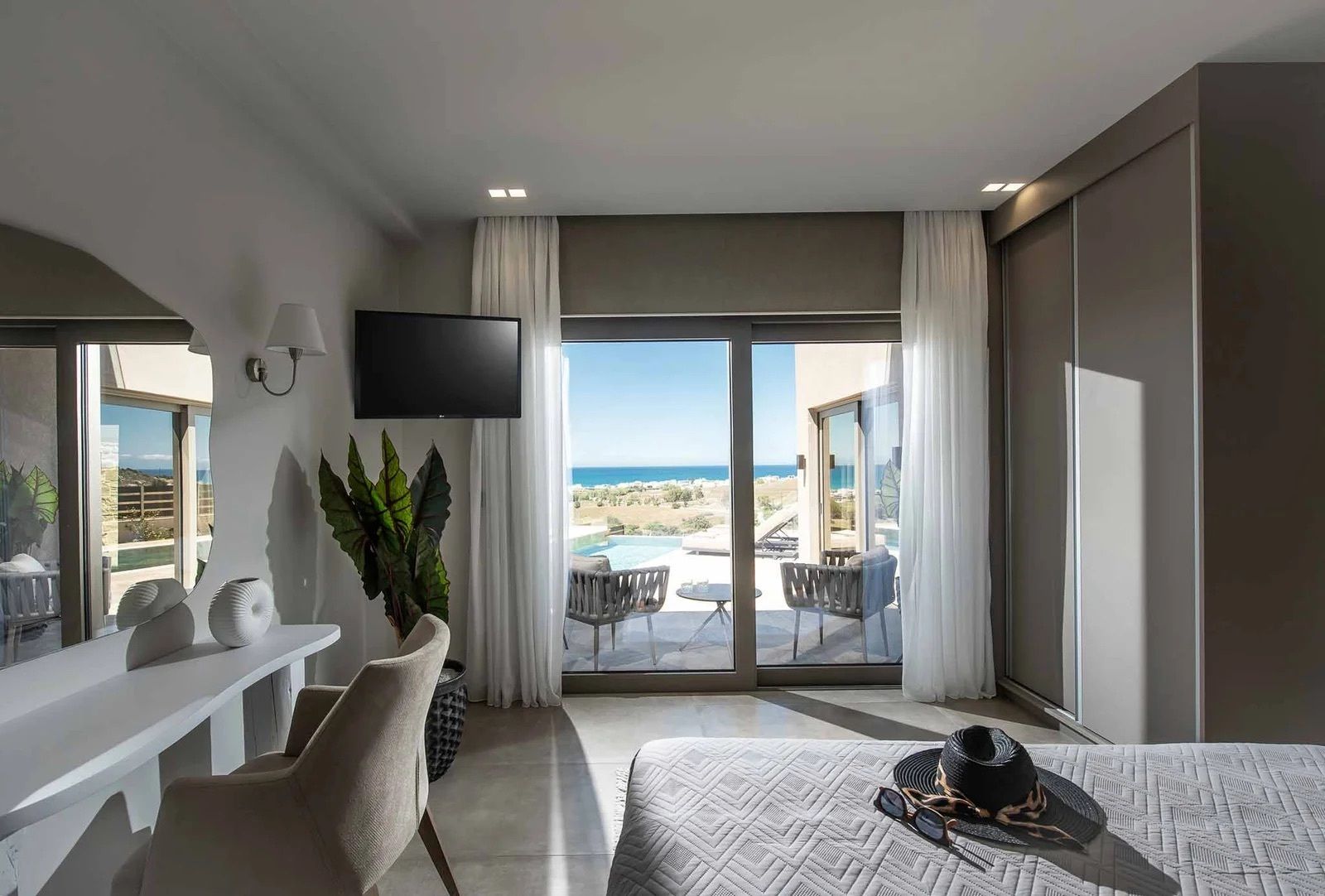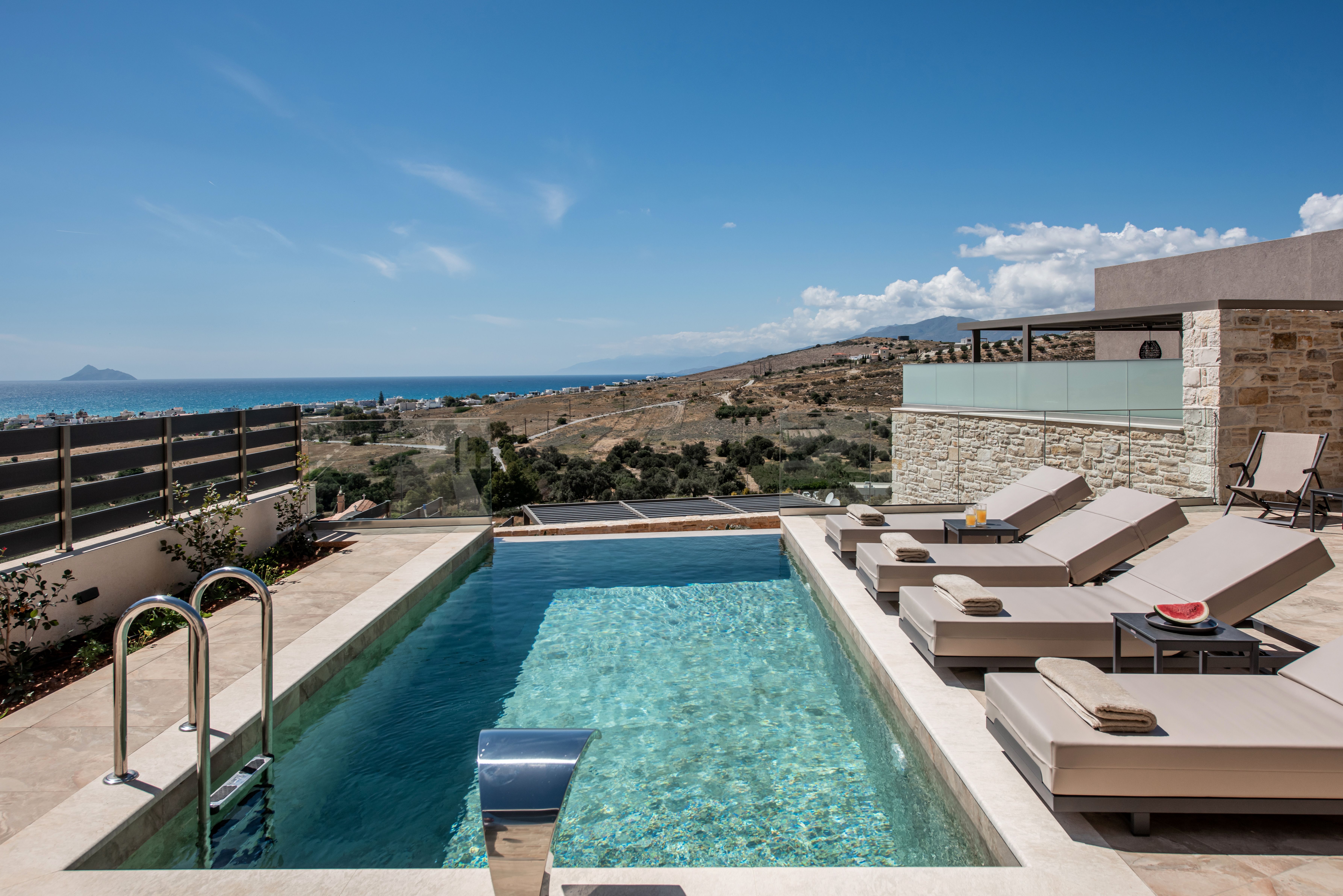 If sea views, sandy shores, and serenity are on your holiday checklist, you’ll want to see this villa. Kalamaki Beach is just a short stroll away, and further afield there’s Kommos Beach, and the boho village of Matala, so there’s always something to do or see. Of course, being in a peaceful spot means you’re away from the buzz of larger towns – but for many, that’s part of the appeal. Inside, the space has a comfortable living area and a well-equipped kitchen for easy meals. And the star of the show? The private pool and dining terrace outside, complete with panoramic sea views.