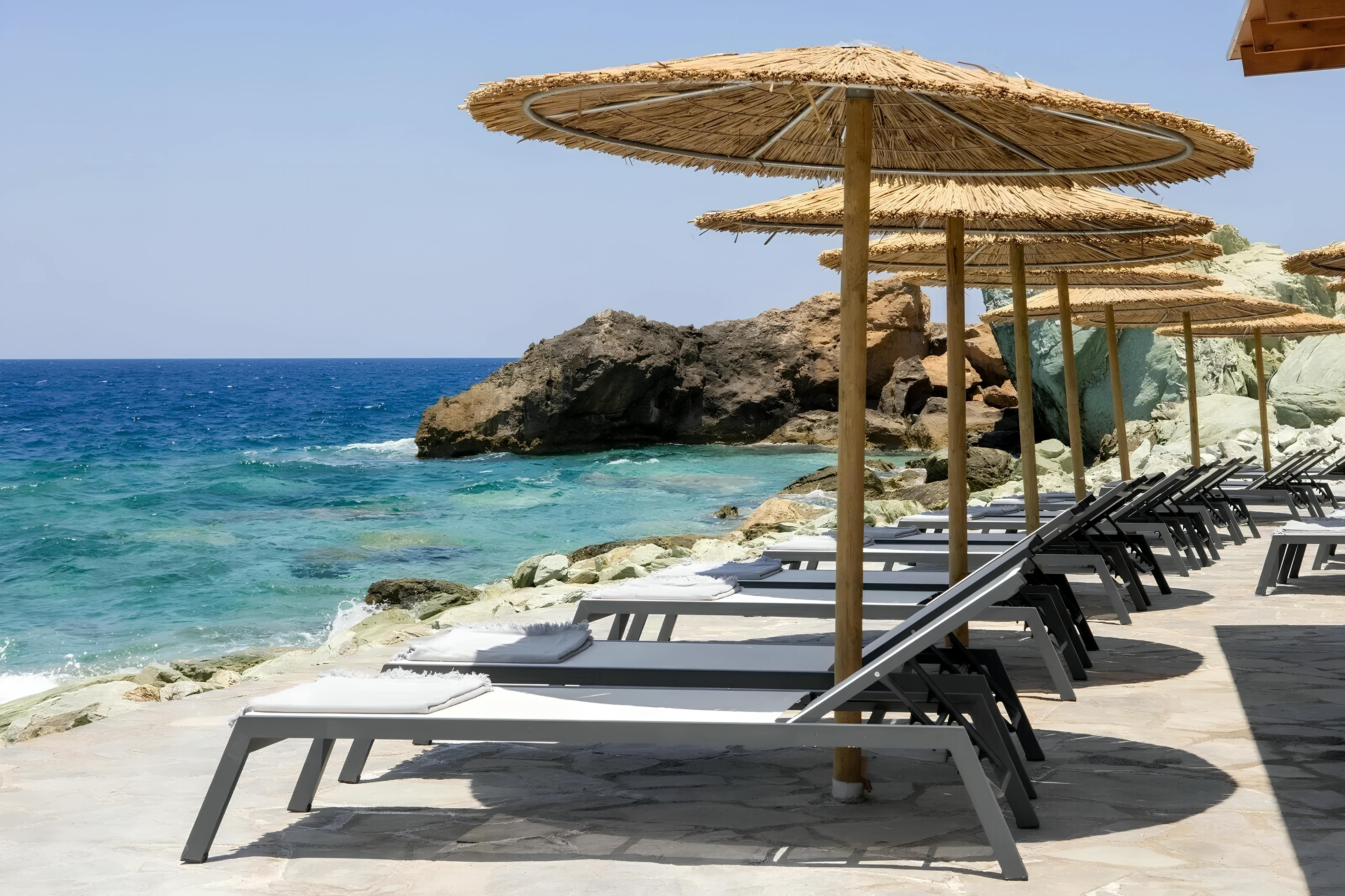 Situated in north Crete, just a short drive from Psaromoura Beach, this villa invites a family or group of friends to kick back and soak up the sunshine. The freshwater pool is all yours and there’s a terrace for unwinding with a tipple at dusk. Within the complex, you'll also have access to a communal space featuring a kitchen and grill – perfect for cooking up a feast with your loved ones. Better still, stone steps lead directly into the sea, and there are waterfront loungers for working on your tan.