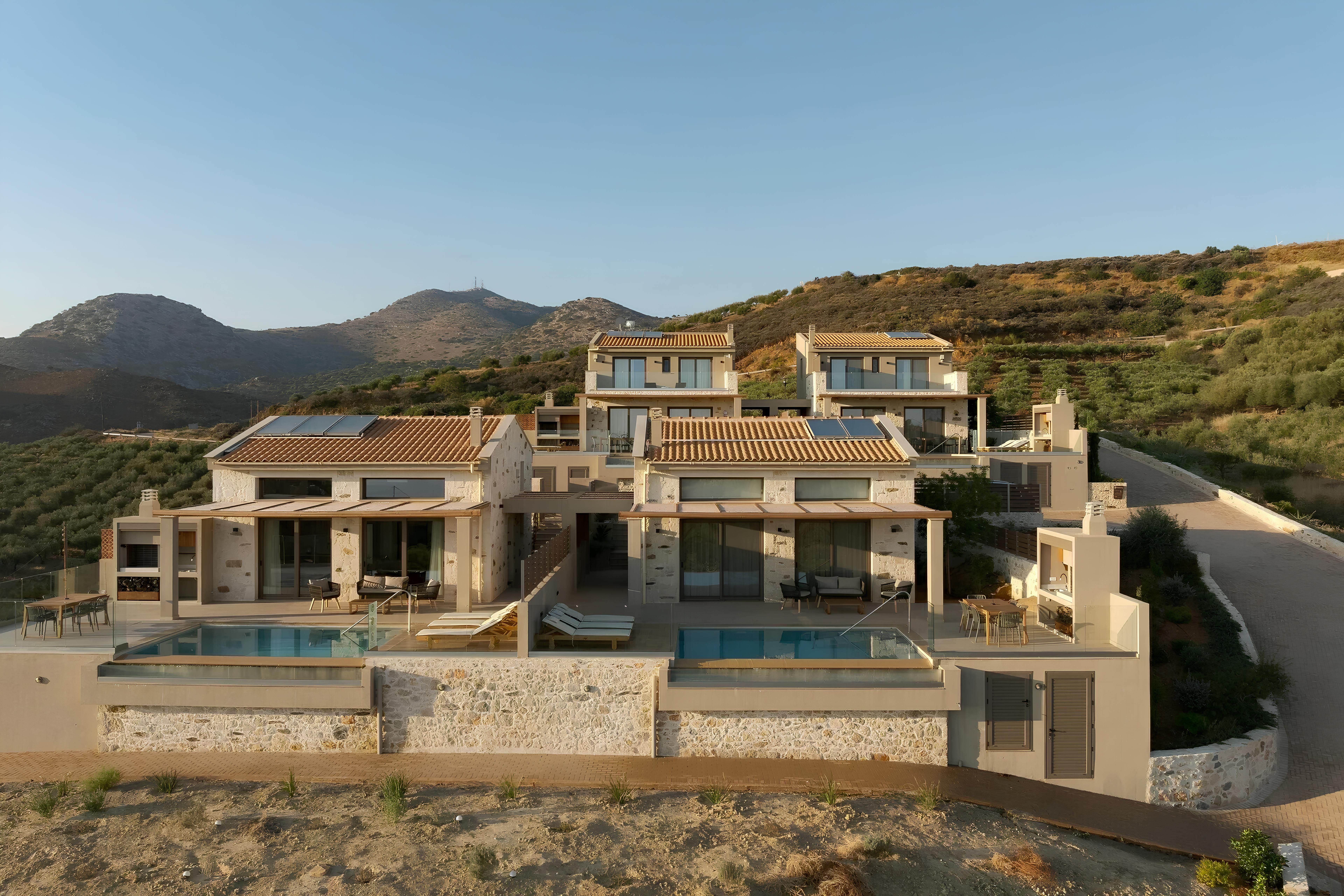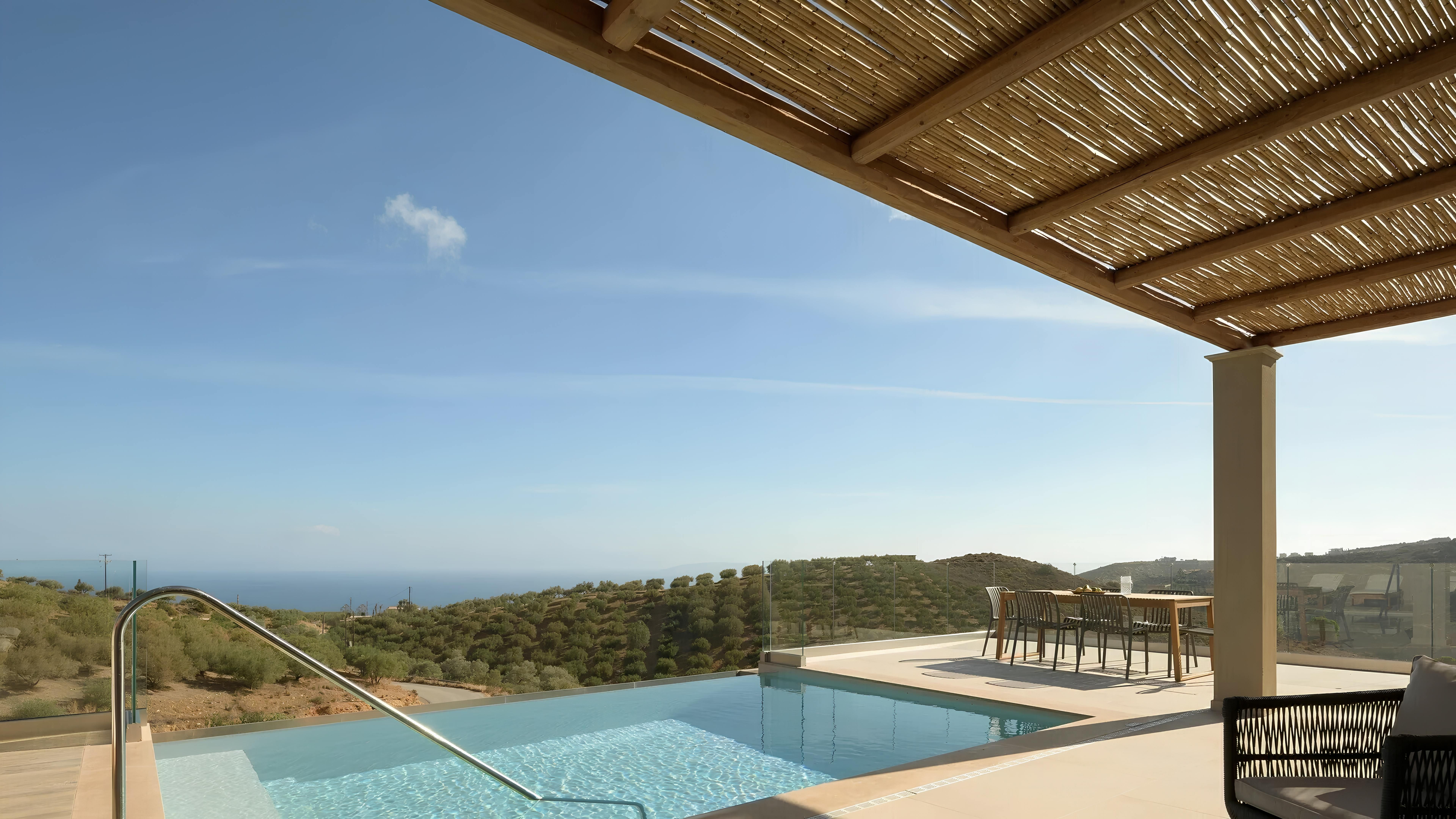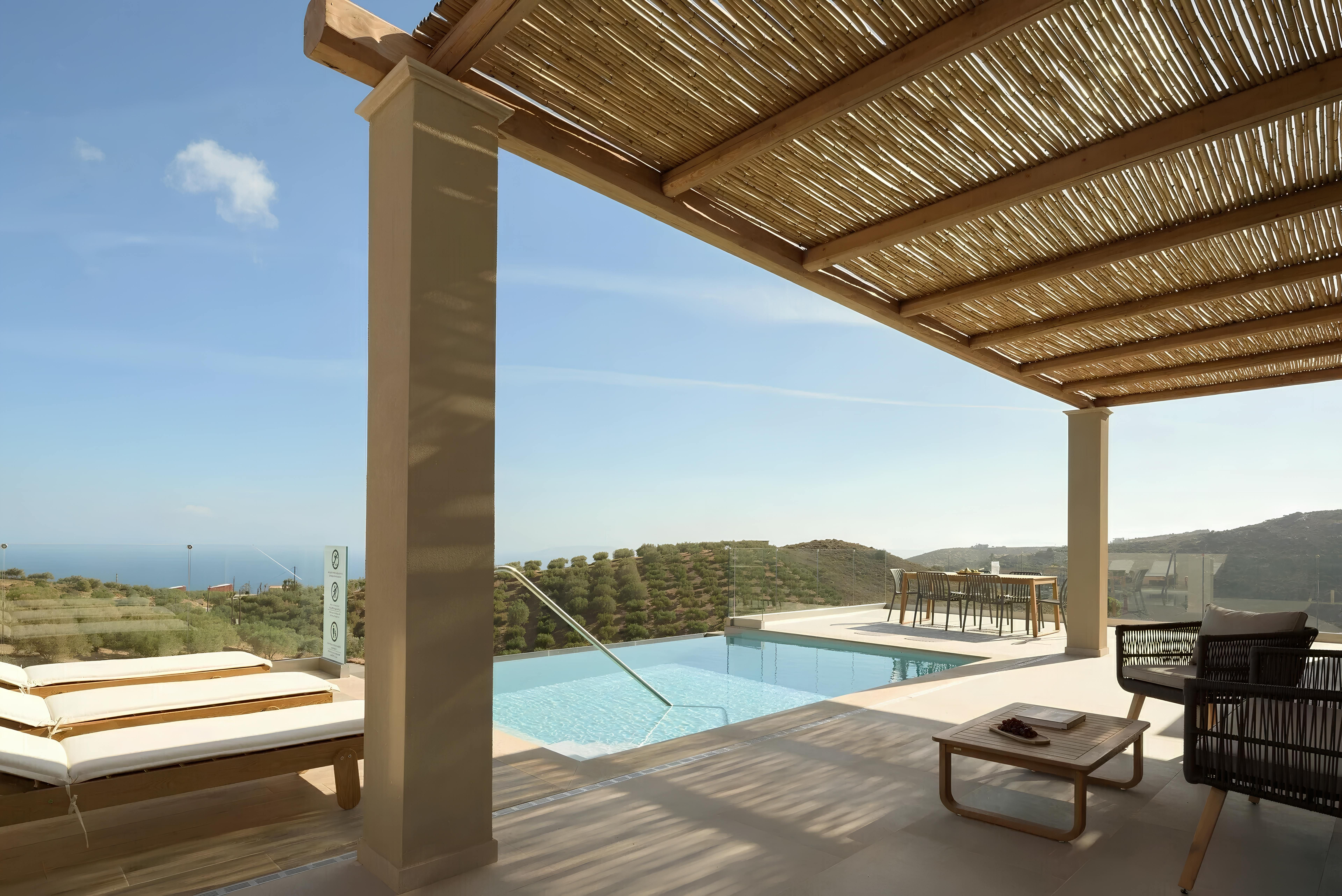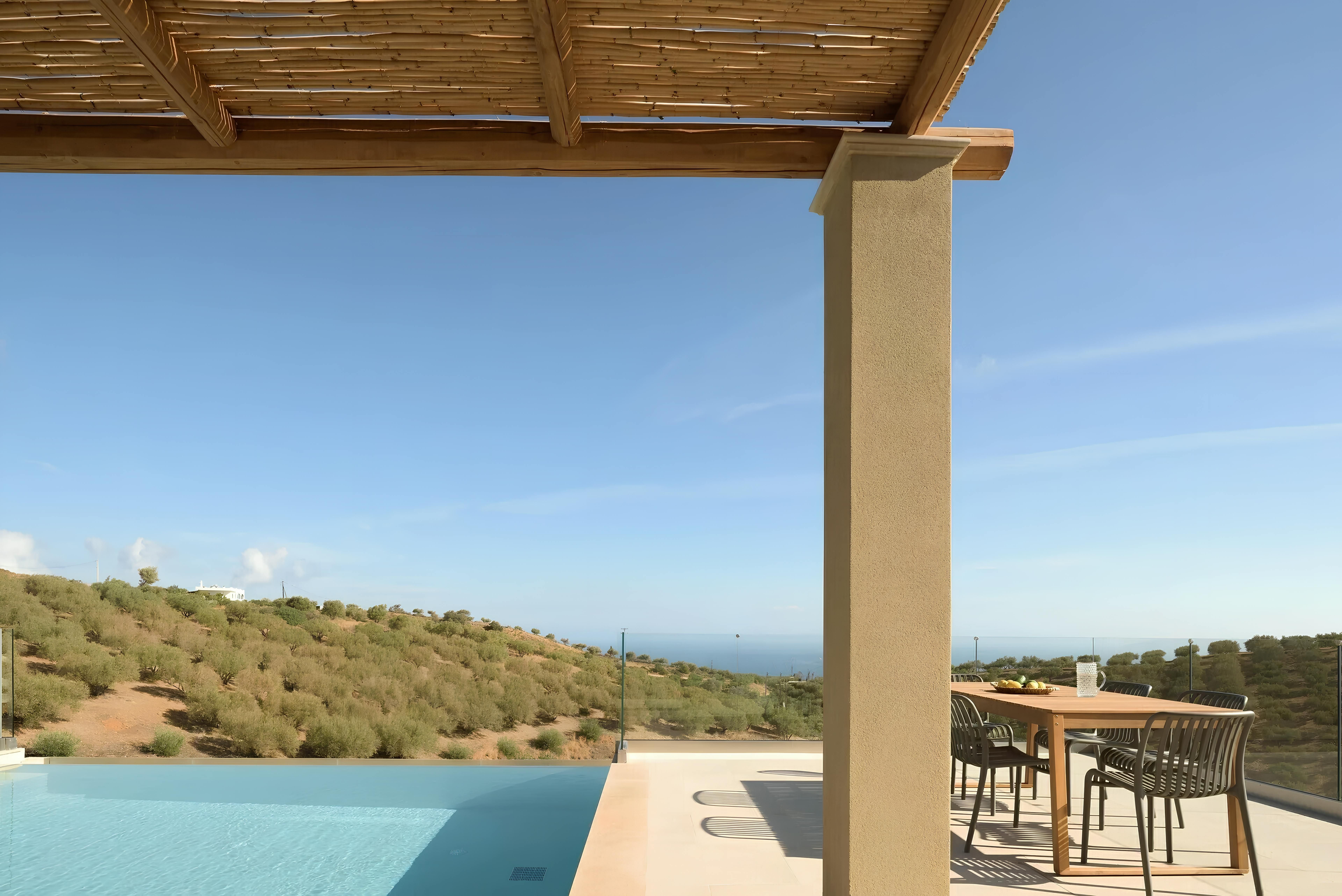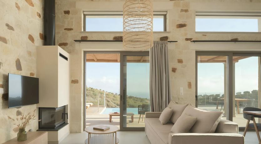 This hilltop home caught our eye for its sea views – best enjoyed while relaxing by the private pool or dining alfresco. Combining traditional Cretan architecture and contemporary features, the villa is light and airy, and perfectly positioned windows make the most of the surrounding scenery. If a day at the beach is on the cards, the nearest is 2.5 kilometres away. Or you can make the 3-kilometre drive to the coastal villages of Agia Pelagia and Lygaria, where you’ll find a choice of cafes, restaurants, and shops.