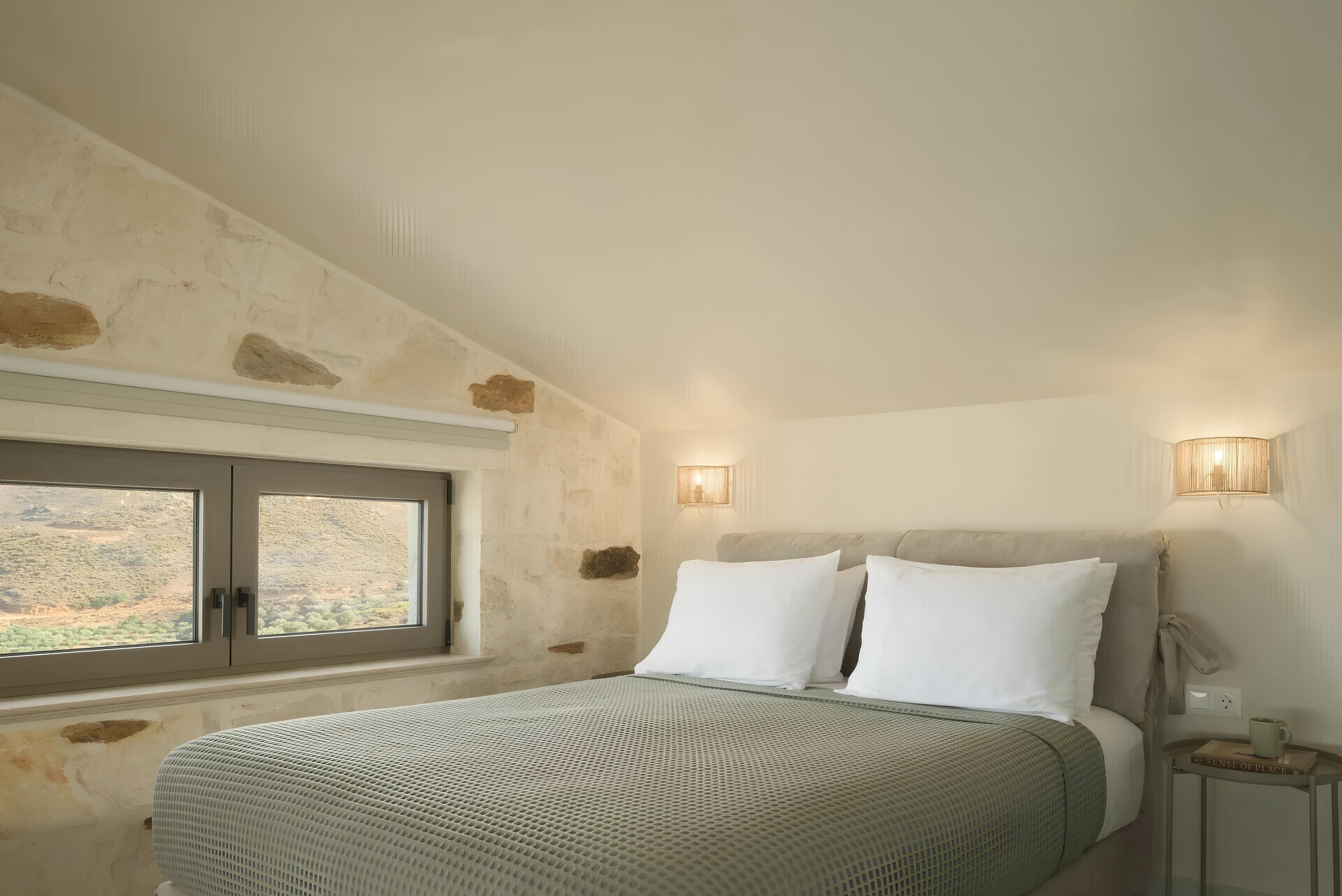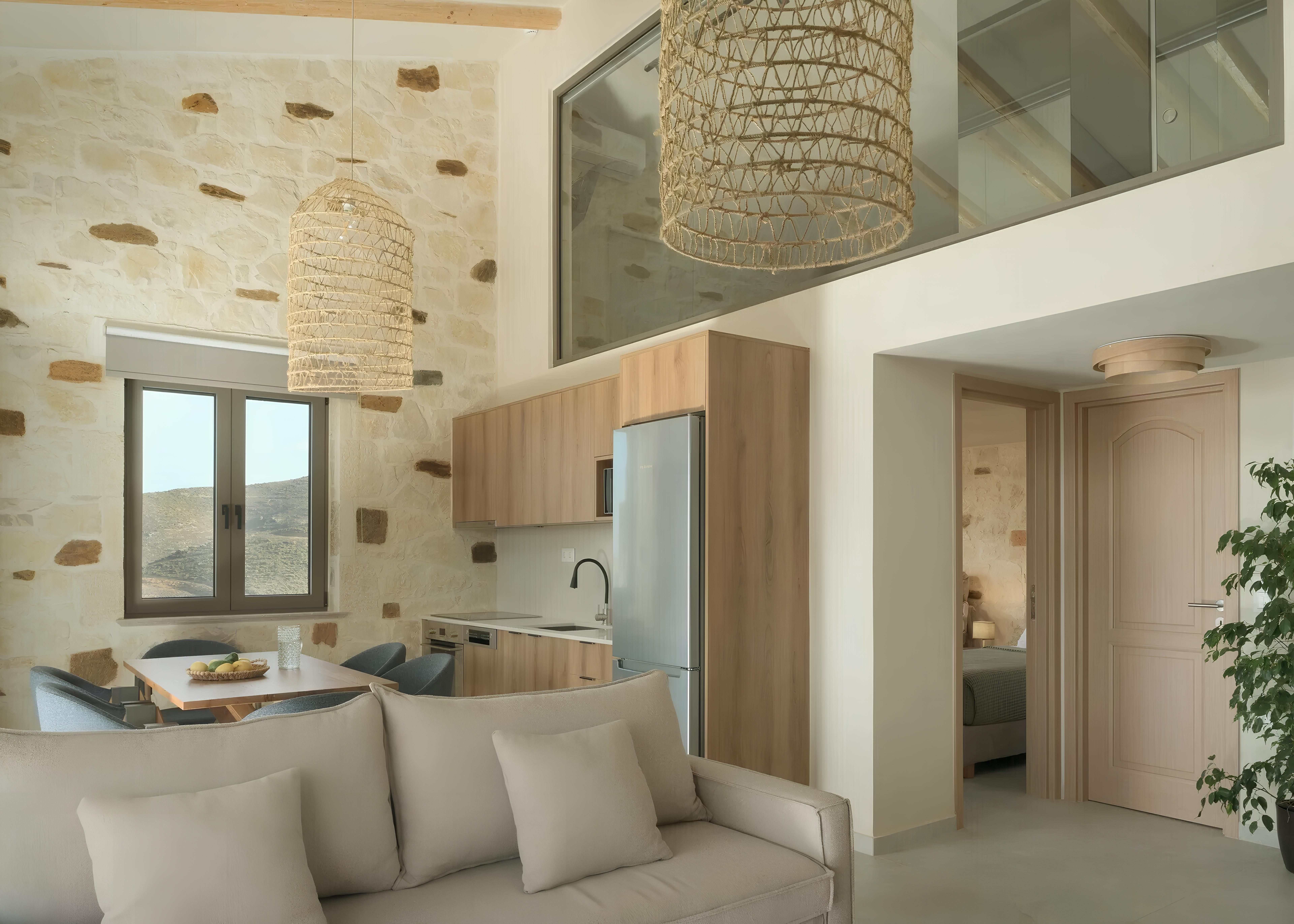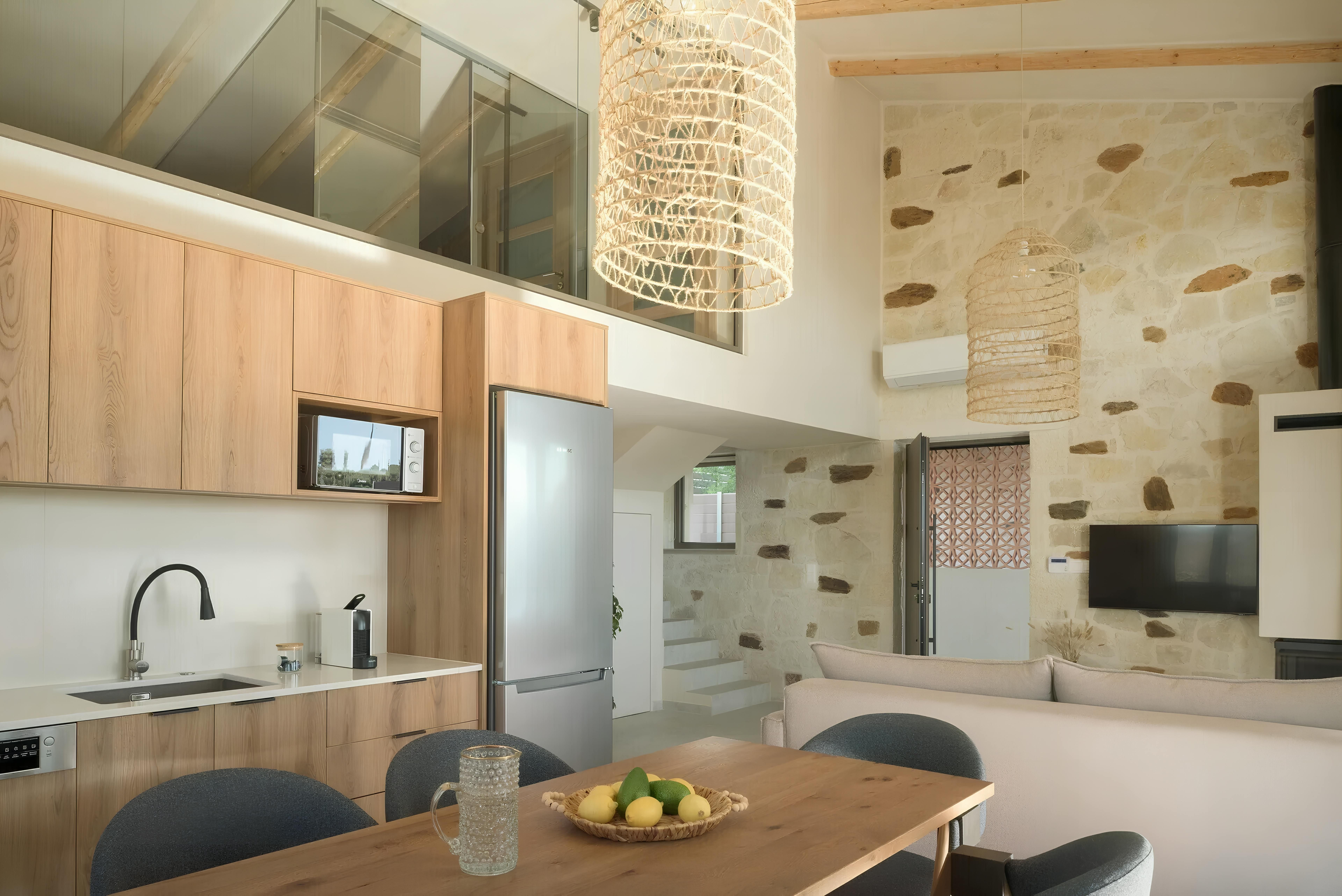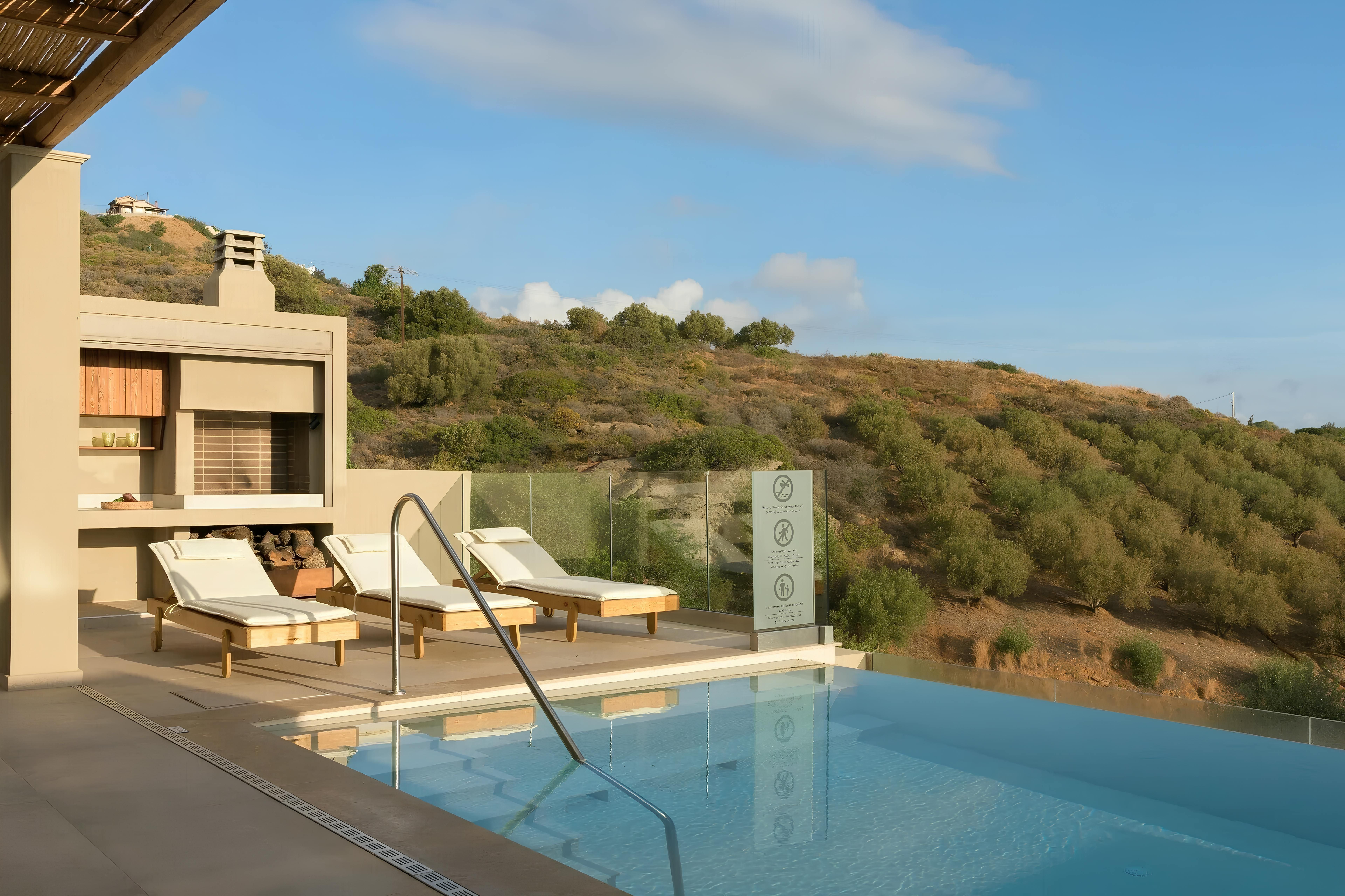 This hilltop home caught our eye for its sea views – best enjoyed while relaxing by the private pool or dining alfresco. Combining traditional Cretan architecture and contemporary features, the villa is light and airy, and perfectly positioned windows make the most of the surrounding scenery. If a day at the beach is on the cards, the nearest is 2.5 kilometres away. Or you can make the 3-kilometre drive to the coastal villages of Agia Pelagia and Lygaria, where you’ll find a choice of cafes, restaurants, and shops.
