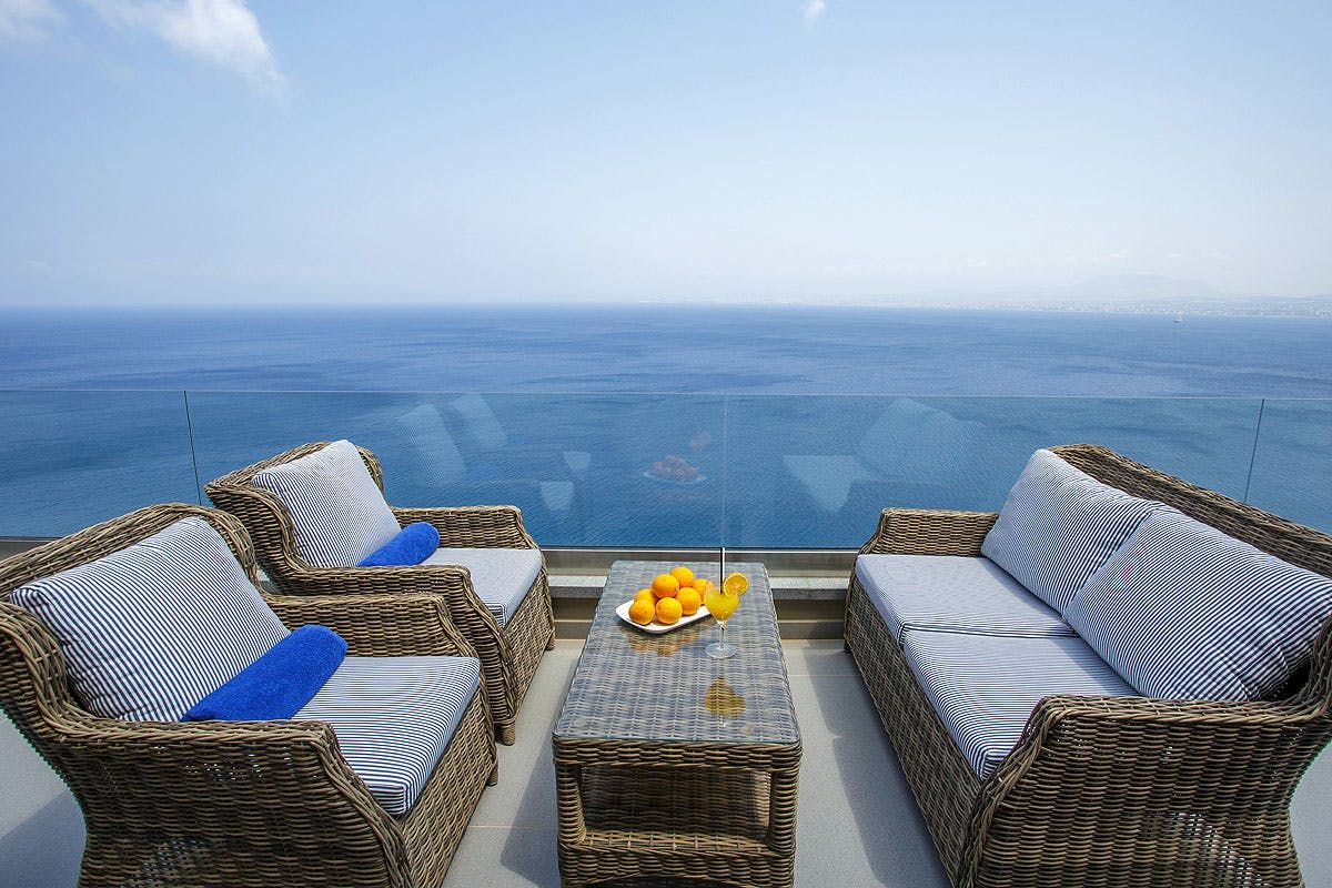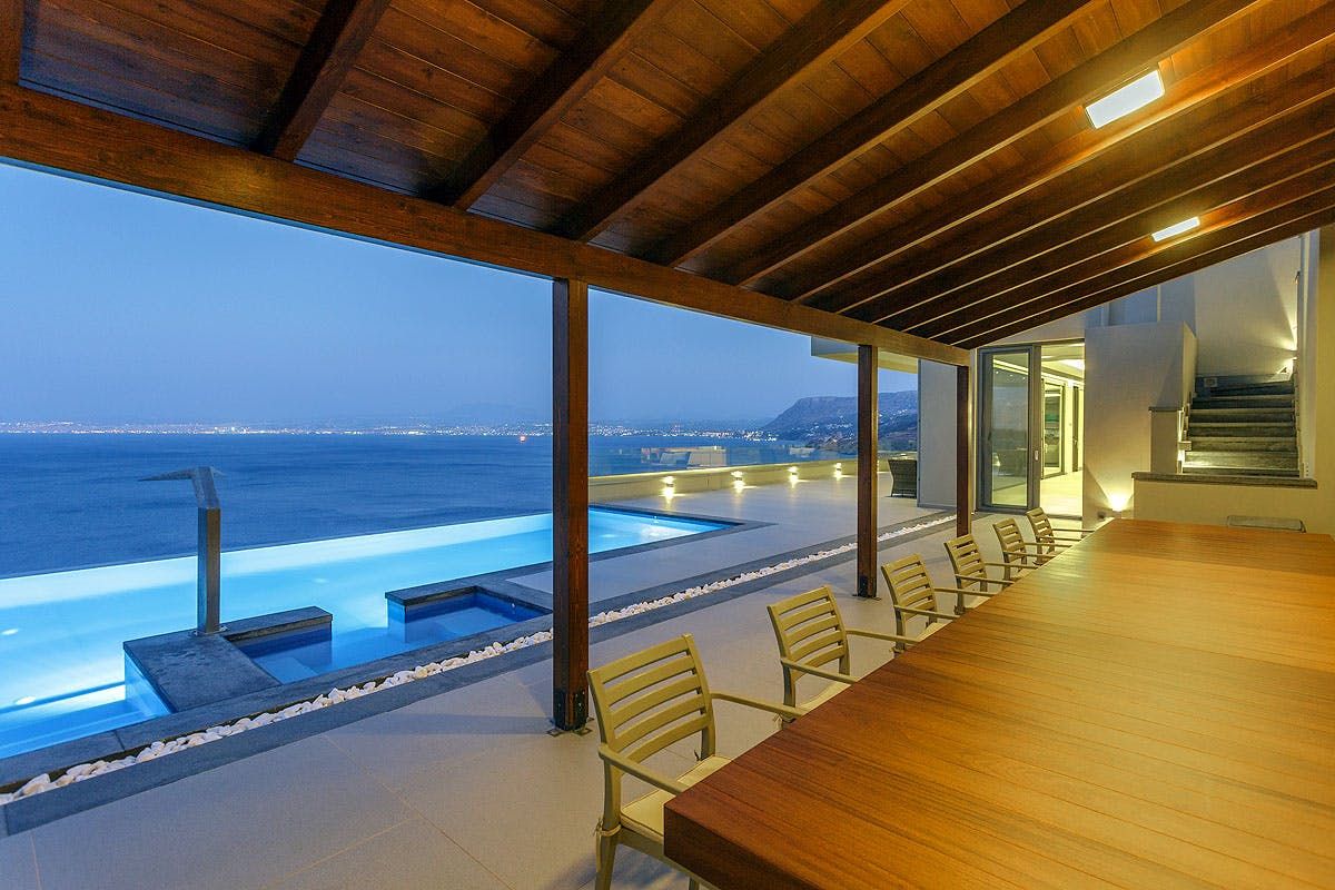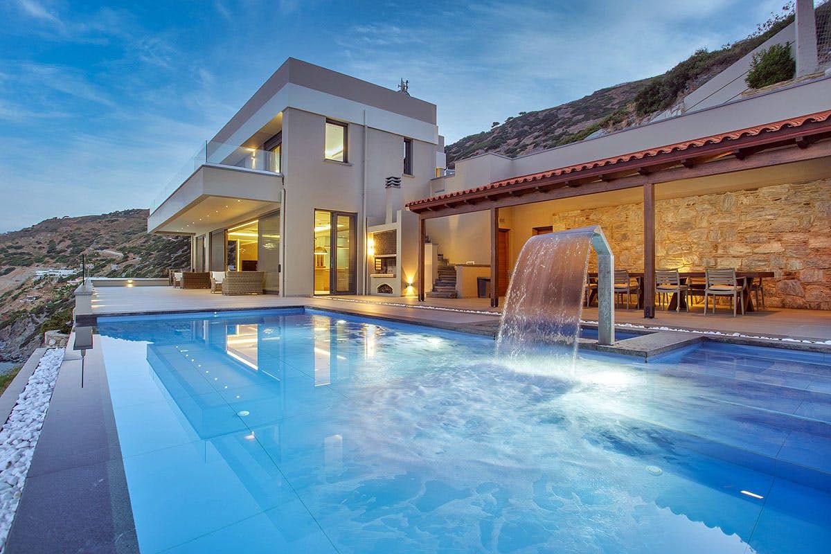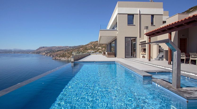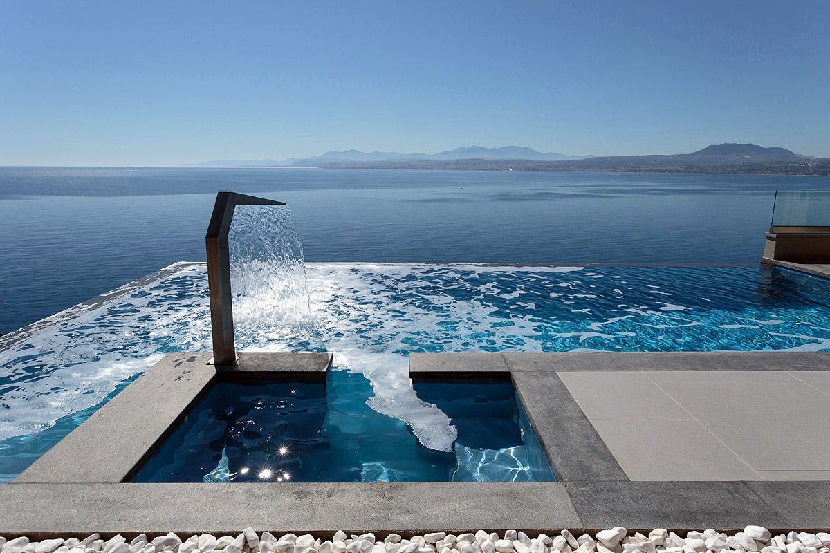 Feeling blue? This sea-facing villa has unbeatable balcony views over the Gulf of Heraklion for alfresco dining. The outdoor living space sells itself by boasting a waterfall-featured infinity pool and a jacuzzi. Hidden gems await indoors too, including a home gym, a wine cellar, plus a room to accommodate a nanny or housekeeper. Down a 180-metre-long path, you'll find a private beach tucked away from the world, but guests with reduced mobility will discover the sands of Panagia a short drive from here.