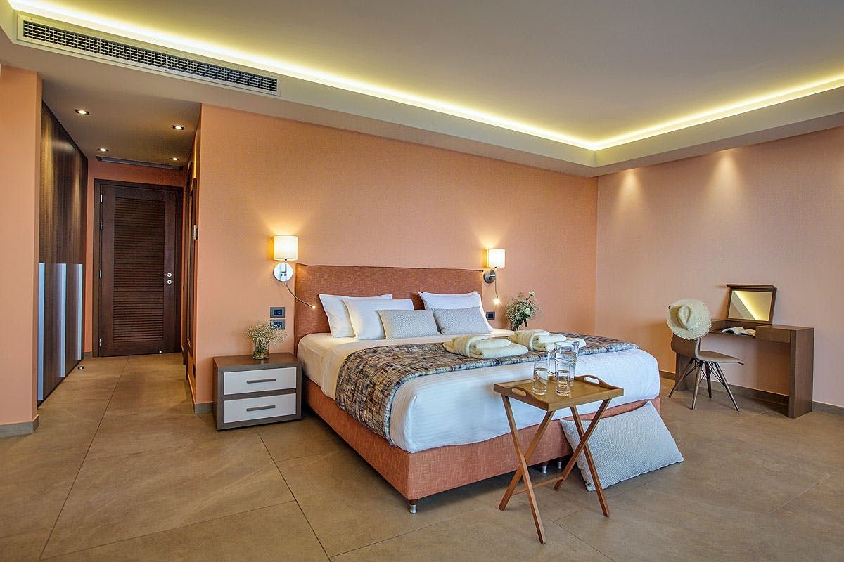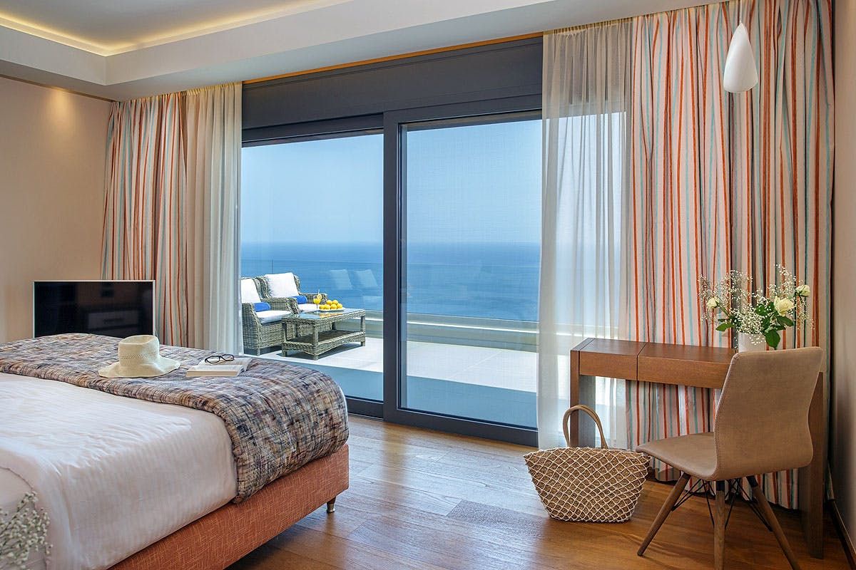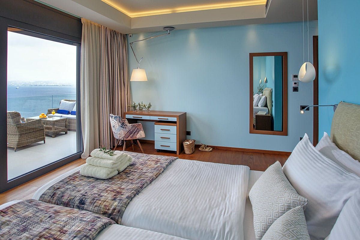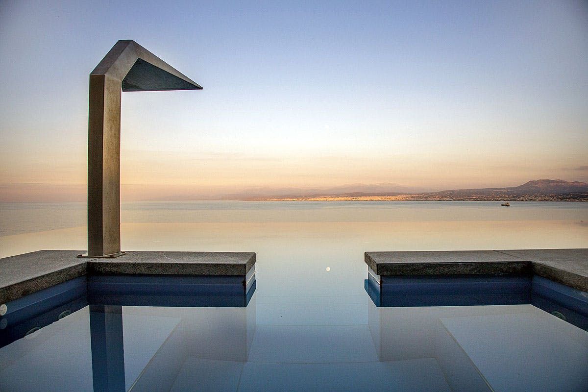 Feeling blue? This sea-facing villa has unbeatable balcony views over the Gulf of Heraklion for alfresco dining. The outdoor living space sells itself by boasting a waterfall-featured infinity pool and a jacuzzi. Hidden gems await indoors too, including a home gym, a wine cellar, plus a room to accommodate a nanny or housekeeper. Down a 180-metre-long path, you'll find a private beach tucked away from the world, but guests with reduced mobility will discover the sands of Panagia a short drive from here.