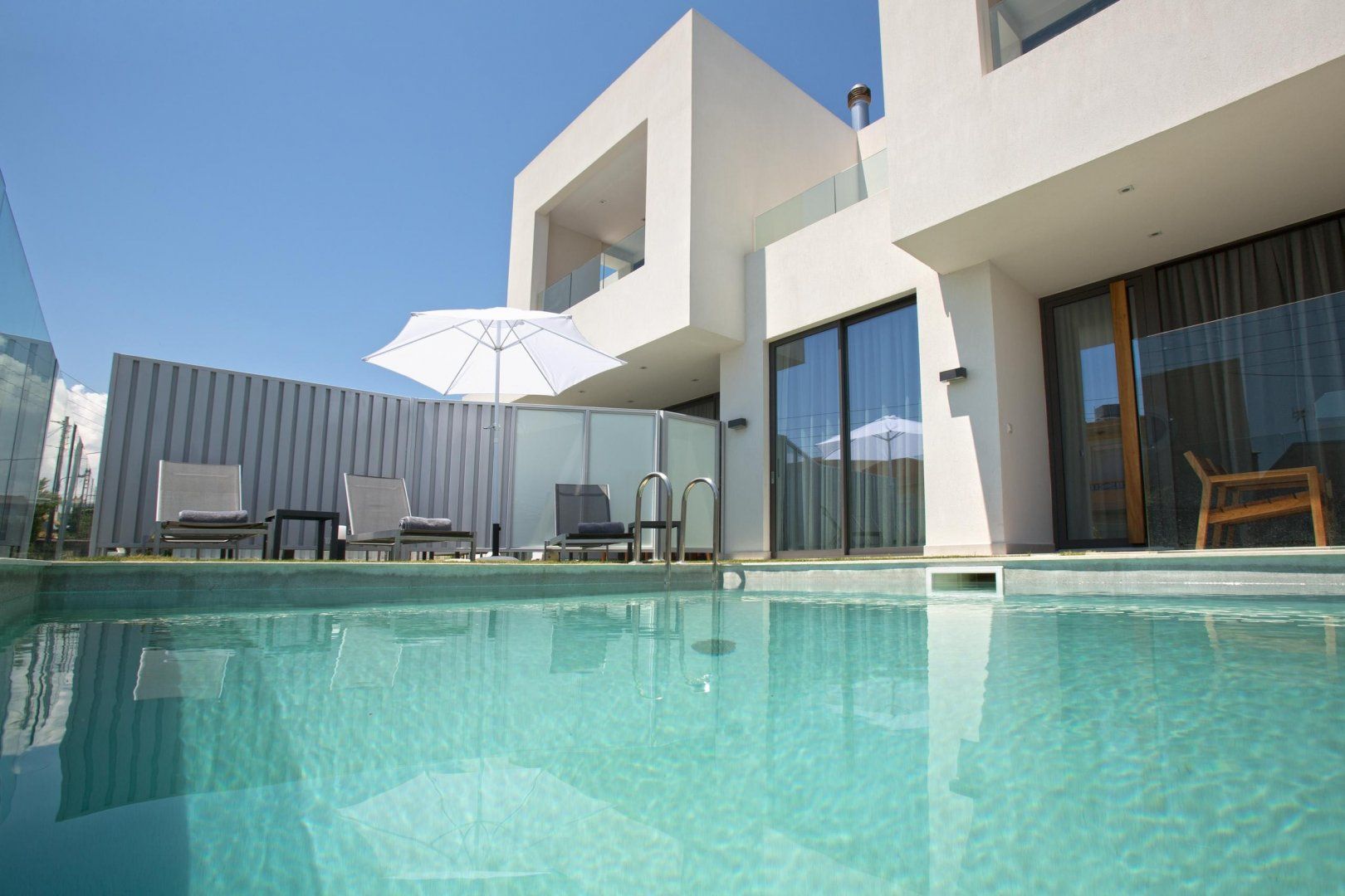 The outside space is the star of the show here, and your crystal clear private pool takes up the majority of your garden, with a glass safety barrier to two sides. There's a lawn with sun loungers, a covered dining terrace for long, lazy meals outside and private balconies to the top floor bedrooms to make the most of the far-reaching views.