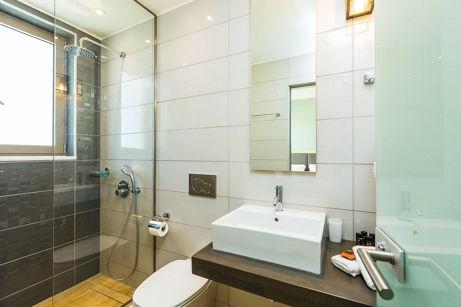 *The main bedroom's en-suite is partially open-plan, though only the sink is in view. The rest of the bathroom is located in an adjoining room.