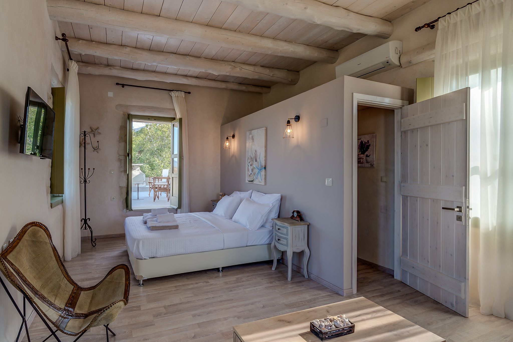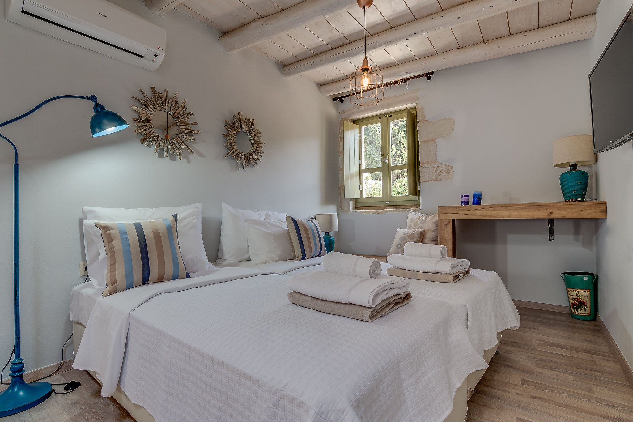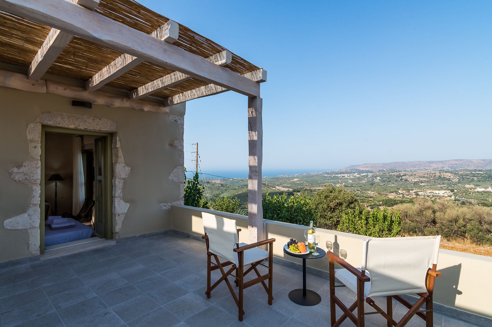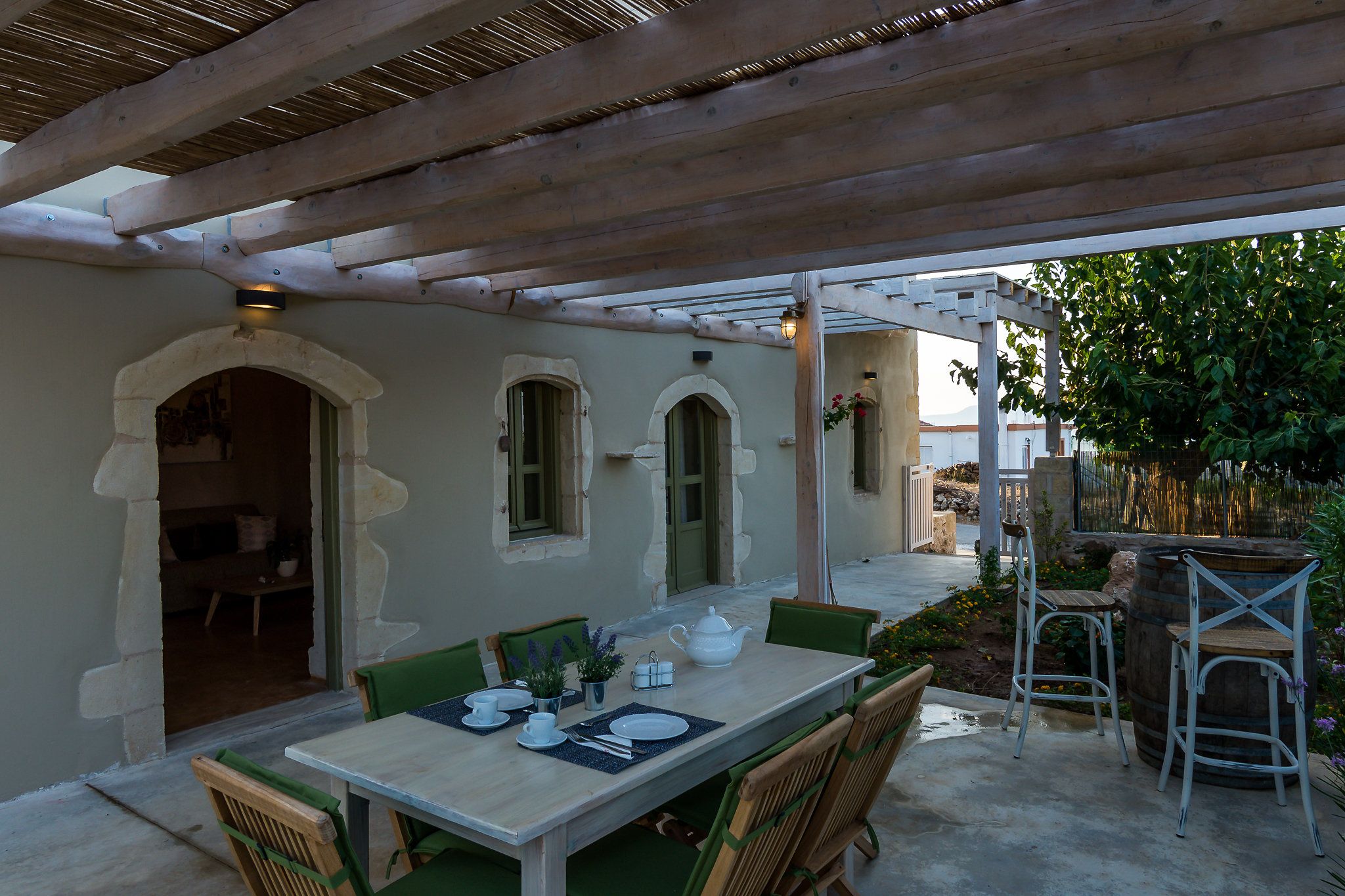 This traditional Cretan home is nestled in the village of Kastellos, just 5 kilometres from Georgioupolis beach. Surrounded by a peaceful garden, there is also a private swimming pool and beautiful views across the coast. Inside, the rooms are rustic and family-friendly with children’s amenities available on request. Your host provides a welcome basket for your arrival and there is a concierge offering a range of extra services – including beauty treatments and car rentals. From here, you can stroll to the nearest taverna (just 100 metres away) and you’ll find Chania and Rethymno both within a thirty-minute drive.