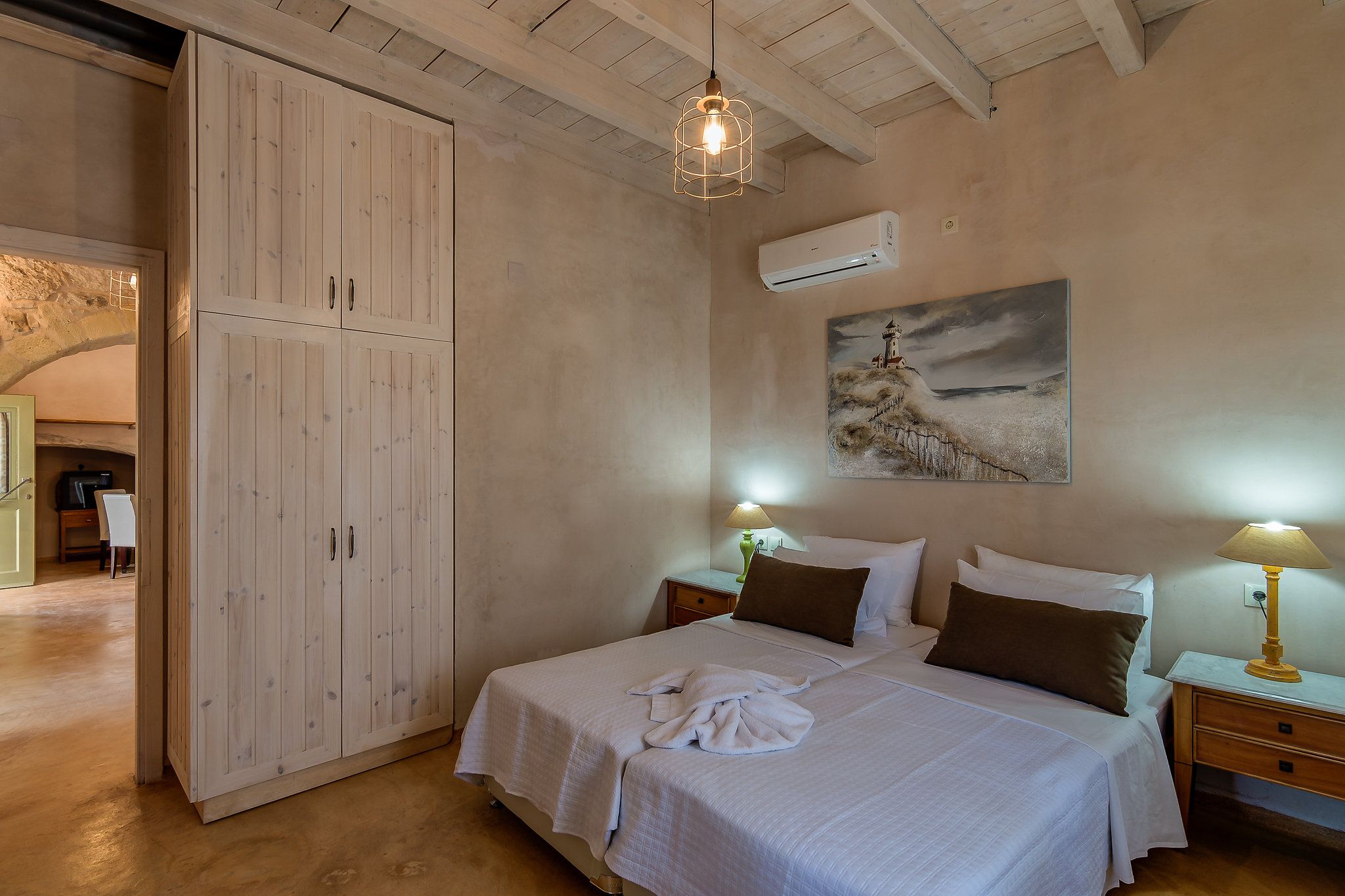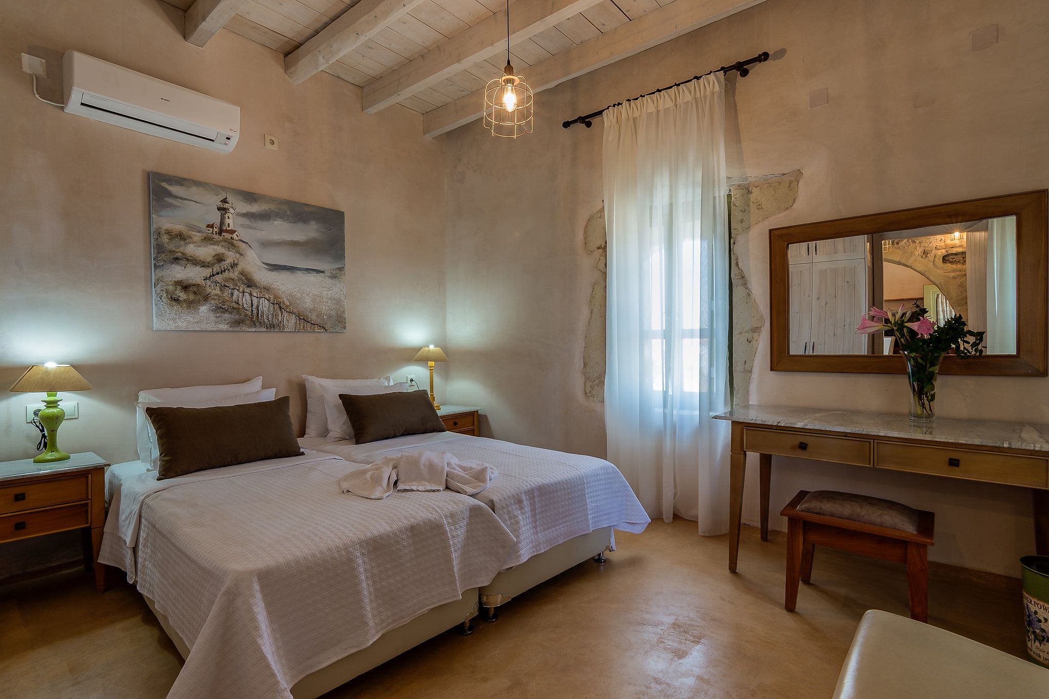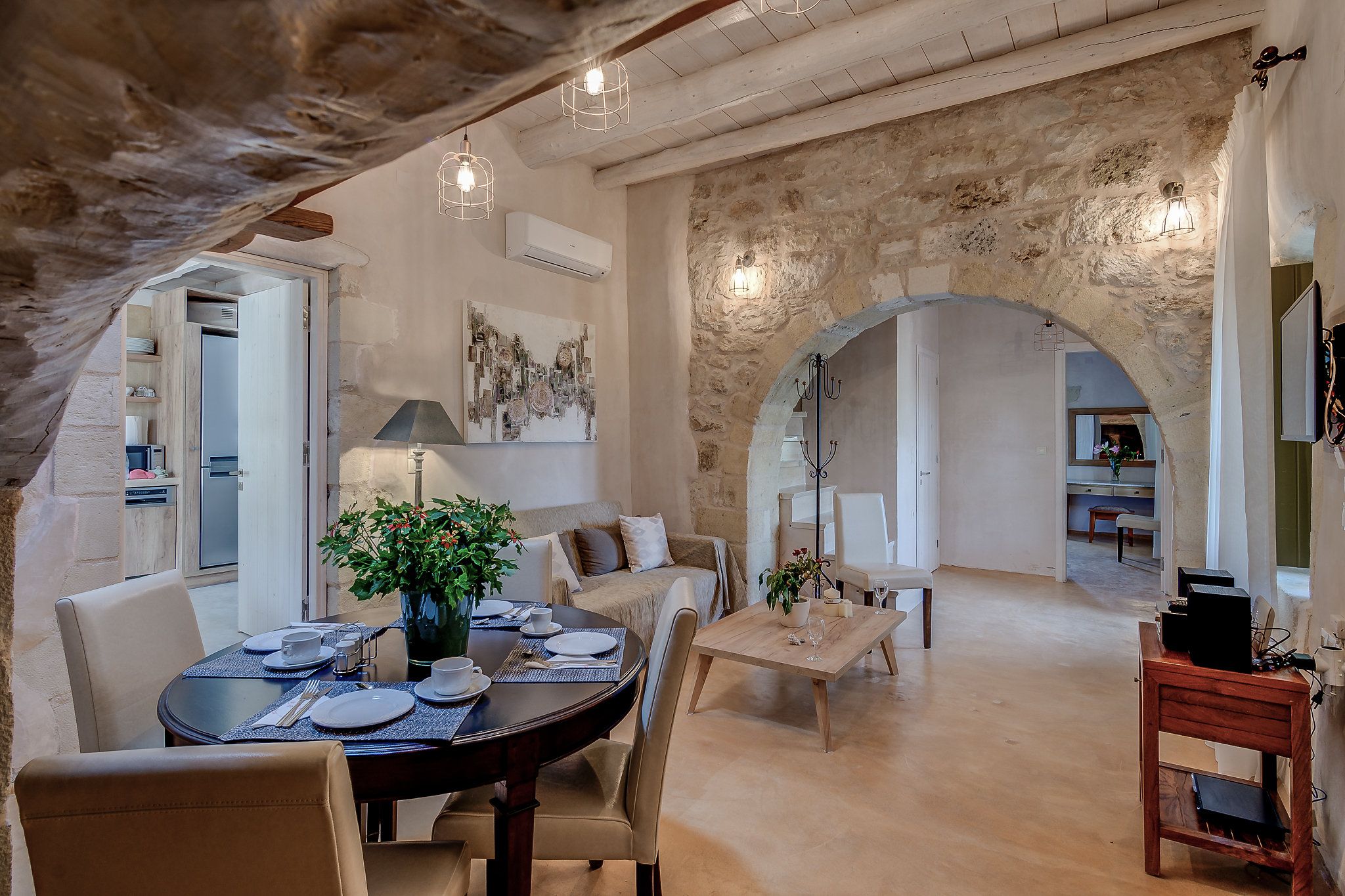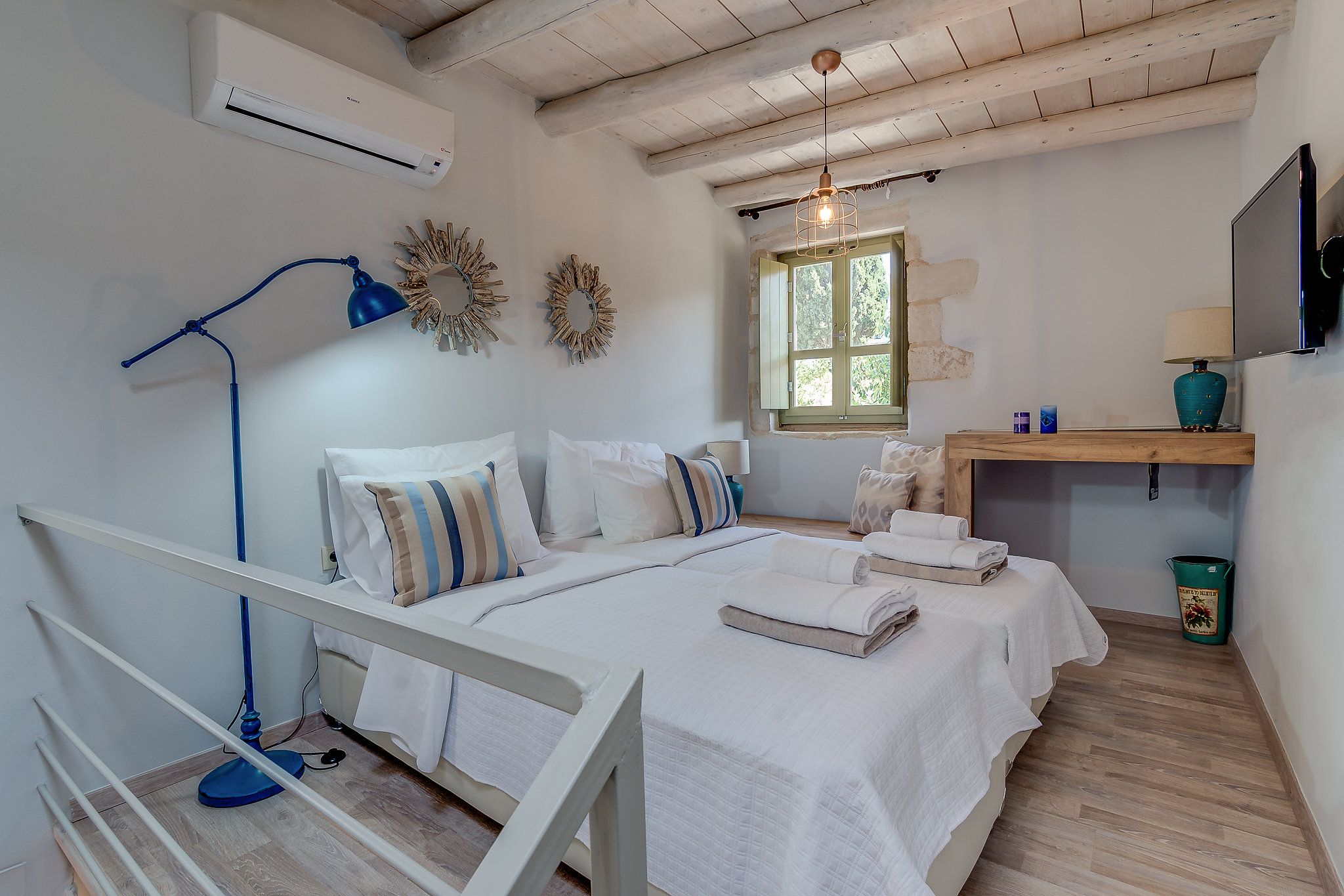 This traditional Cretan home is nestled in the village of Kastellos, just 5 kilometres from Georgioupolis beach. Surrounded by a peaceful garden, there is also a private swimming pool and beautiful views across the coast. Inside, the rooms are rustic and family-friendly with children’s amenities available on request. Your host provides a welcome basket for your arrival and there is a concierge offering a range of extra services – including beauty treatments and car rentals. From here, you can stroll to the nearest taverna (just 100 metres away) and you’ll find Chania and Rethymno both within a thirty-minute drive.