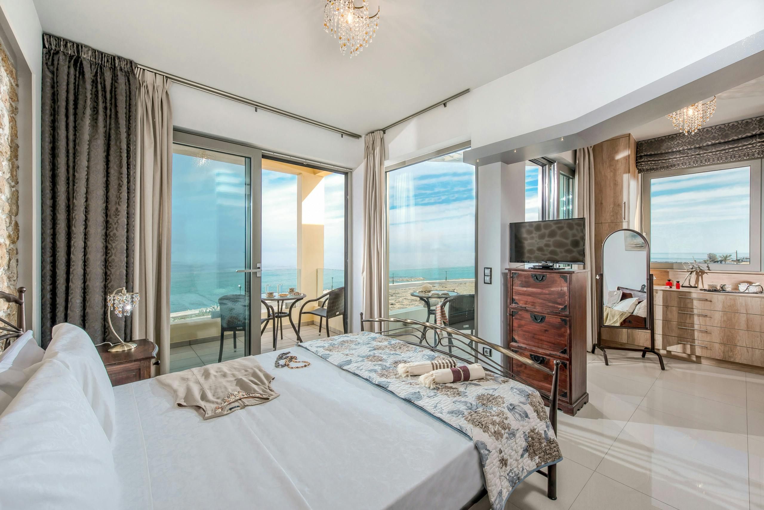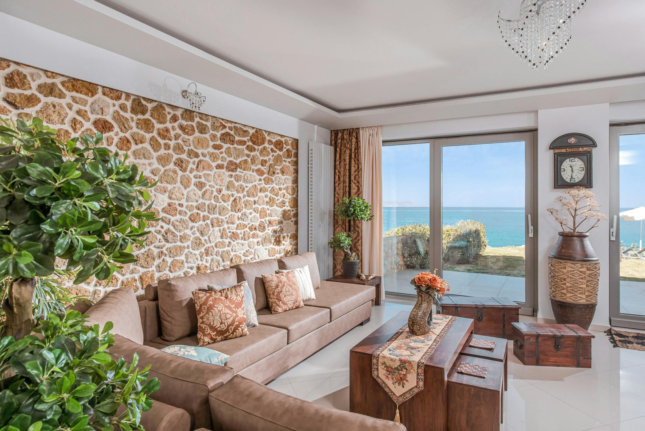 Footsteps from Gouves Beach, this waterfront villa is all about switching off in the sunshine. The garden features dining and lounging areas, all with views of the Cretan coast, soundtracked by the gentle rhythm of the waves. Inside, there’s a playroom to keep the little ones entertained and a gym for the fitness fans among you. The interiors could do with a refresh, but the beds are comfortable, and with sea and sand right on your doorstep, we don’t think you’ll mind too much. For shopping, dining and historic hotspots, check out Heraklion town, seventeen kilometres away.