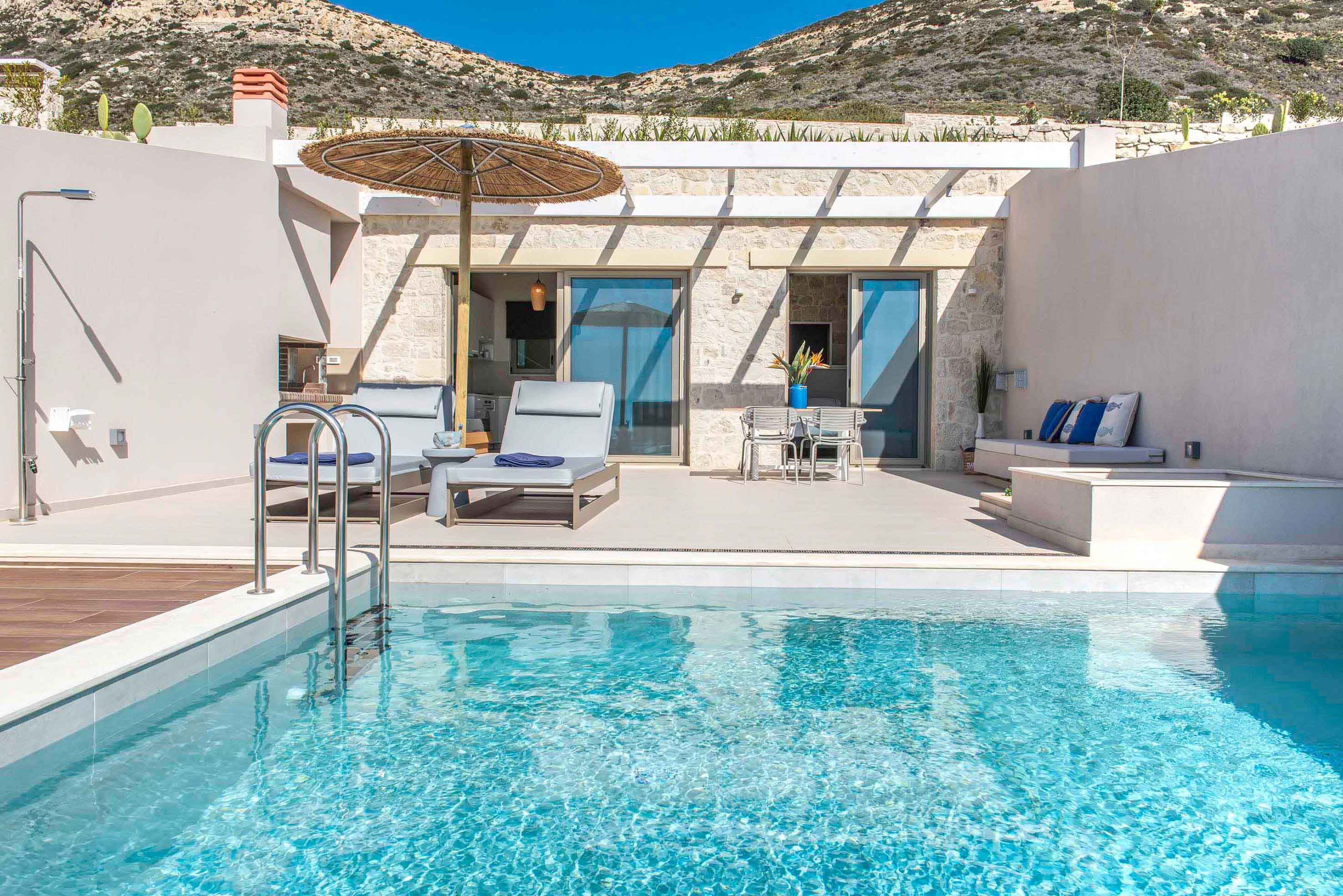 Large families, multi-generational gatherings and groups of friends in search of a beach retreat should look no further than these three villas located just steps away from Falassarna Beach. The property is divided into two villas, each with three bedrooms, a kitchen and living space. A separate studio apartment enjoys sliding doors onto a private terrace with a pool, one of three belonging to the property. Spend your days alternating between the private pools and the nearby beach, or explore other coastal favourites such as Elafonissi Beach or Balos Lagoon. The traditional village of Platanos is a few minutes away where you will find some excellent local tavernas.