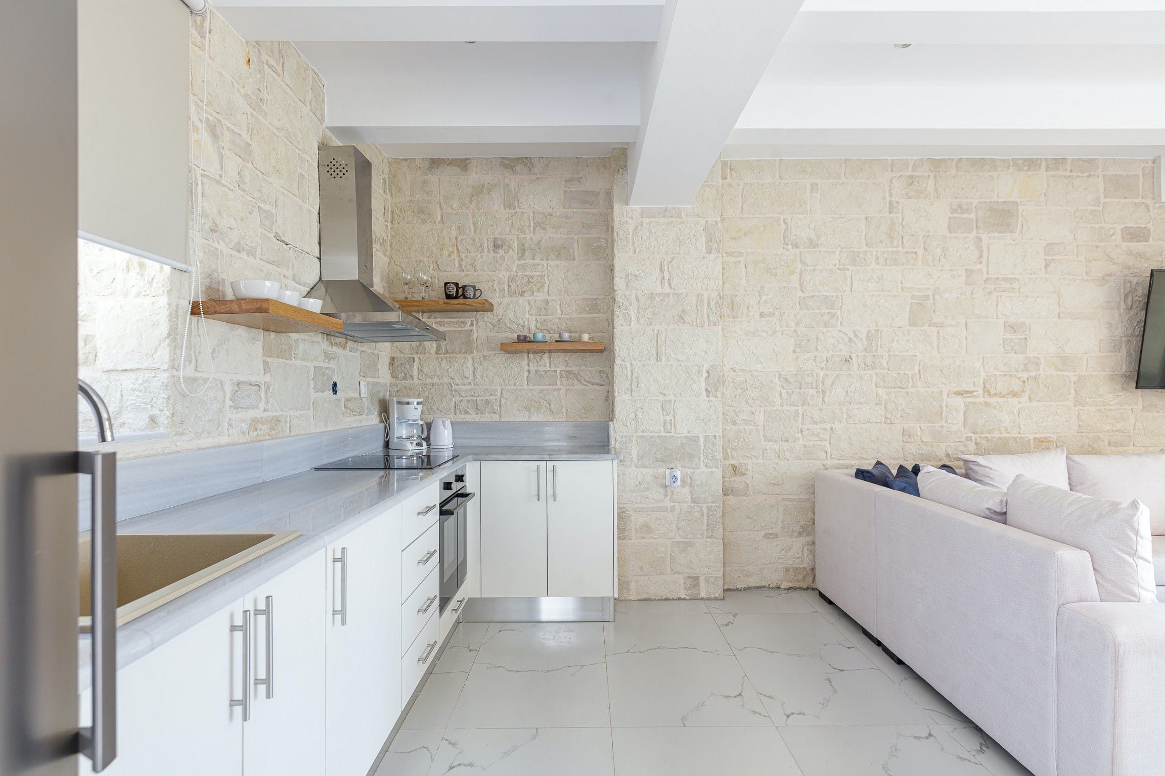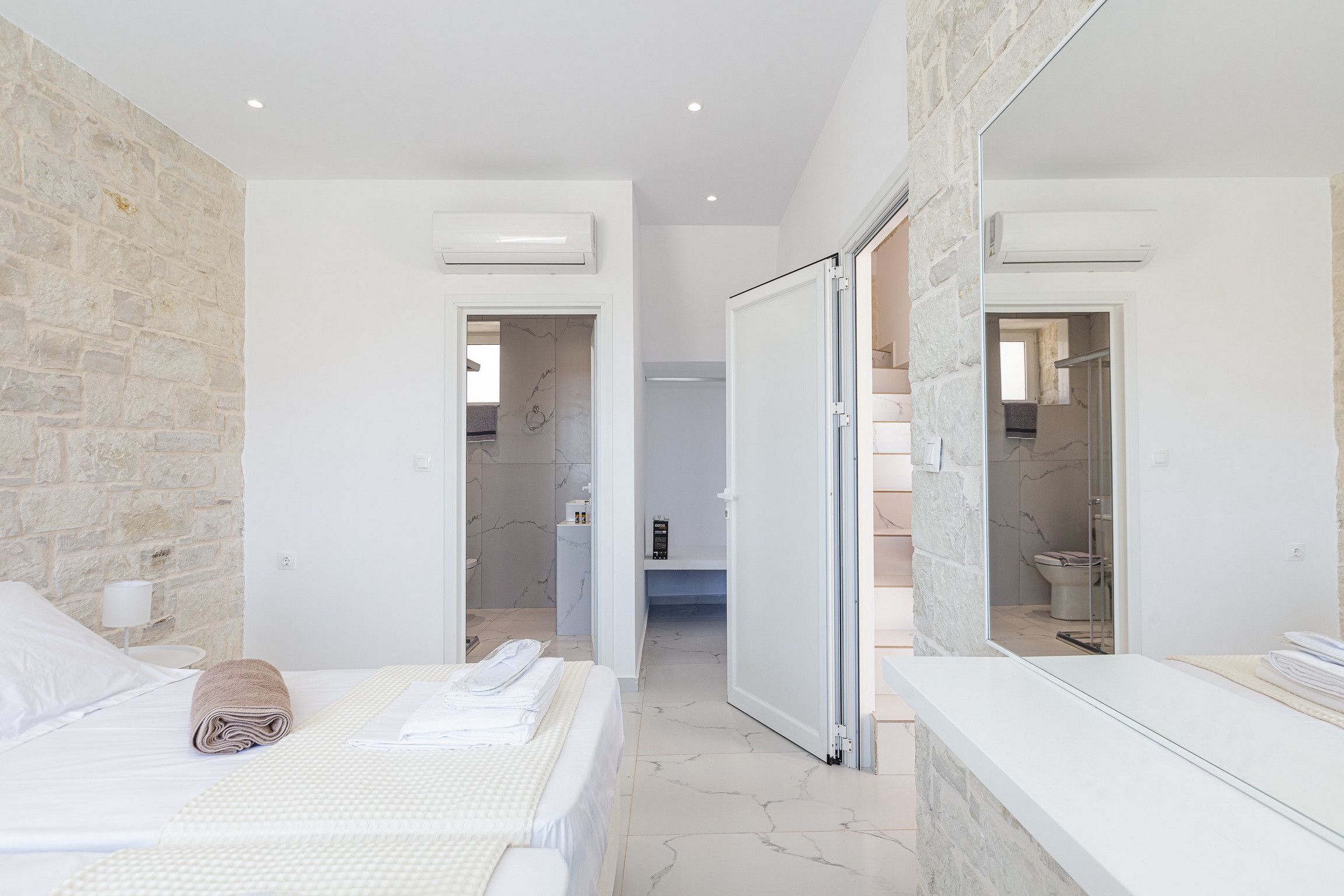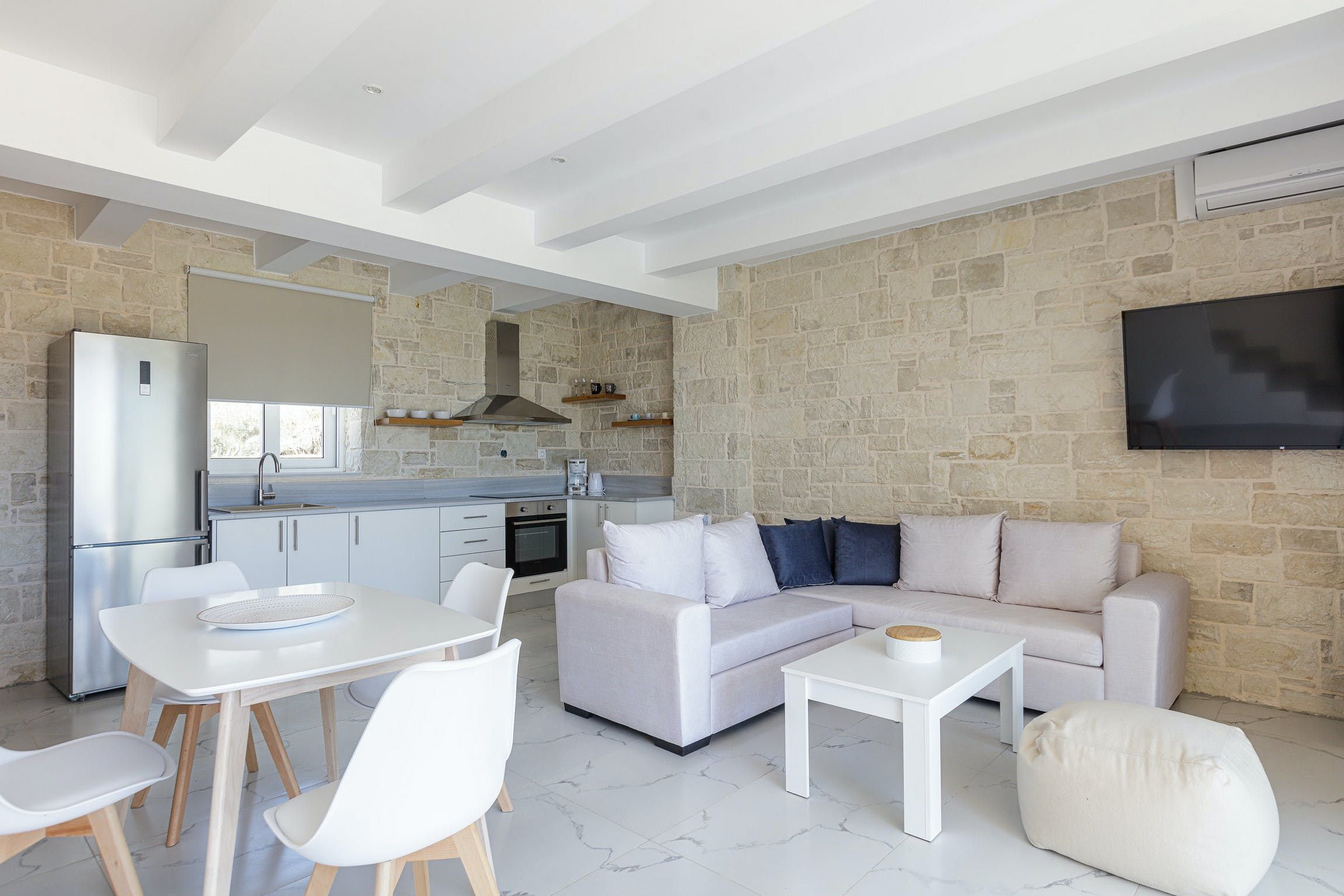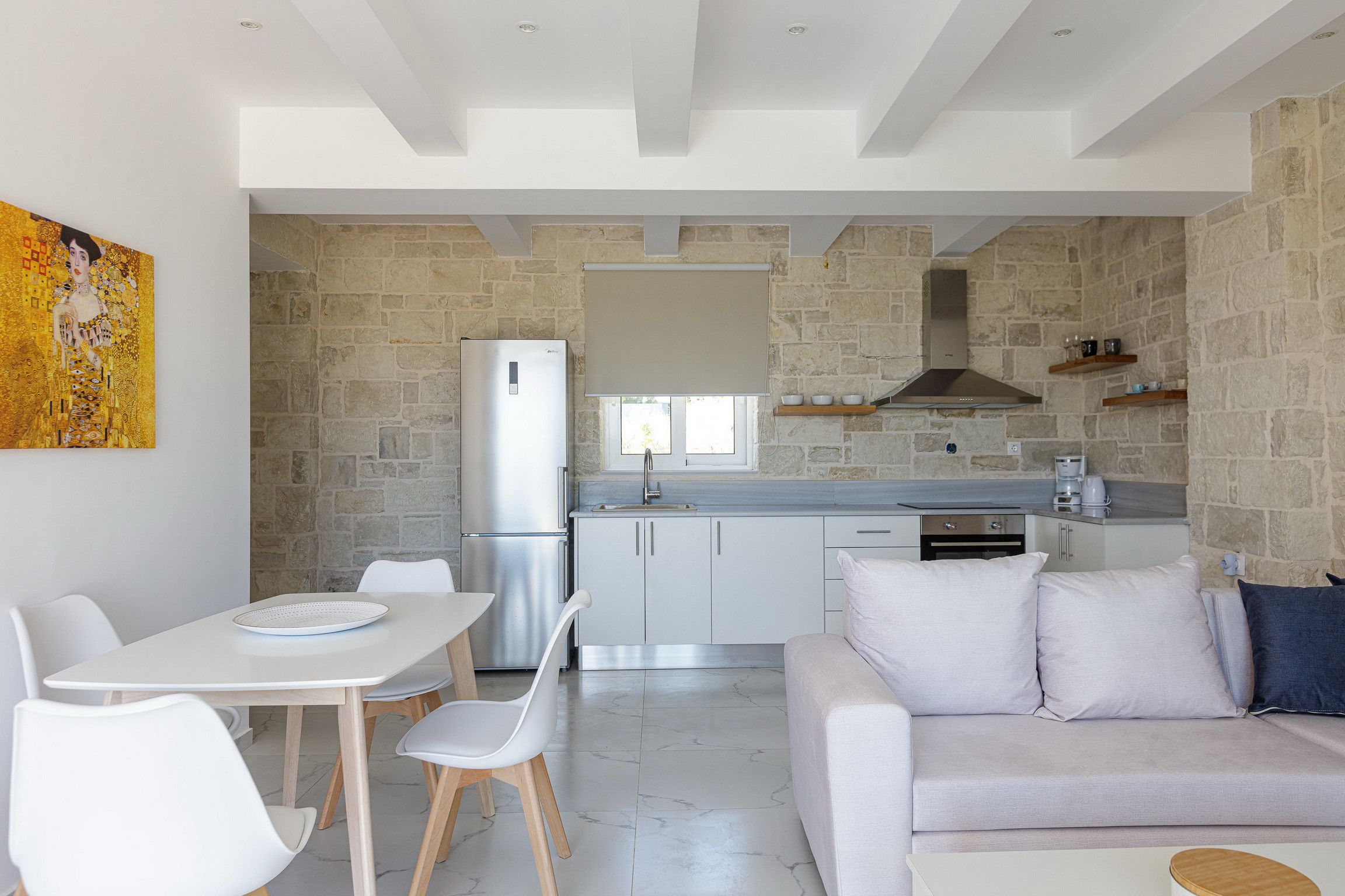 Stepping inside, it's a seamless blend of traditional design, modern styling and muted tones that creates a calm and comfortable place to call home. We love the stone walls and white-painted timber ceilings, while the marble flooring and en-suite bathrooms adds that extra level of luxury.
