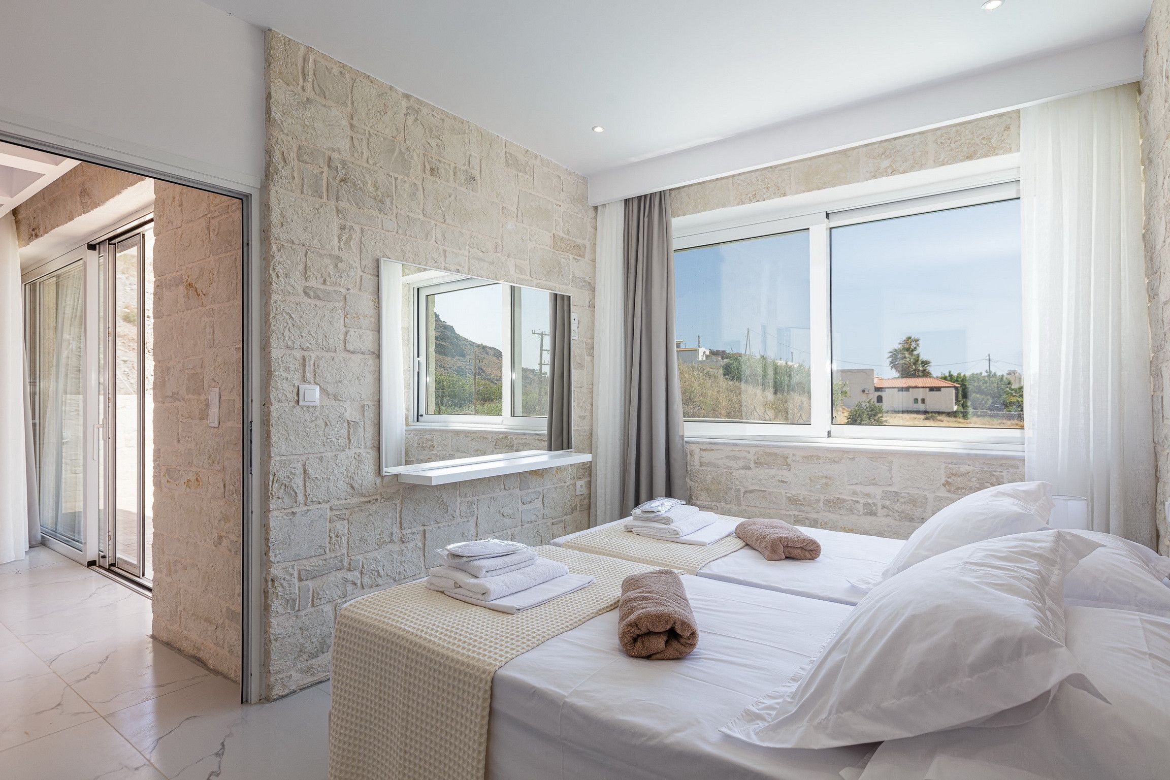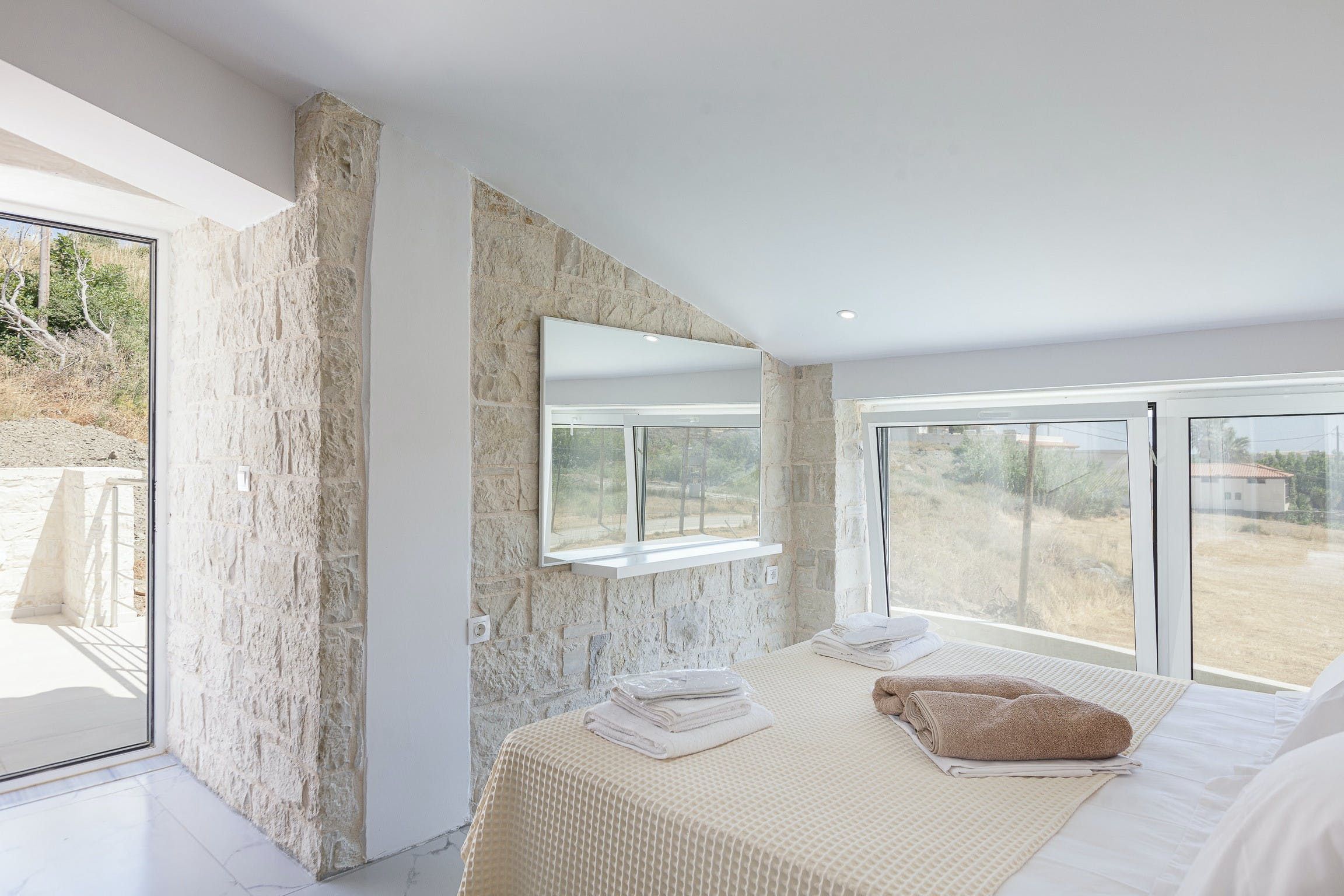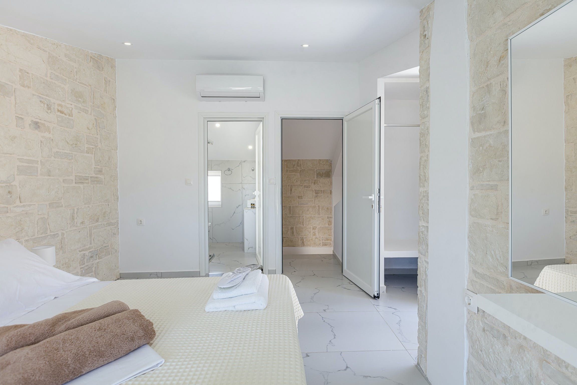 Stepping inside, it's a seamless blend of traditional design, modern styling and muted tones that creates a calm and comfortable place to call home. We love the stone walls and white-painted timber ceilings, while the marble flooring and en-suite bathrooms adds that extra level of luxury.