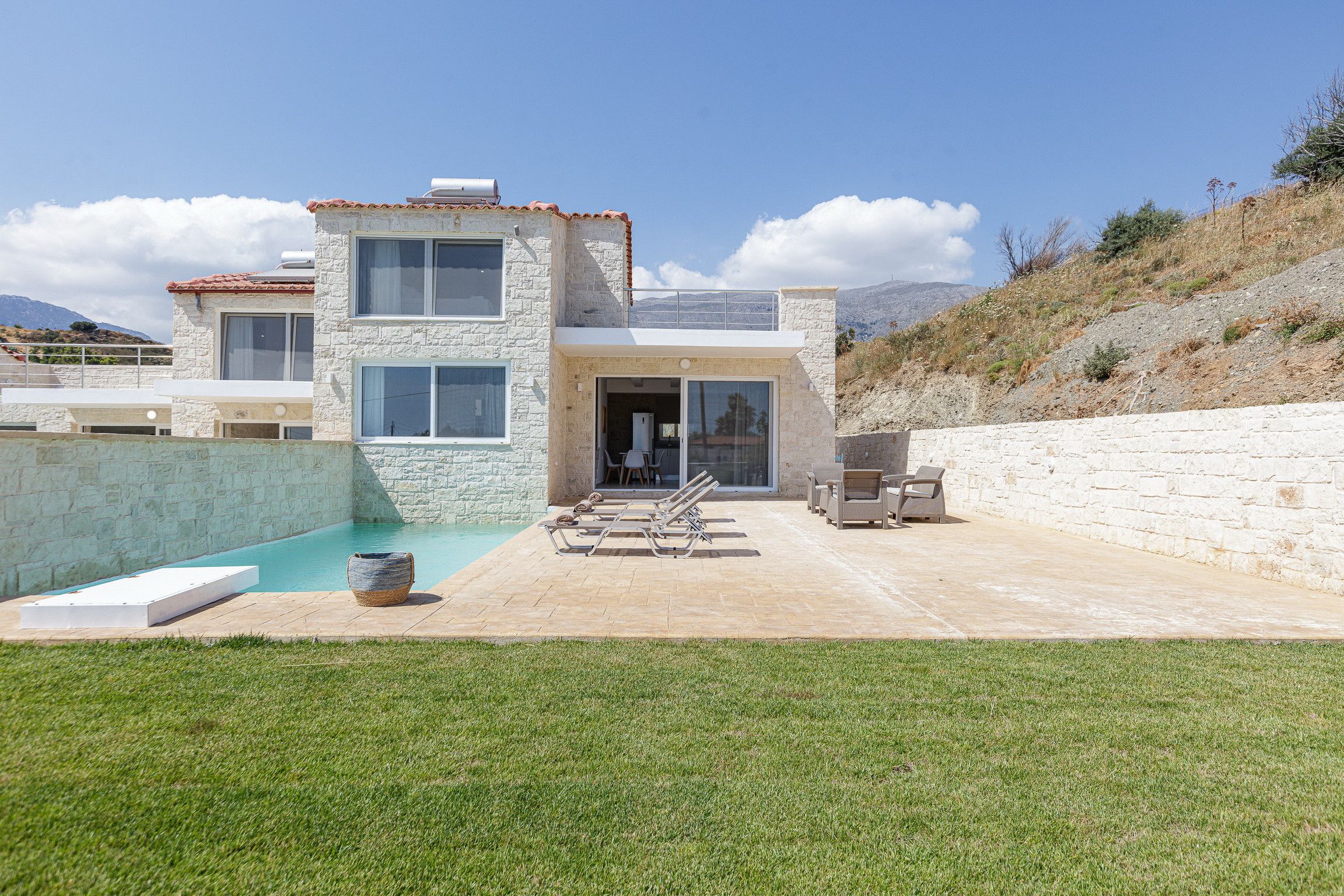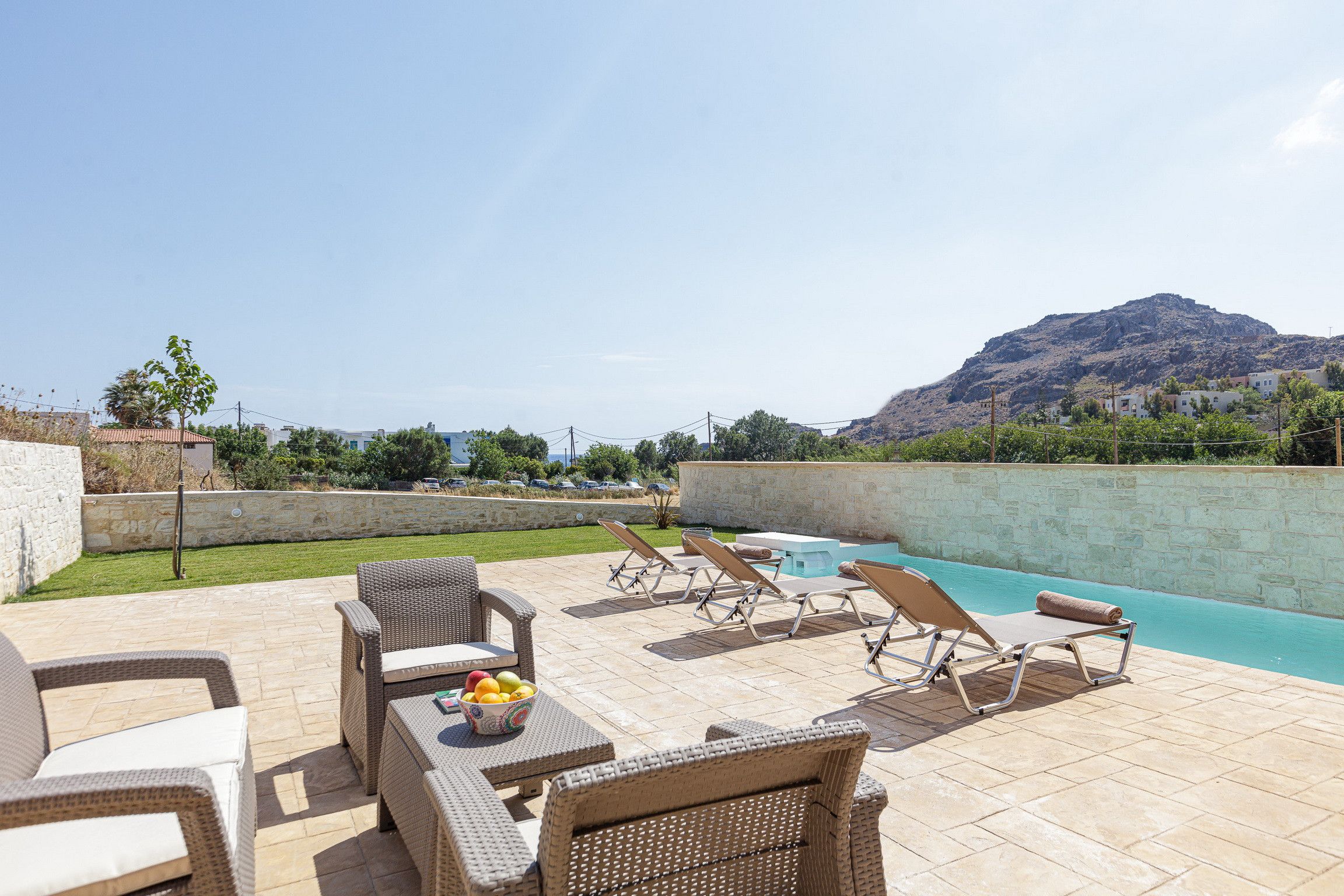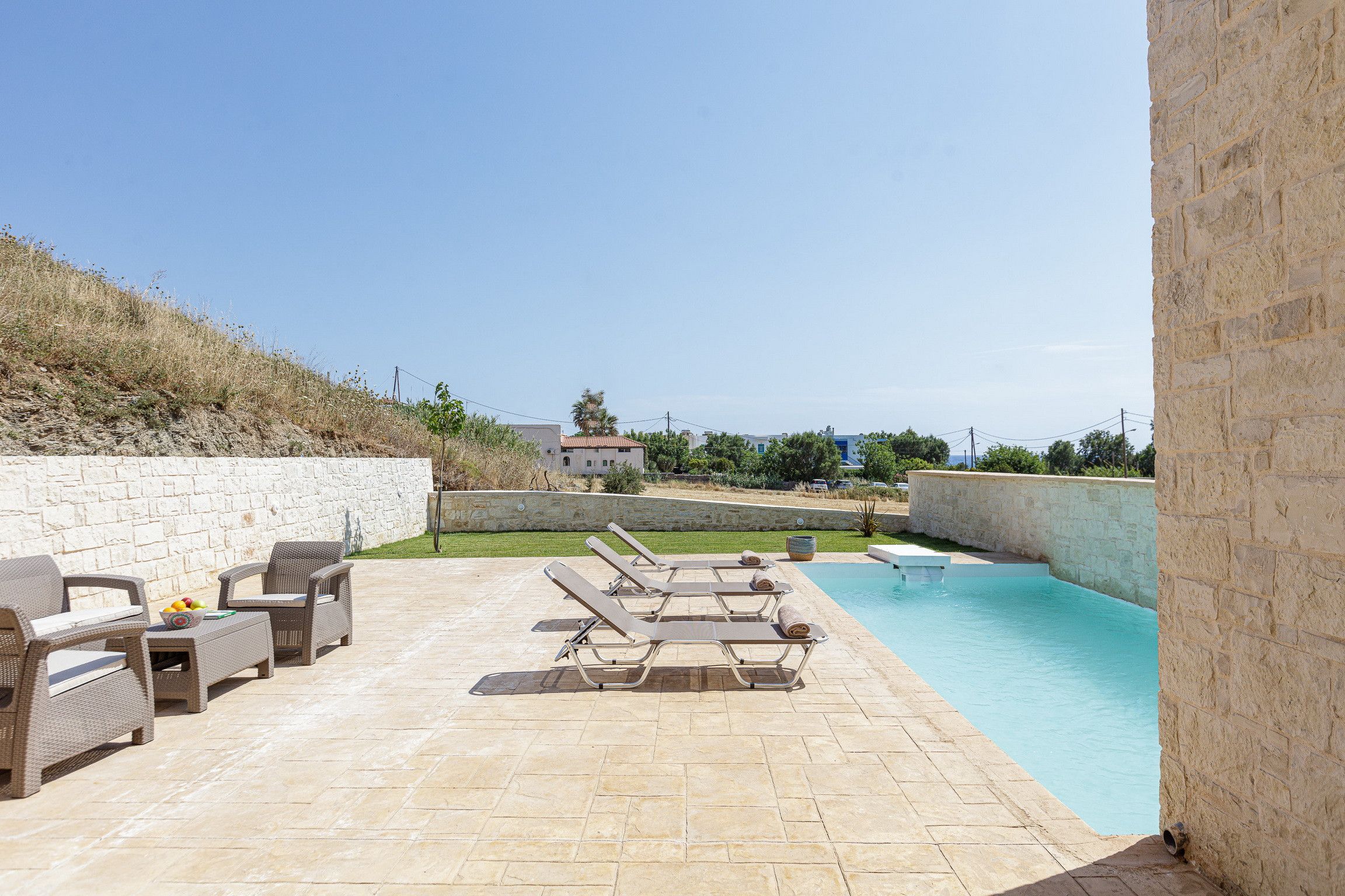 It's set back from the Mediterranean Sea, so you can also while away the sun-soaked afternoons from the peace and privacy of your villa. Cool down with a dip in your pool, before drying off on a sun lounger with your holiday read. When lunchtime arrives, serve up a tasty selection of breads and dips in the outdoor dining area.