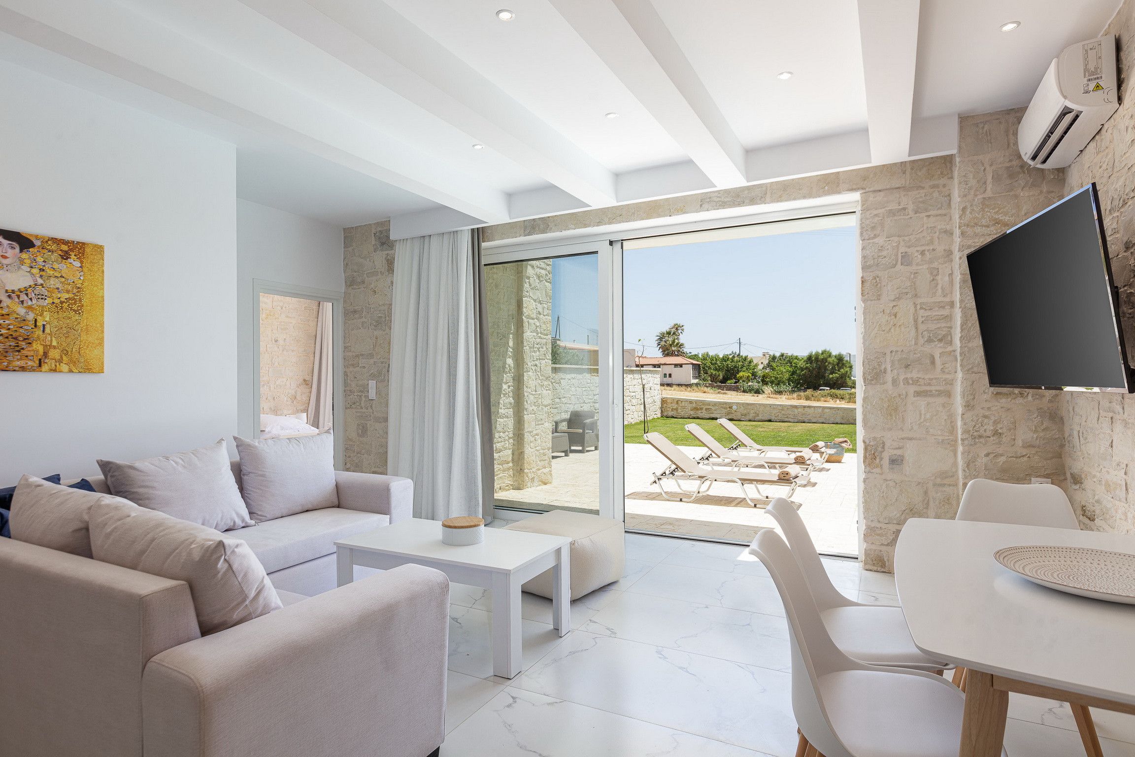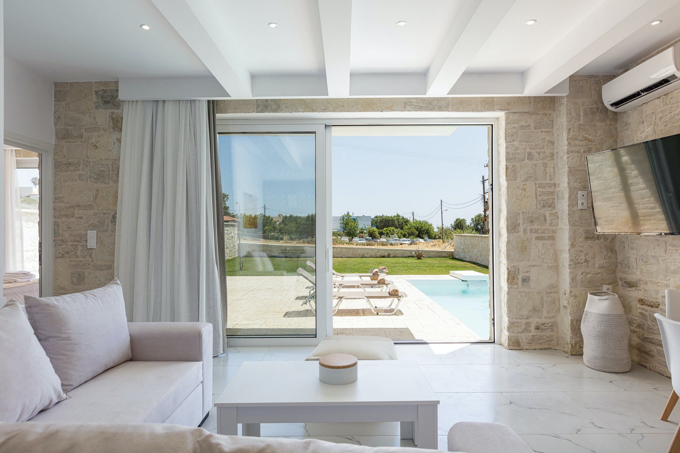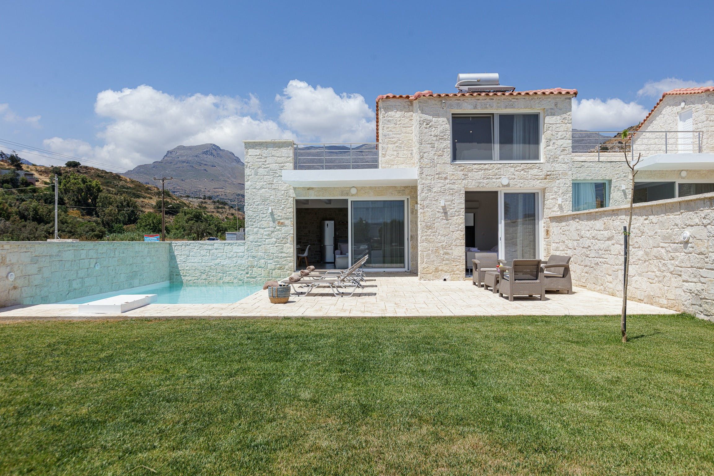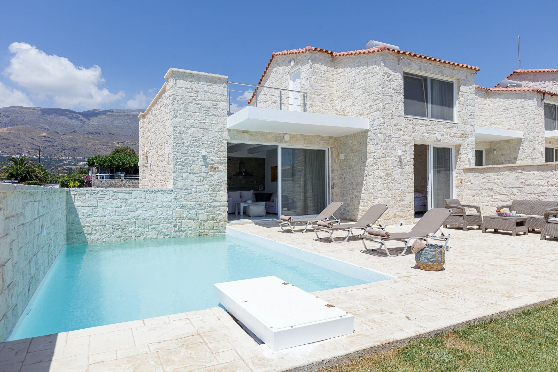 Most likely, the Mediterannean sun will invite you to dive into the sparkling pool or lounge out on sunbeds with your holiday read. As the golden hour approaches, gather in the outdoor lounge to share a glass or two of Vidiano with your loved ones.