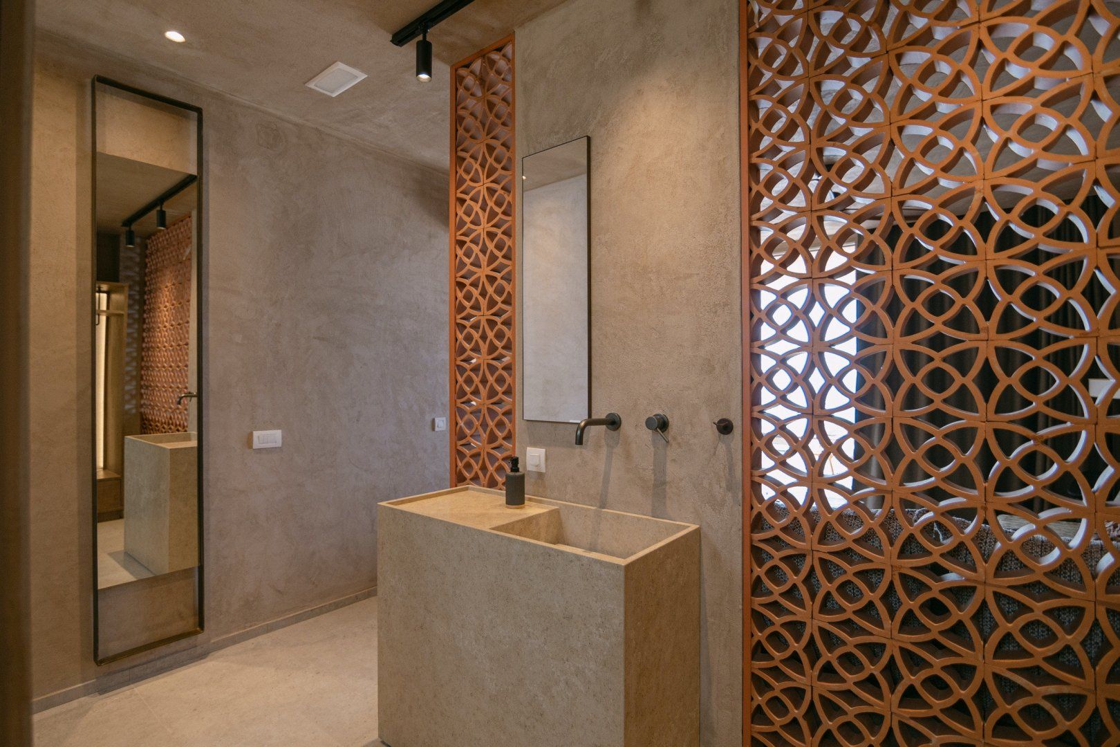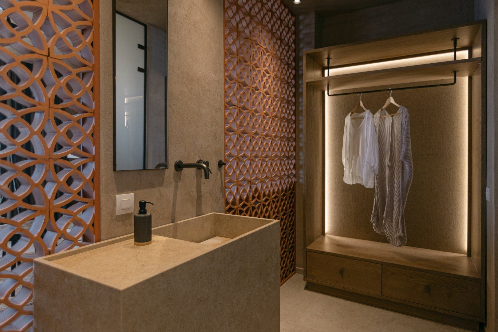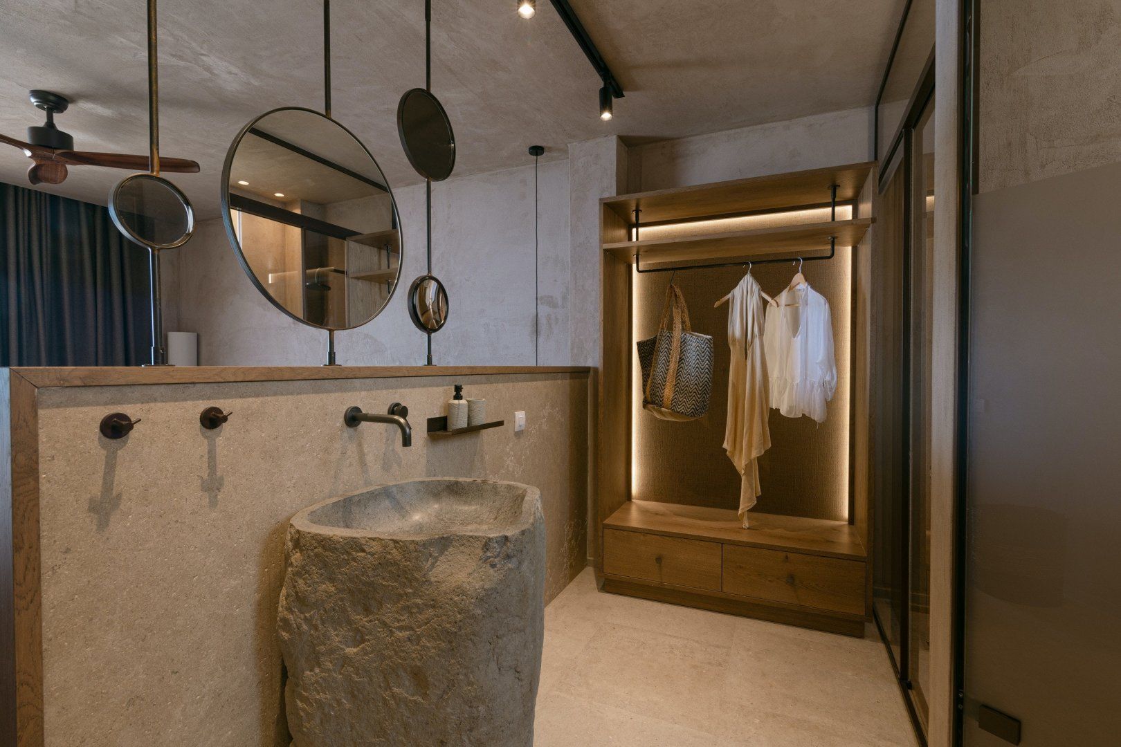 You'll be pleased to know, too, that this home was built in harmony with the natural environment and follows the principles of bioclimatic design, so it almost has zero energy consumption. Inside, the decor is stylish and sleek with its concrete finishes and intricately carved wood panels. The hewn stone sink in the main bedroom's en-suite is a real feature too.