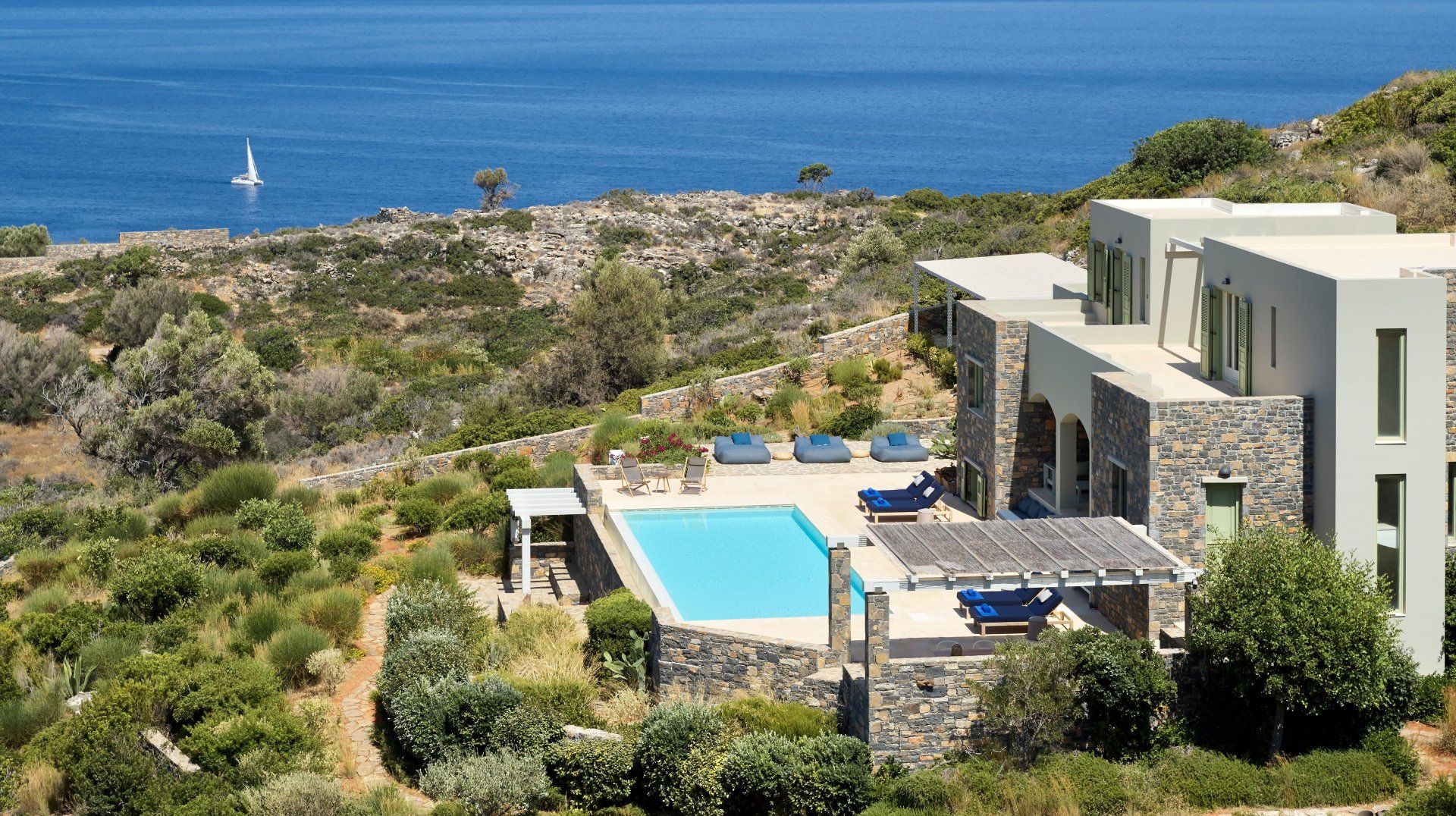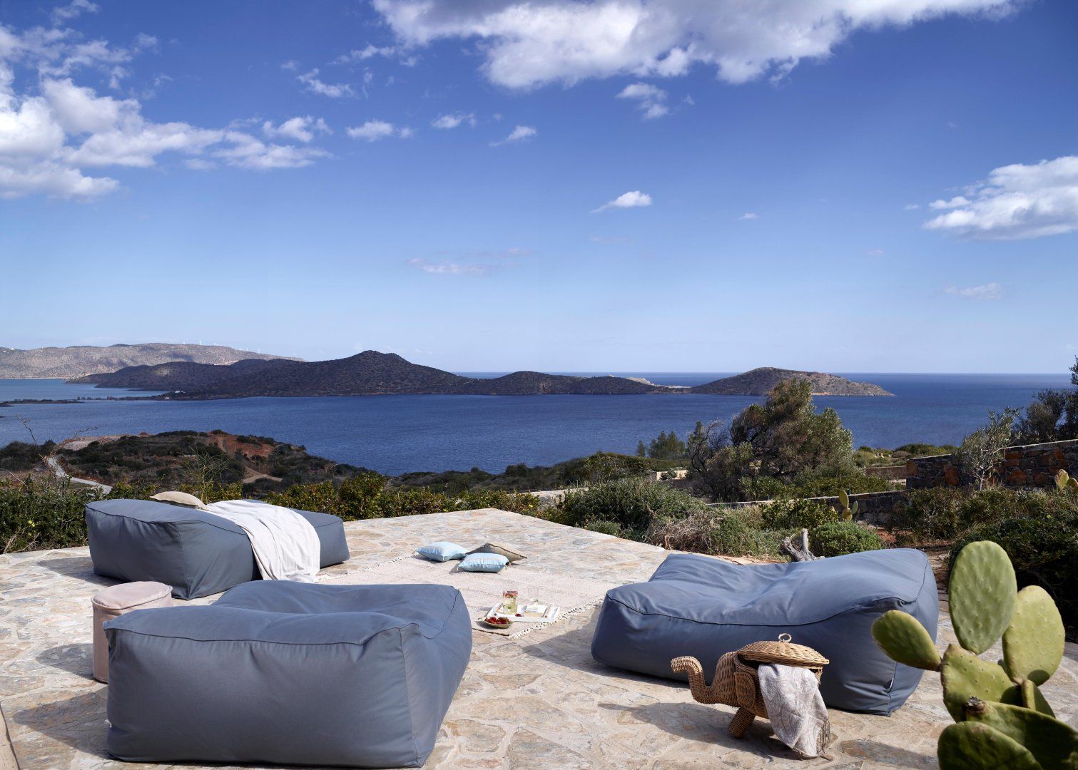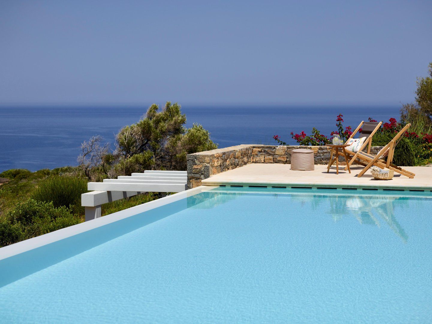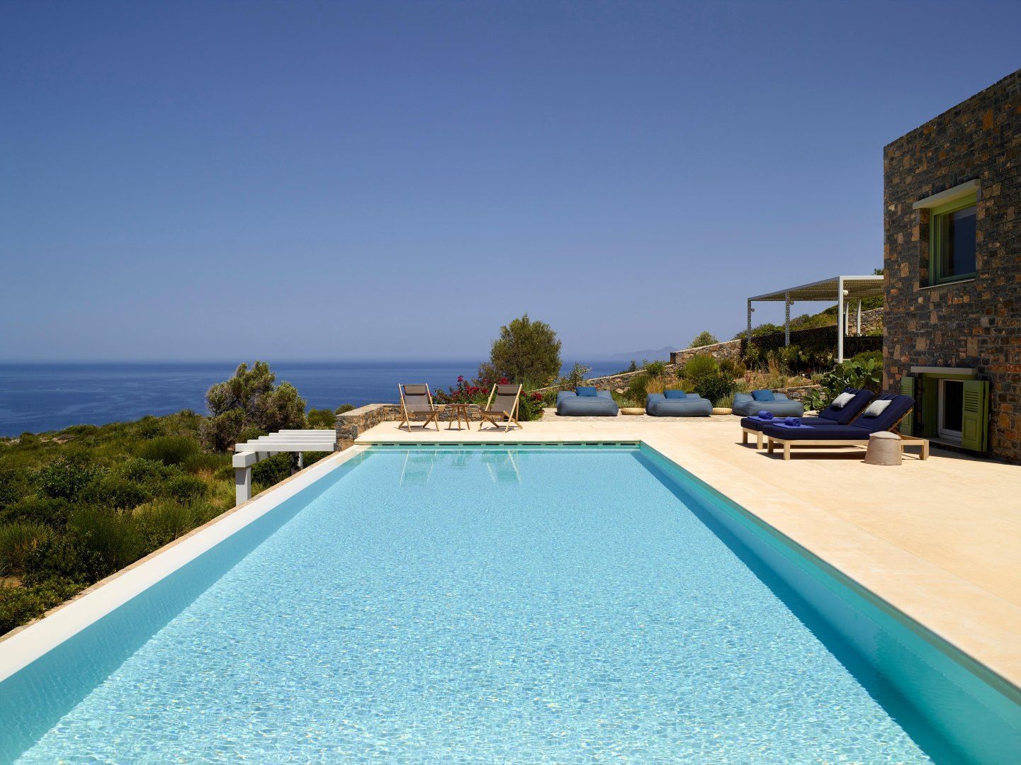 Gardens bloom with olive trees and wildflowers all around the villa. Bag a poolside beanbag lounger to soak up the sun or relax in the shade of the veranda. A banquet-sized dining table provides the alfresco option on the terrace, alongside that fabulous view, so you can watch yachts cut across the ocean as you dine. Perhaps the best place to enjoy the view is from the sun-trap roof terrace, lined with sofas. Pathways through the wild countryside are shared with another villa and lead to secret playparks and hammocks in the trees.