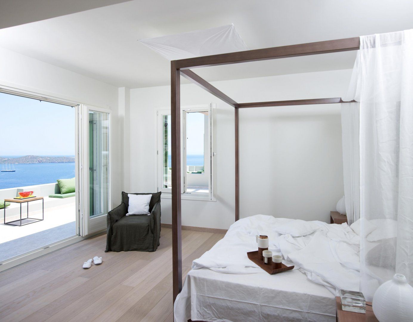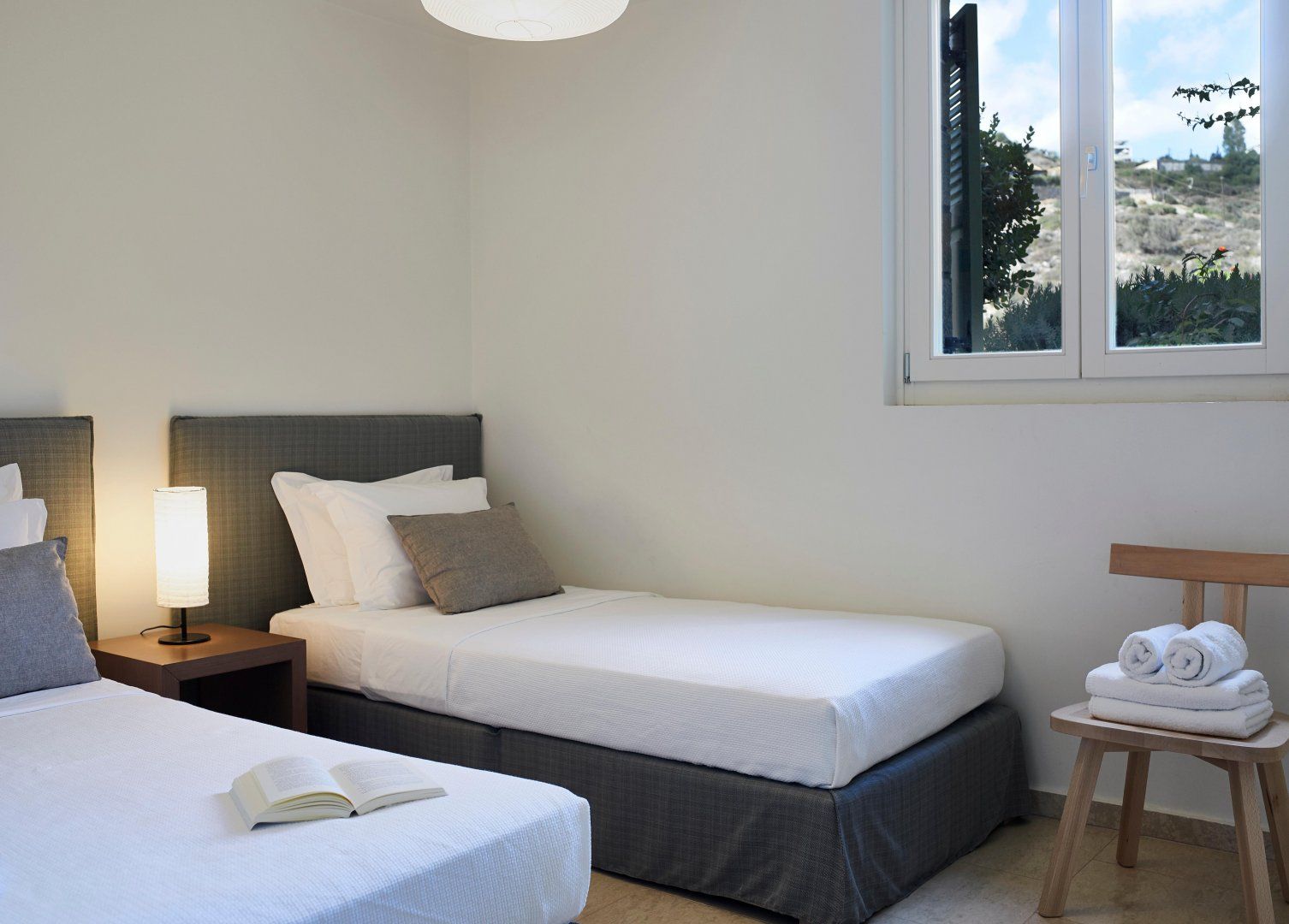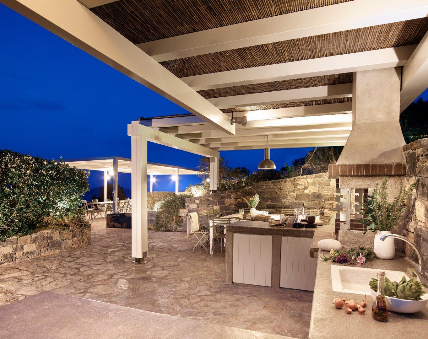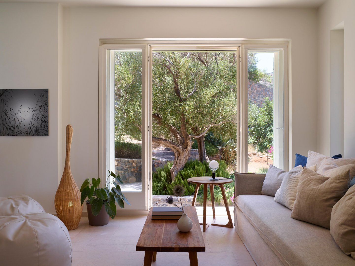 Gardens bloom with olive trees and wildflowers all around the villa. Bag a poolside beanbag lounger to soak up the sun or relax in the shade of the veranda. A banquet-sized dining table provides the alfresco option on the terrace, alongside that fabulous view, so you can watch yachts cut across the ocean as you dine. Perhaps the best place to enjoy the view is from the sun-trap roof terrace, lined with sofas. Pathways through the wild countryside are shared with another villa and lead to secret playparks and hammocks in the trees.