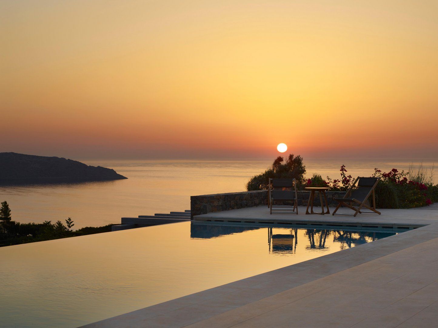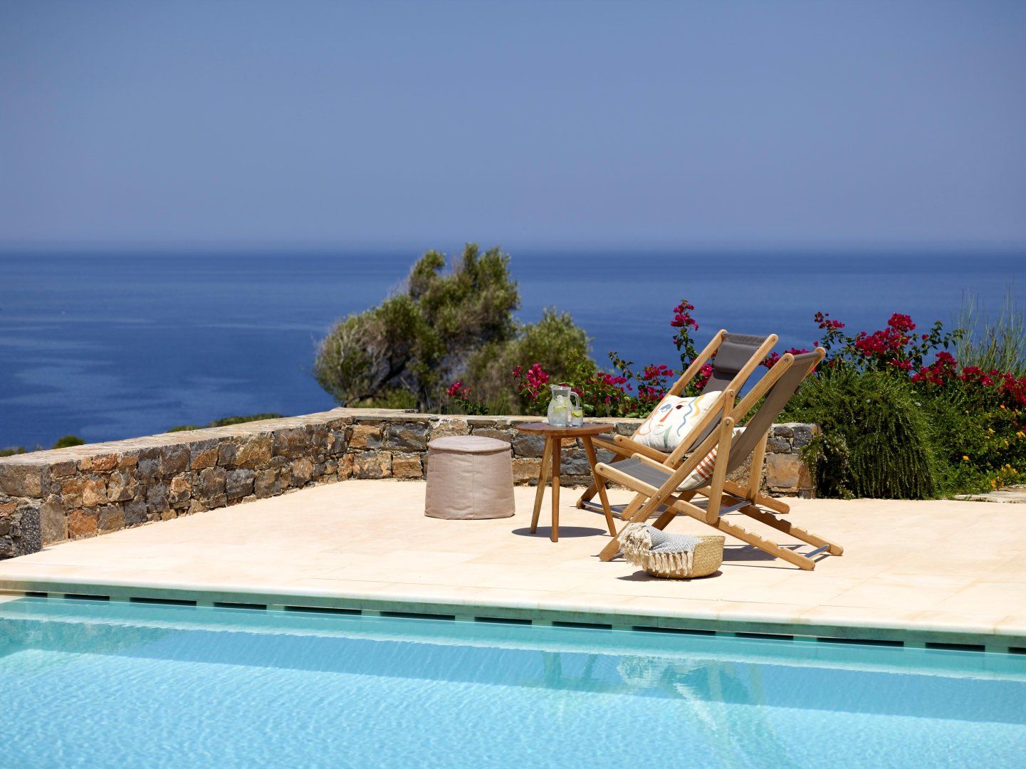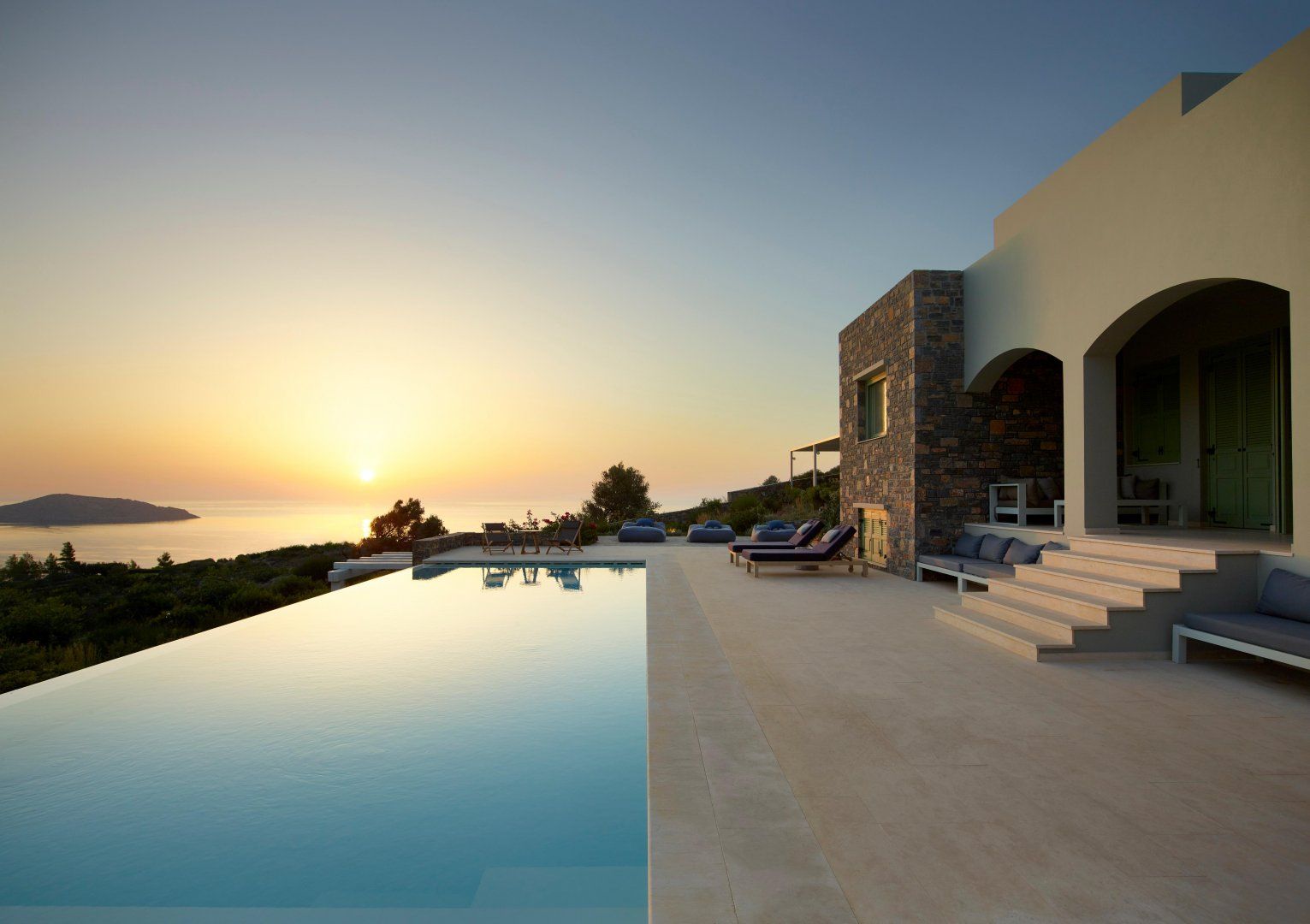 Up on a hilltop overlooking the sea, this stone villa has views as far as the eye can see. Three kilometres from the town of Elounda and facing east, at the end of the day you’ve got an unparalleled view of the sun setting over the water. Head into the charming harbour town of Agios Nikolaos, a ten-minute drive away, for an evening of shopping, tavernas or perhaps a day chartering a boat.