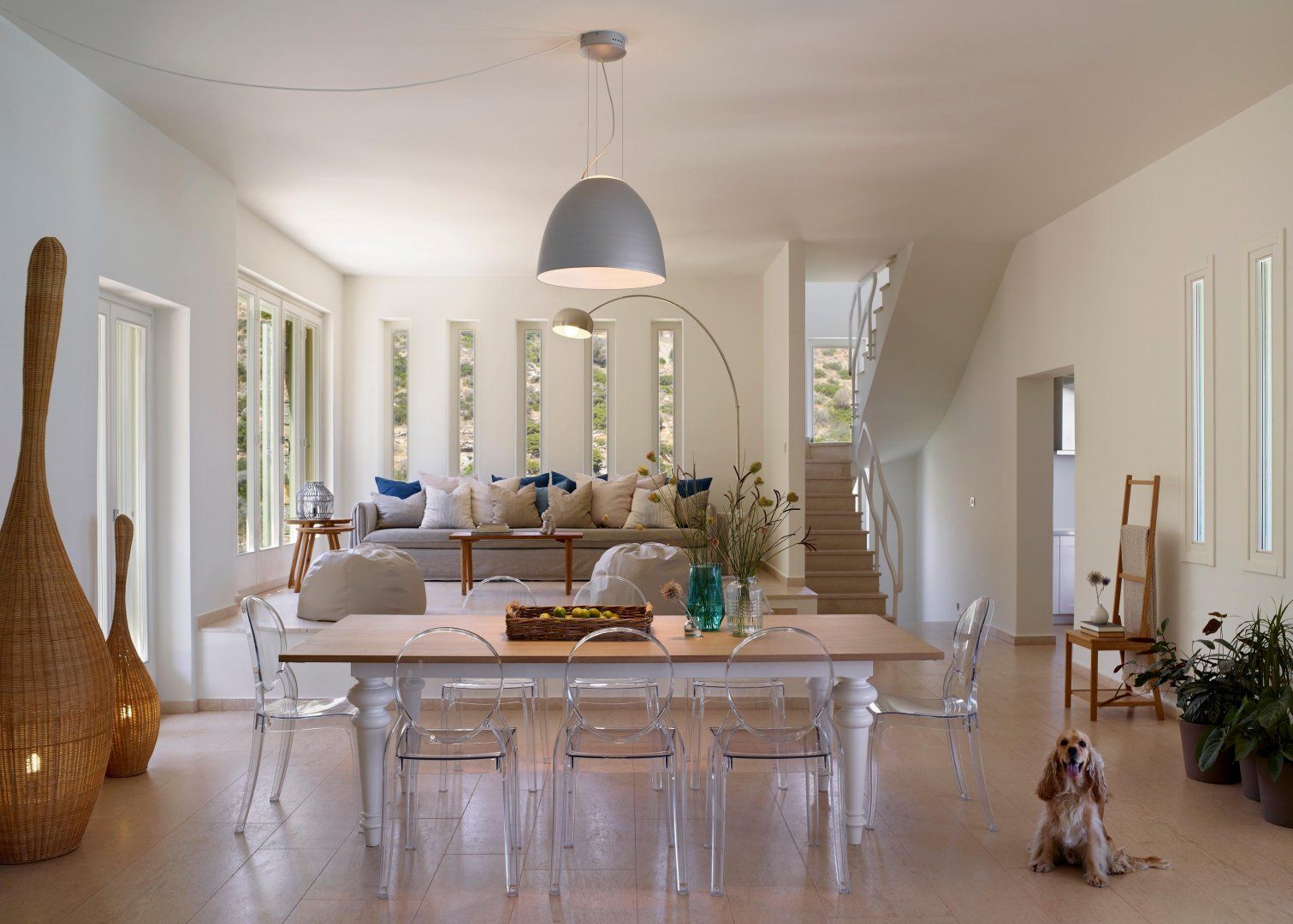 Inside, it’s calm and white with boho touches like big wicker lamps and wildflowers in vases. The main living room is flooded with sunlight from floor-to-ceiling windows and a second living room is centred around an old-style fireplace with candles glowing. A Scandi-chic desk sits on a raised area should you need to work remotely and there’s a home gym and games rooms for fitness and leisure.