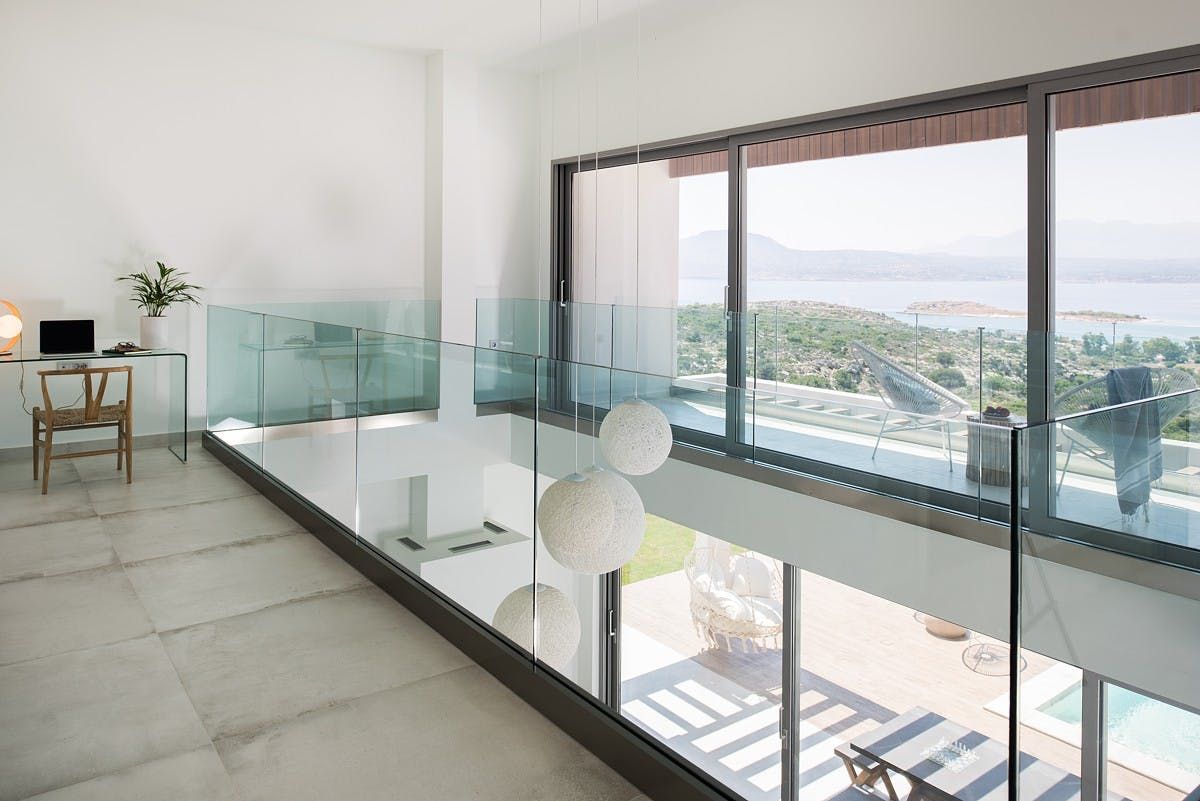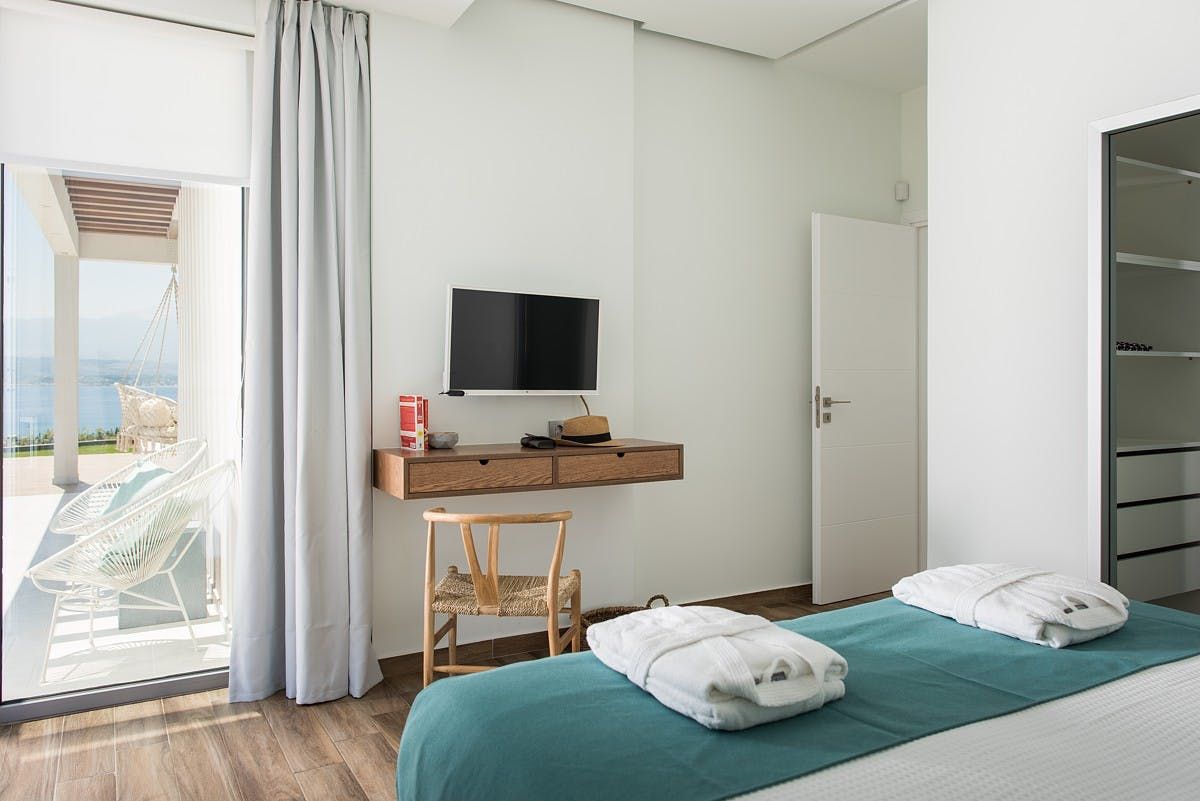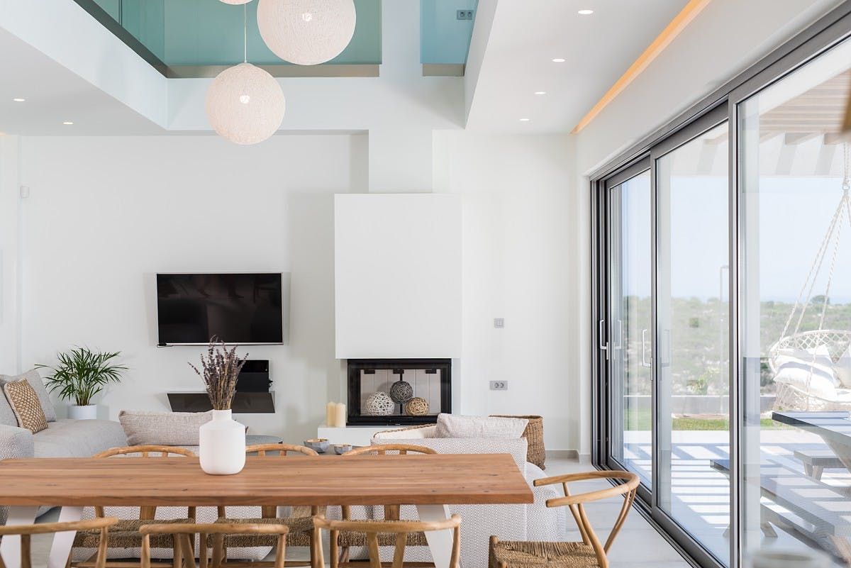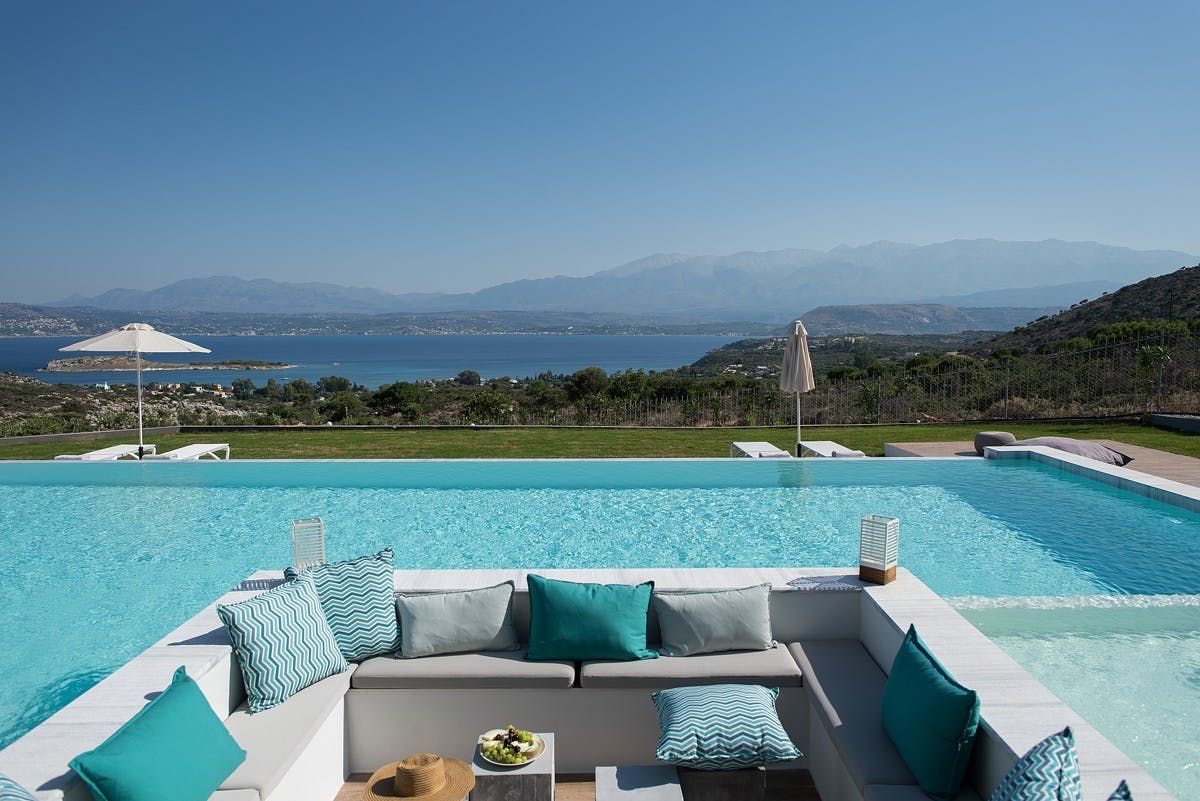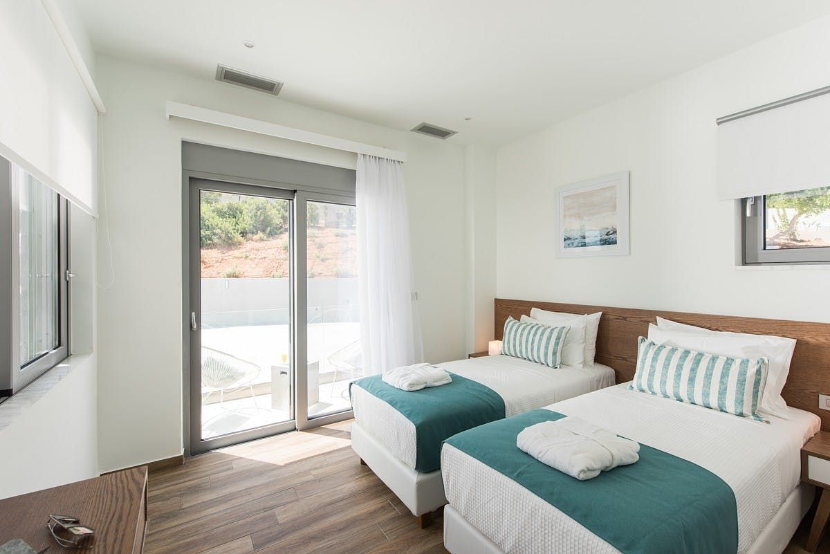 The villa retains a calming ambience throughout, with a soft colour scheme of grey, white and splashes of aqua. Slide open the glass doors in the bright living space to let the ocean air waft in as you lounge on the L-shaped sofa. In the evenings, gather around the eight-person dining table to enjoy a traditional Greek meze – your host can arrange for a private chef to take the cooking off your hands.