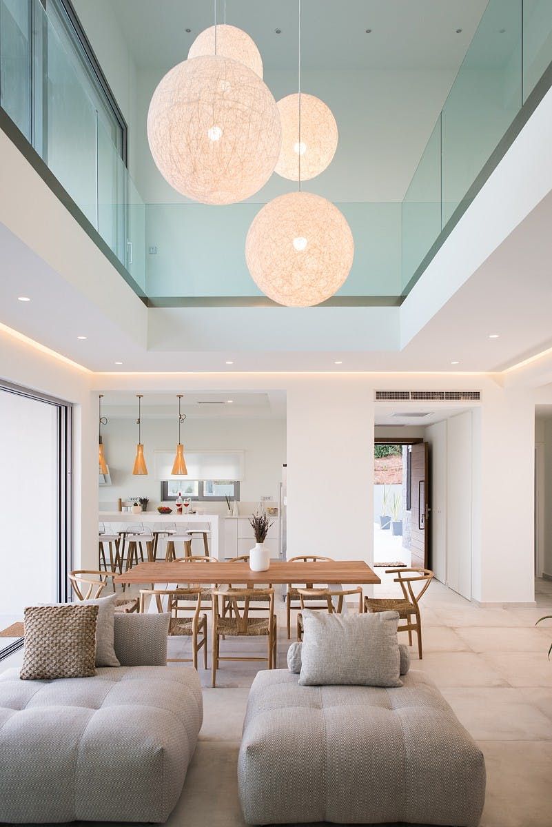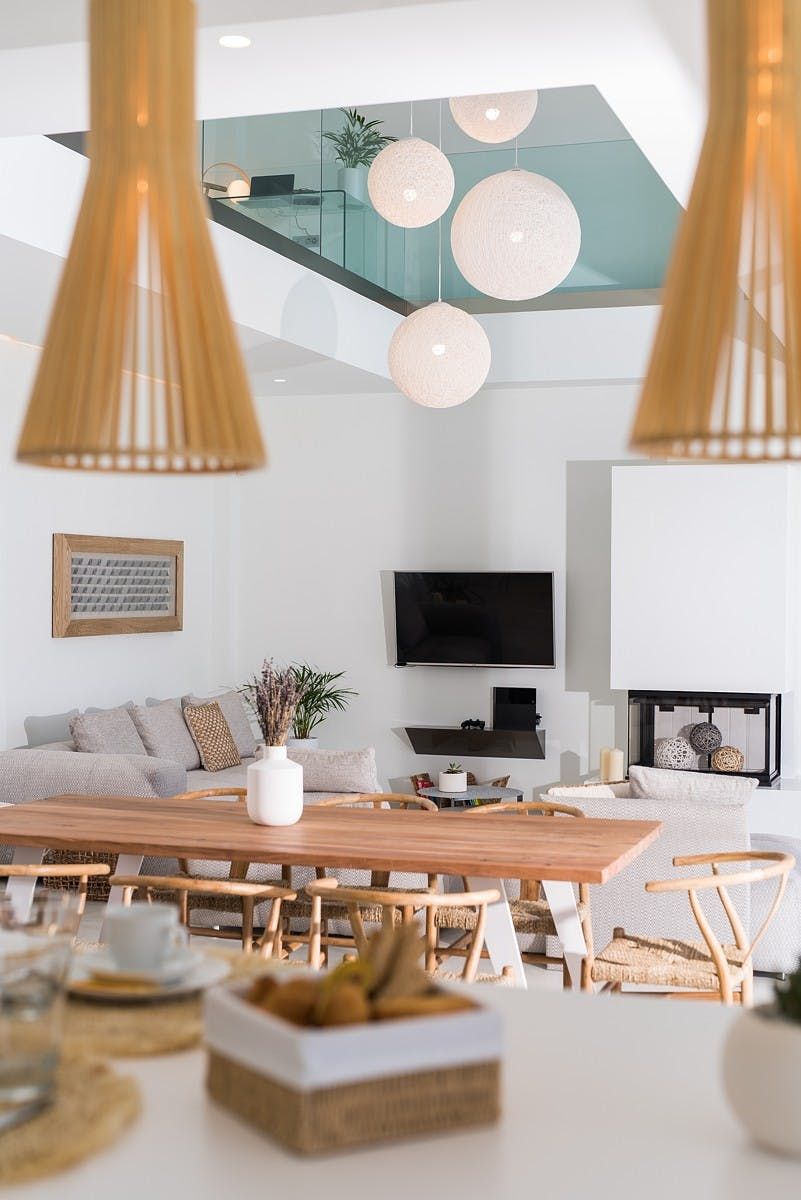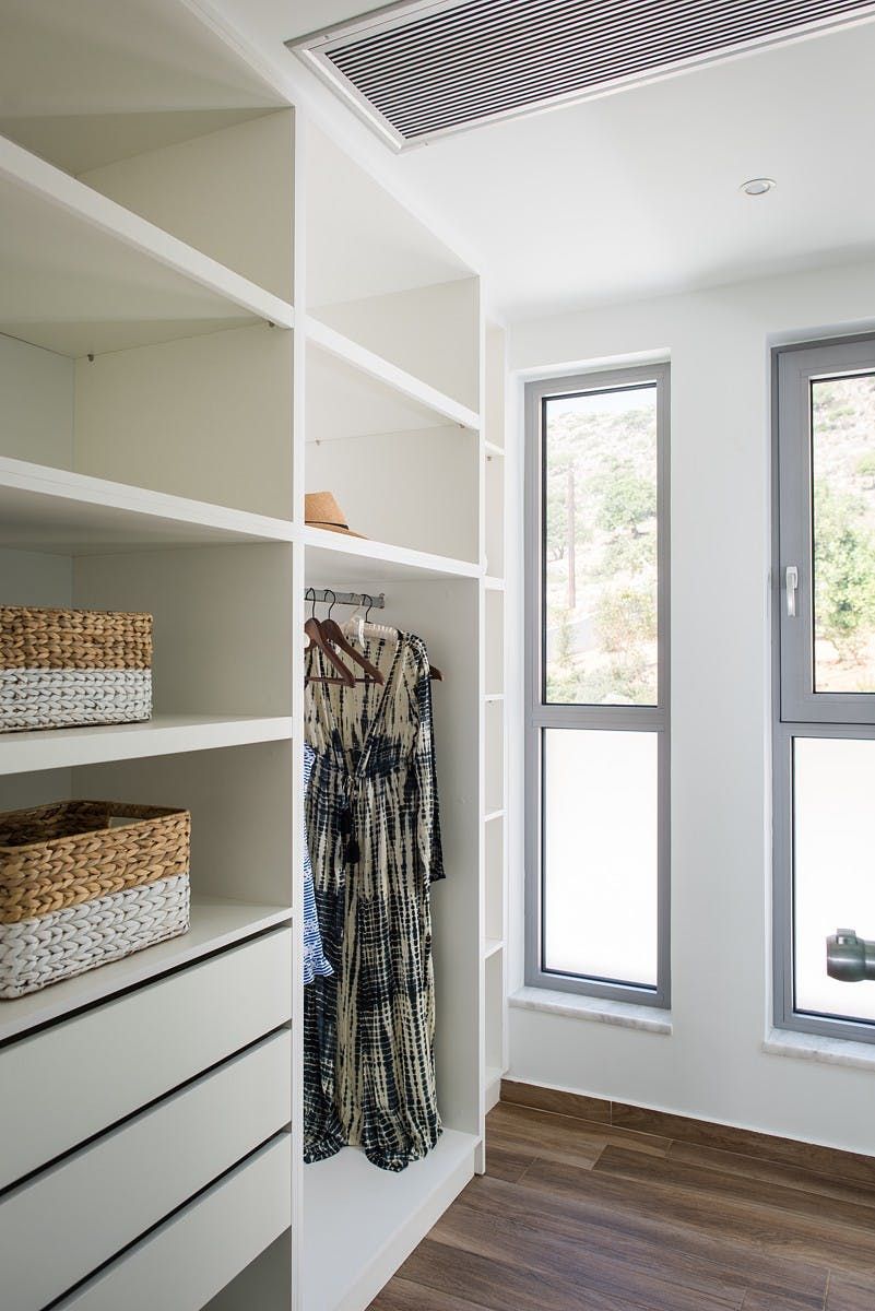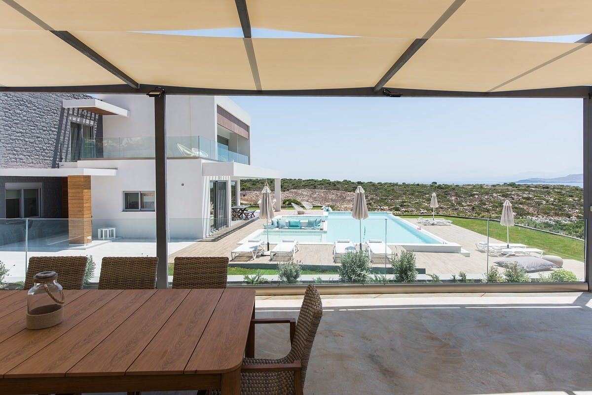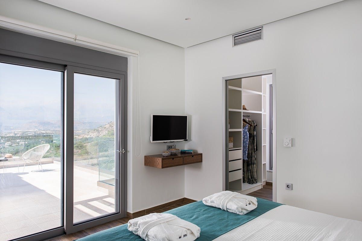 The villa retains a calming ambience throughout, with a soft colour scheme of grey, white and splashes of aqua. Slide open the glass doors in the bright living space to let the ocean air waft in as you lounge on the L-shaped sofa. In the evenings, gather around the eight-person dining table to enjoy a traditional Greek meze – your host can arrange for a private chef to take the cooking off your hands.