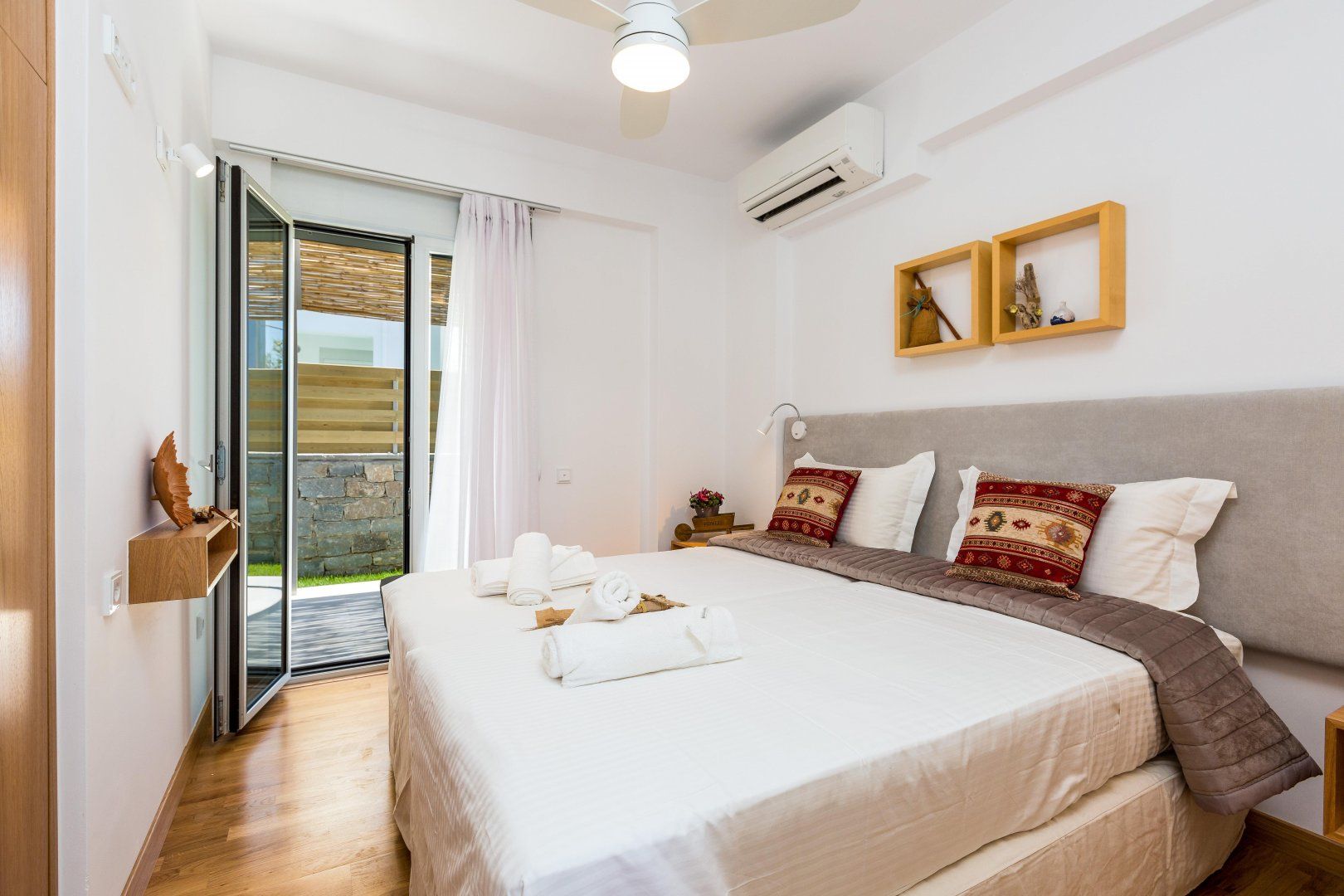 One of four brand-new villas, this luxurious home is an excellent choice of holiday home for family or friends. It’s in a beautiful spot in peaceful Pigianos Kampos, with a private fenced garden and access to a private beach just 50 metres away.