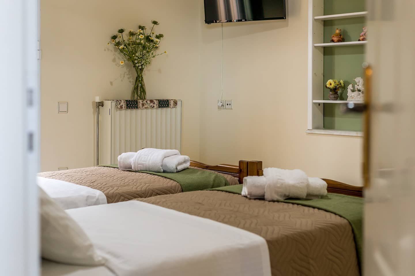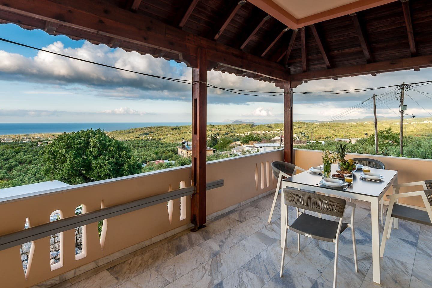 If you’re not cooling off from the Crete sun in the swimming pool, our favourite spot is the table and chairs on the covered veranda, facing a panorama of Crete’s stunning coastline. This is a great spot to dine of an evening. Inside, the home is split between two apartments, each with its own kitchen and living room. On the first floor, the living room is a grand space with marble floor, candelabra and velvety tufted sofas. Two full kitchens across the whole home mean it’s easy to cater for huge group meals and two living rooms give everyone enough space to spread out. The peace and quiet are blissful in bedrooms and each room has its own access to the terrace or a first-floor balcony.