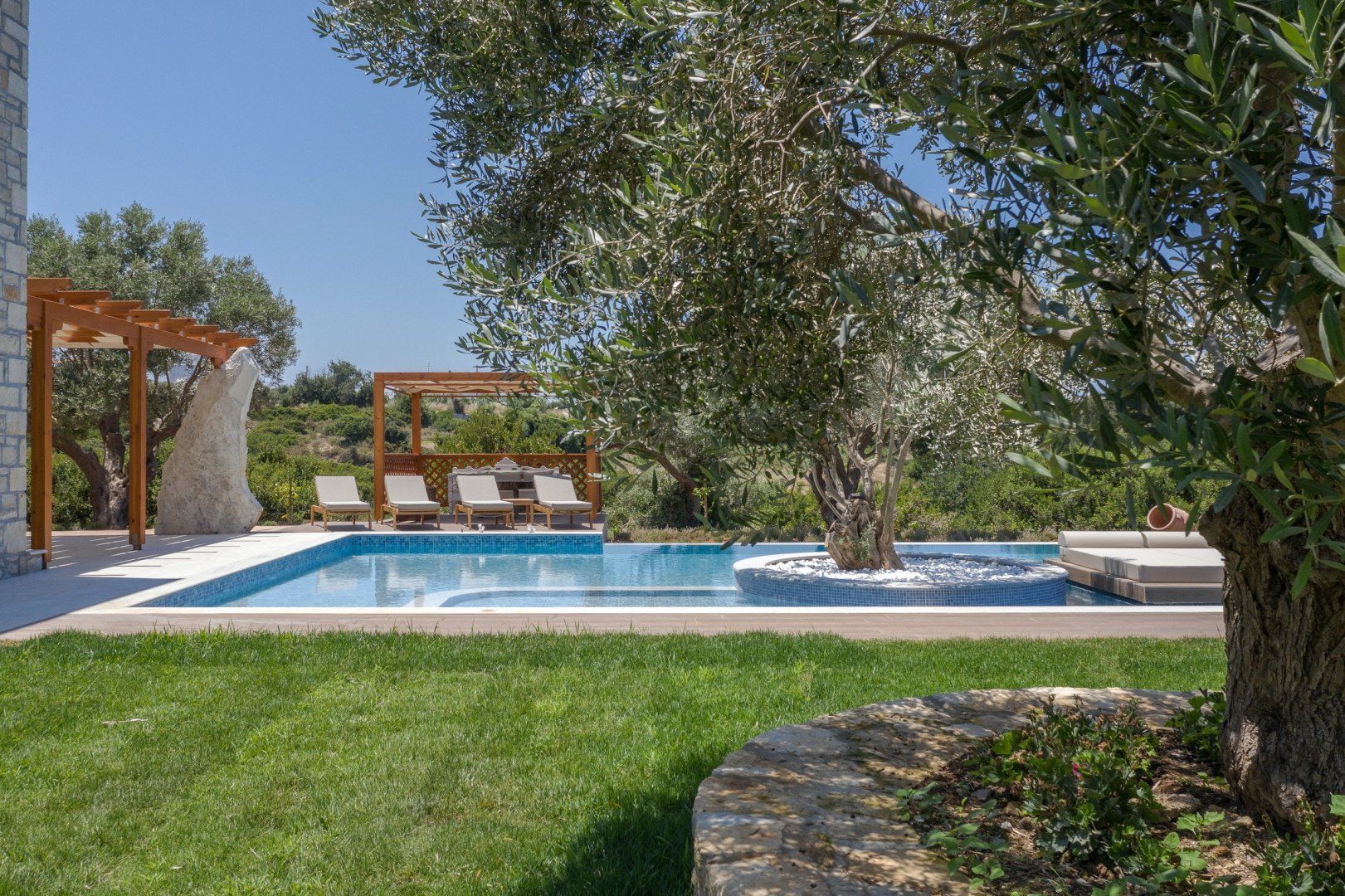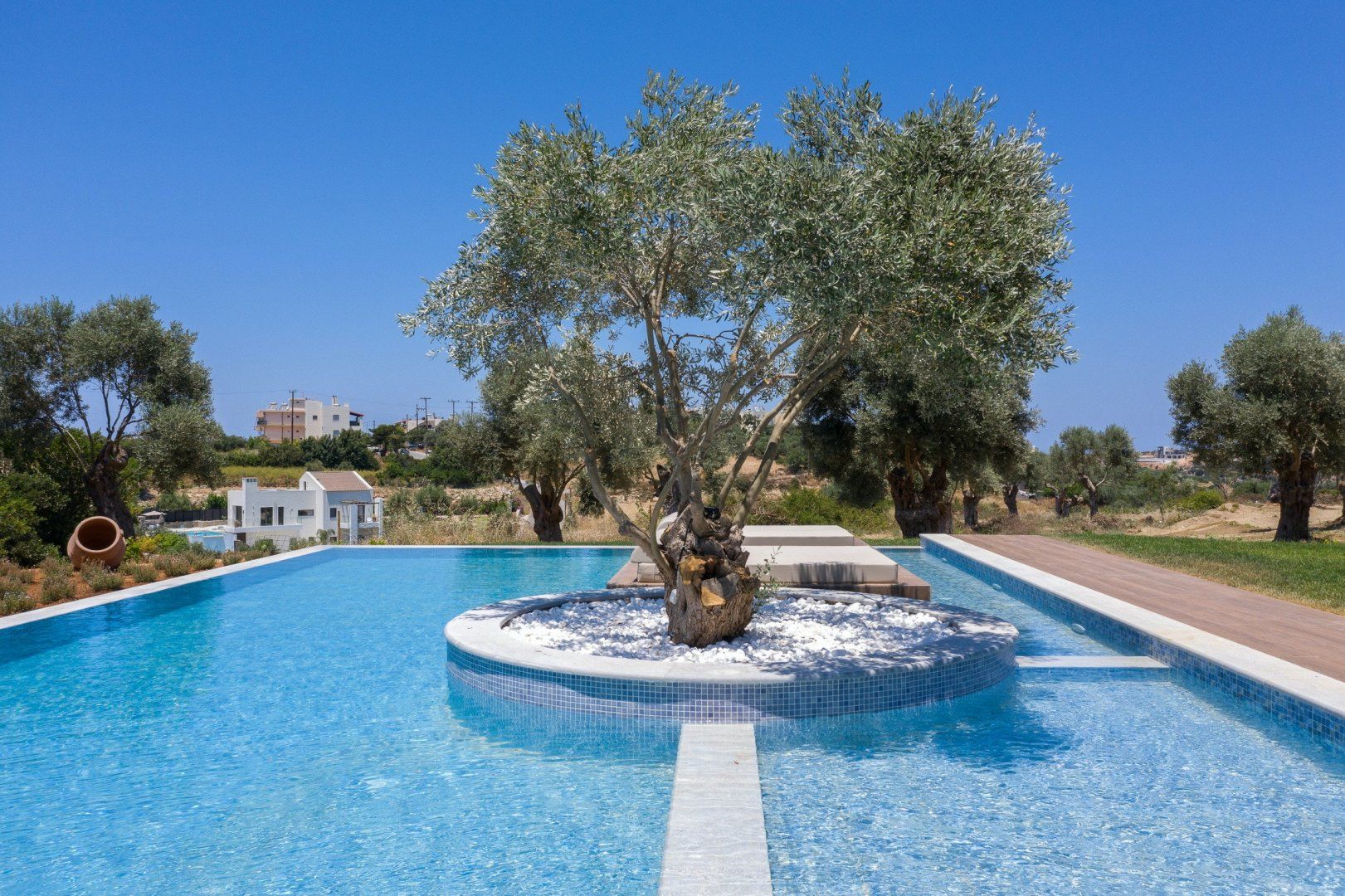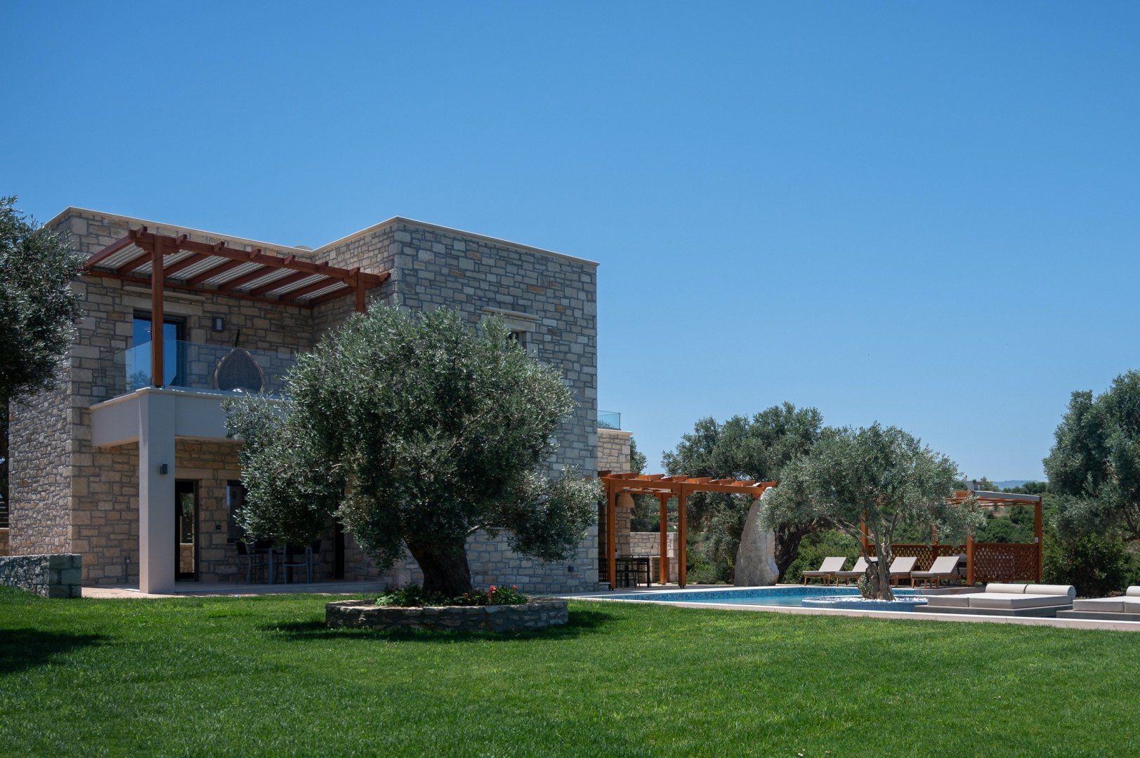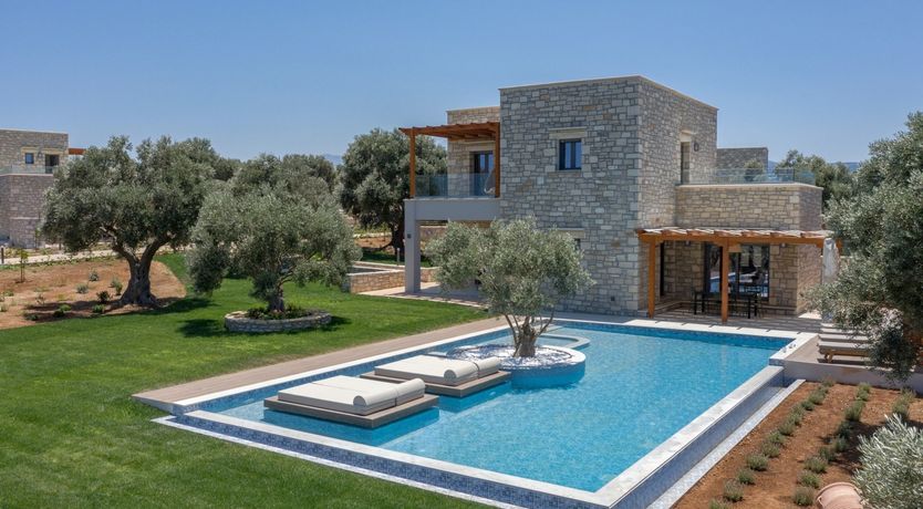 This strikingly beautiful home is a luxurious Crete hideaway, surrounded by olive trees and manicured lawns. Outdoors, you can allow your troubles to melt away as you relax on the floating island sun beds. Grab your sunscreen and a good book to enjoy an afternoon soaking up the sunshine. If you aren’t sure what’s tickling your tastebuds for dinner, take some inspiration from the herb garden, vegetable patch and fruit trees, all waiting to help you create a delicious meal. When you are ready to rest your eyes, enjoy the serene feel of the bedroom decor. Neutral colours, golden accents and cosy bed runners ensure you can enjoy a restful night's sleep.