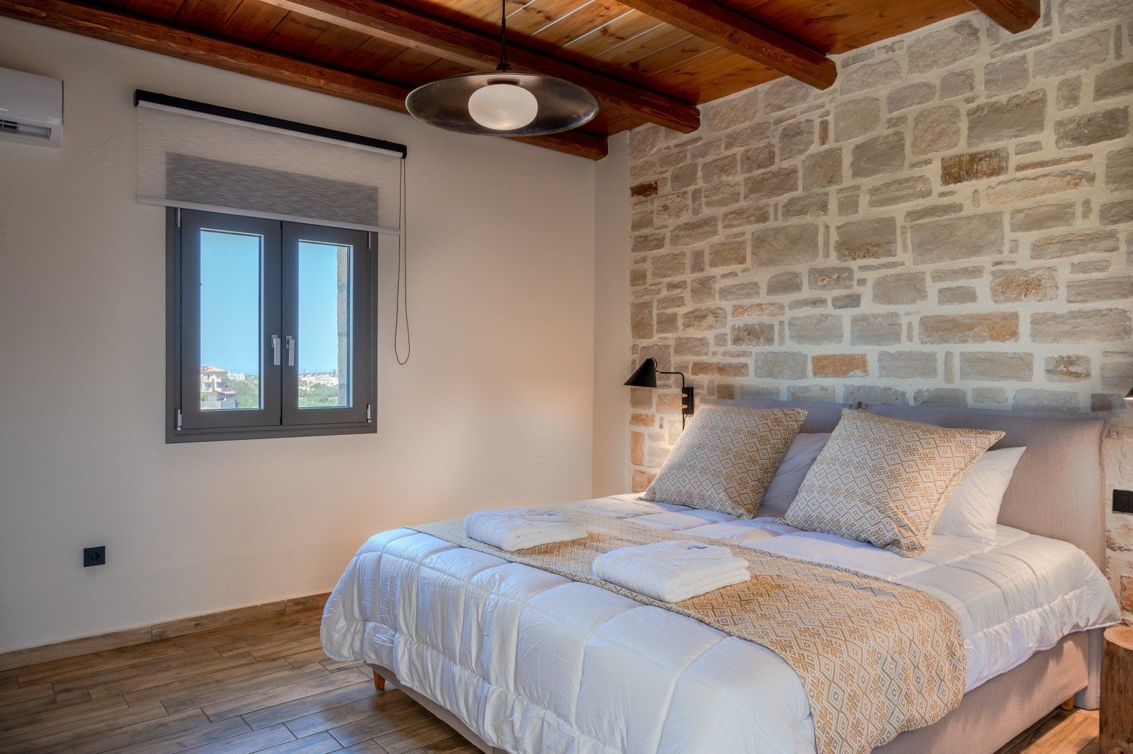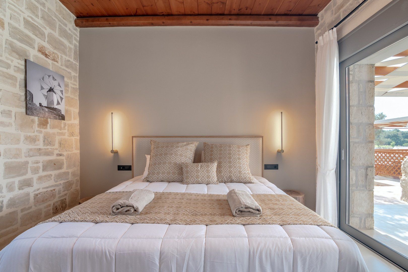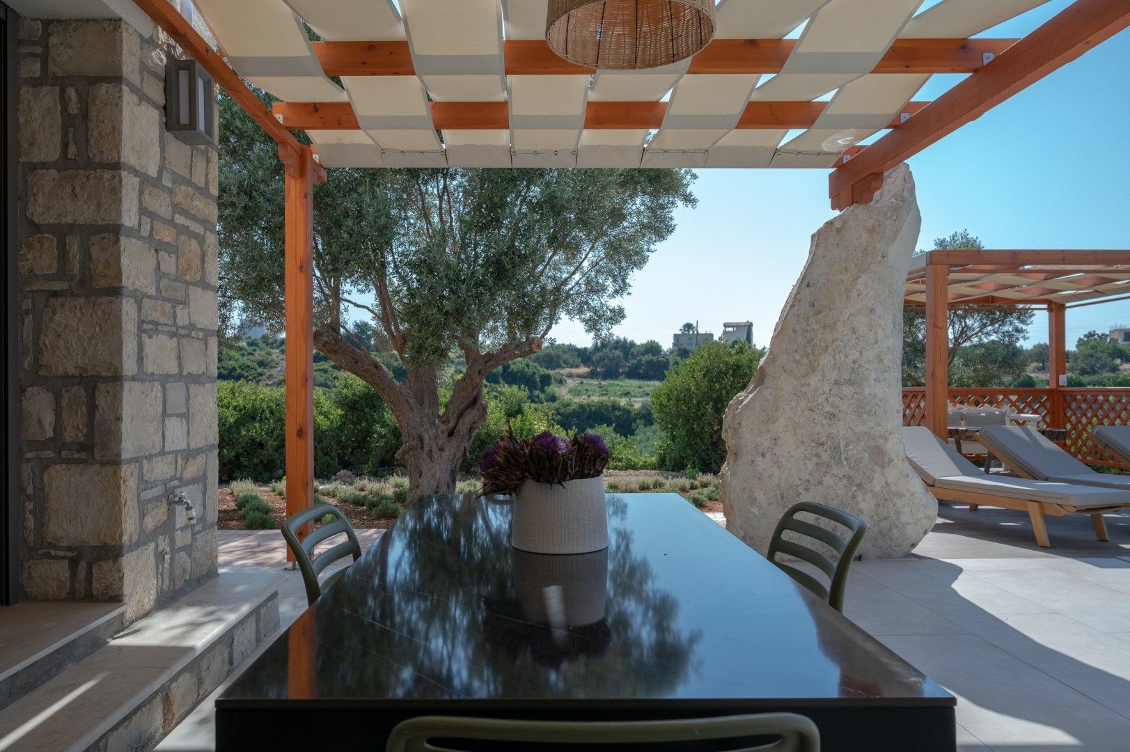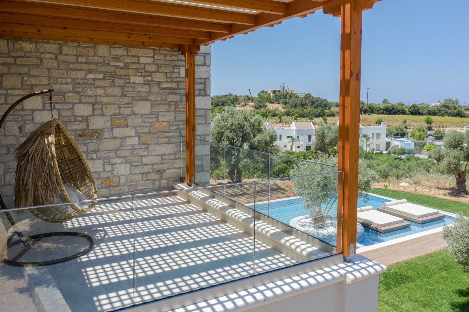 This strikingly beautiful home is a luxurious Crete hideaway, surrounded by olive trees and manicured lawns. Outdoors, you can allow your troubles to melt away as you relax on the floating island sun beds. Grab your sunscreen and a good book to enjoy an afternoon soaking up the sunshine. If you aren’t sure what’s tickling your tastebuds for dinner, take some inspiration from the herb garden, vegetable patch and fruit trees, all waiting to help you create a delicious meal. When you are ready to rest your eyes, enjoy the serene feel of the bedroom decor. Neutral colours, golden accents and cosy bed runners ensure you can enjoy a restful night's sleep.