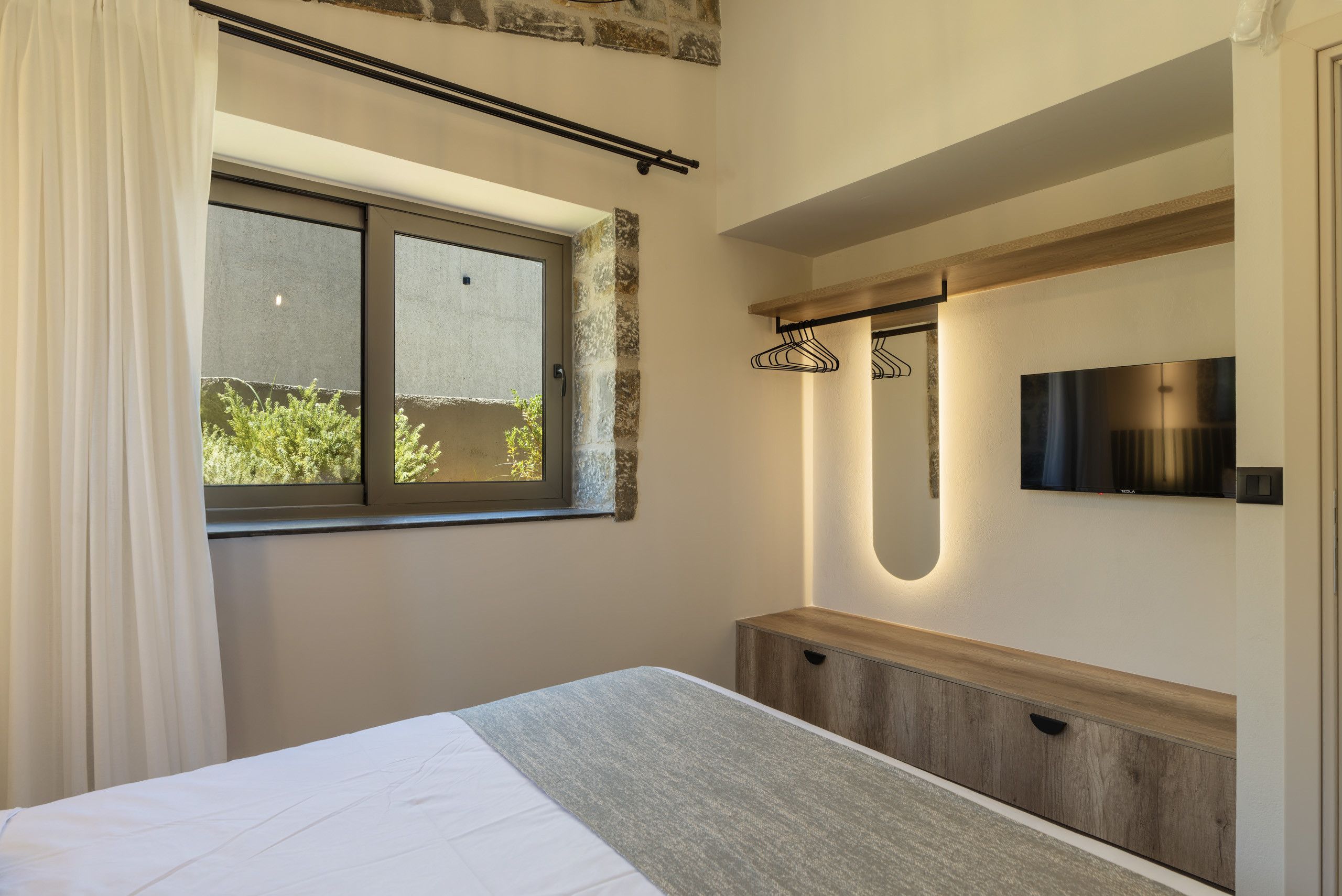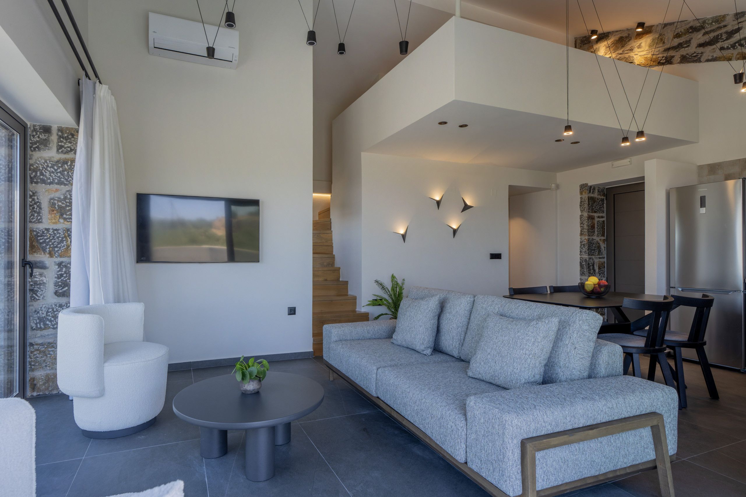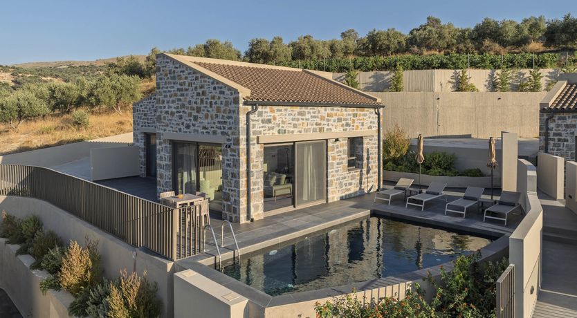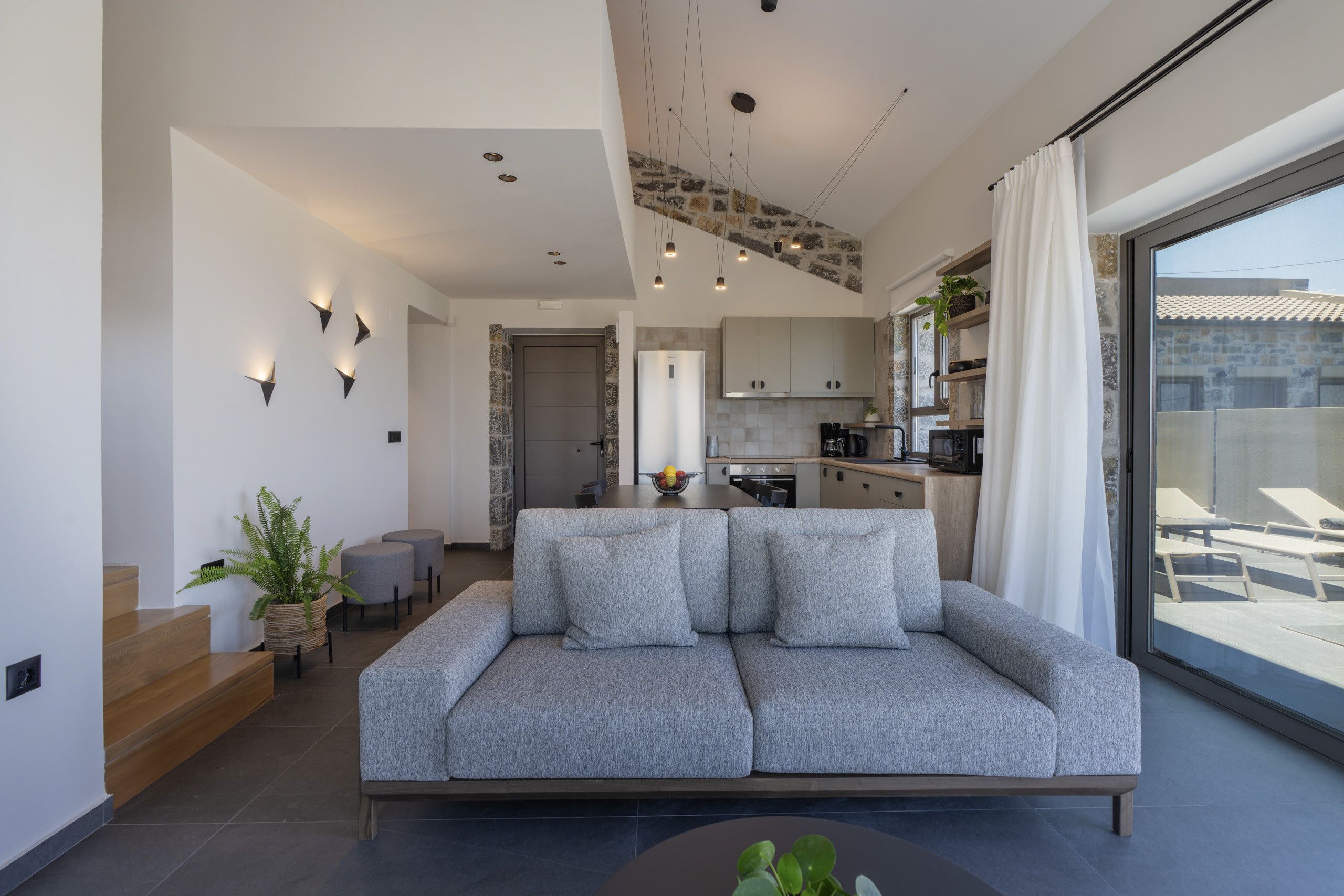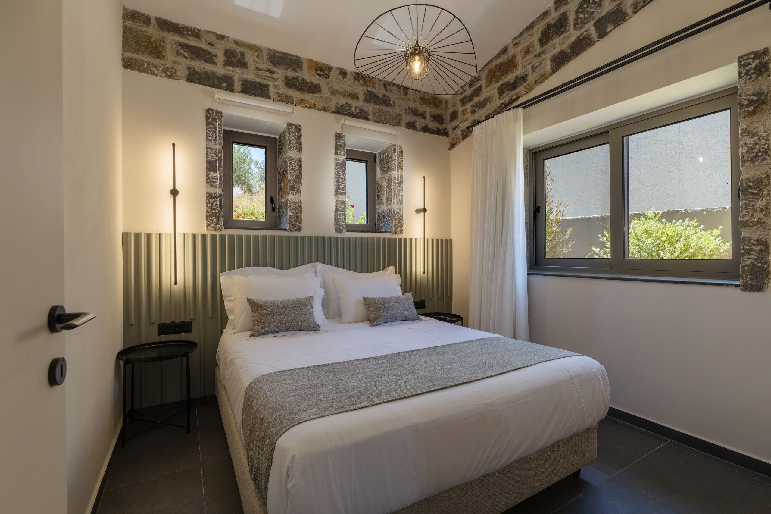 Just outside of Rethymnon, this stone villa is hugged by olive groves and looks out across the Aegean Sea. We think it’s perfect for a small group of friends or a family vacation, though one of the rooms is a loft, so full privacy may be limited. It’s an ideal base for both city and country, with Rethymnon a fifteen-minute drive away and some of Crete’s best beaches and hiking spots, like Platanes Beach and Patsos Gorge, within easy reach.